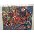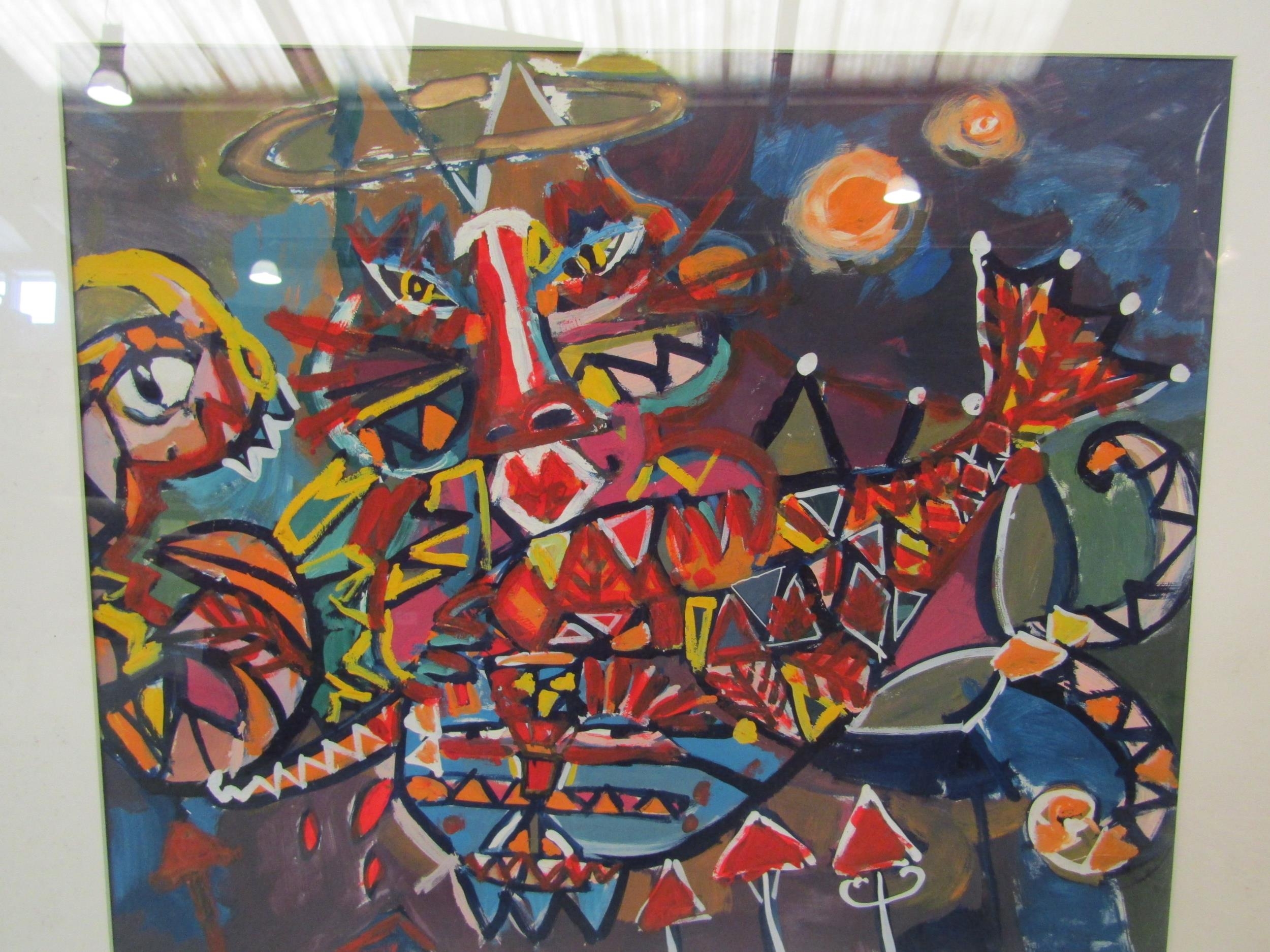 An abstract image of a cat and fish, framed and glazed, 49cm x 60cm image size