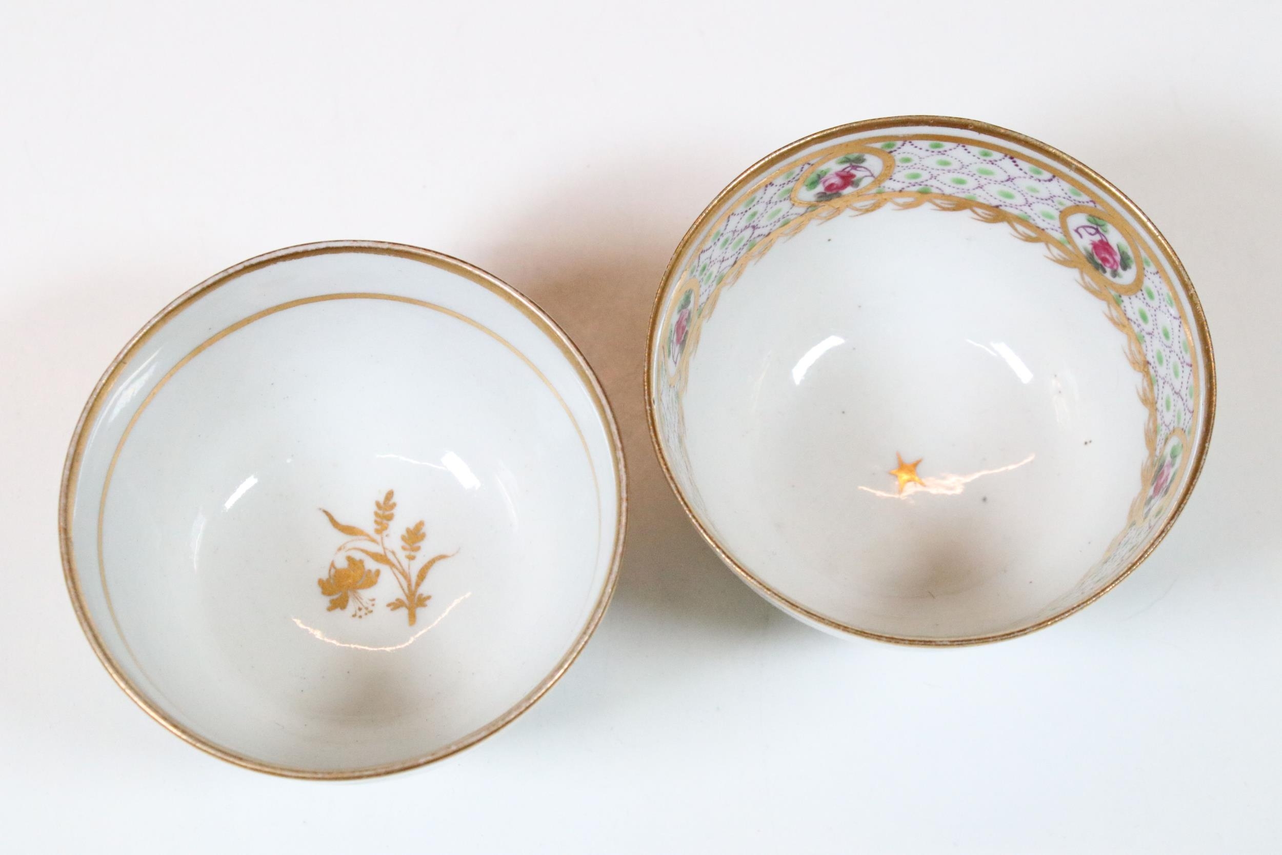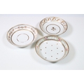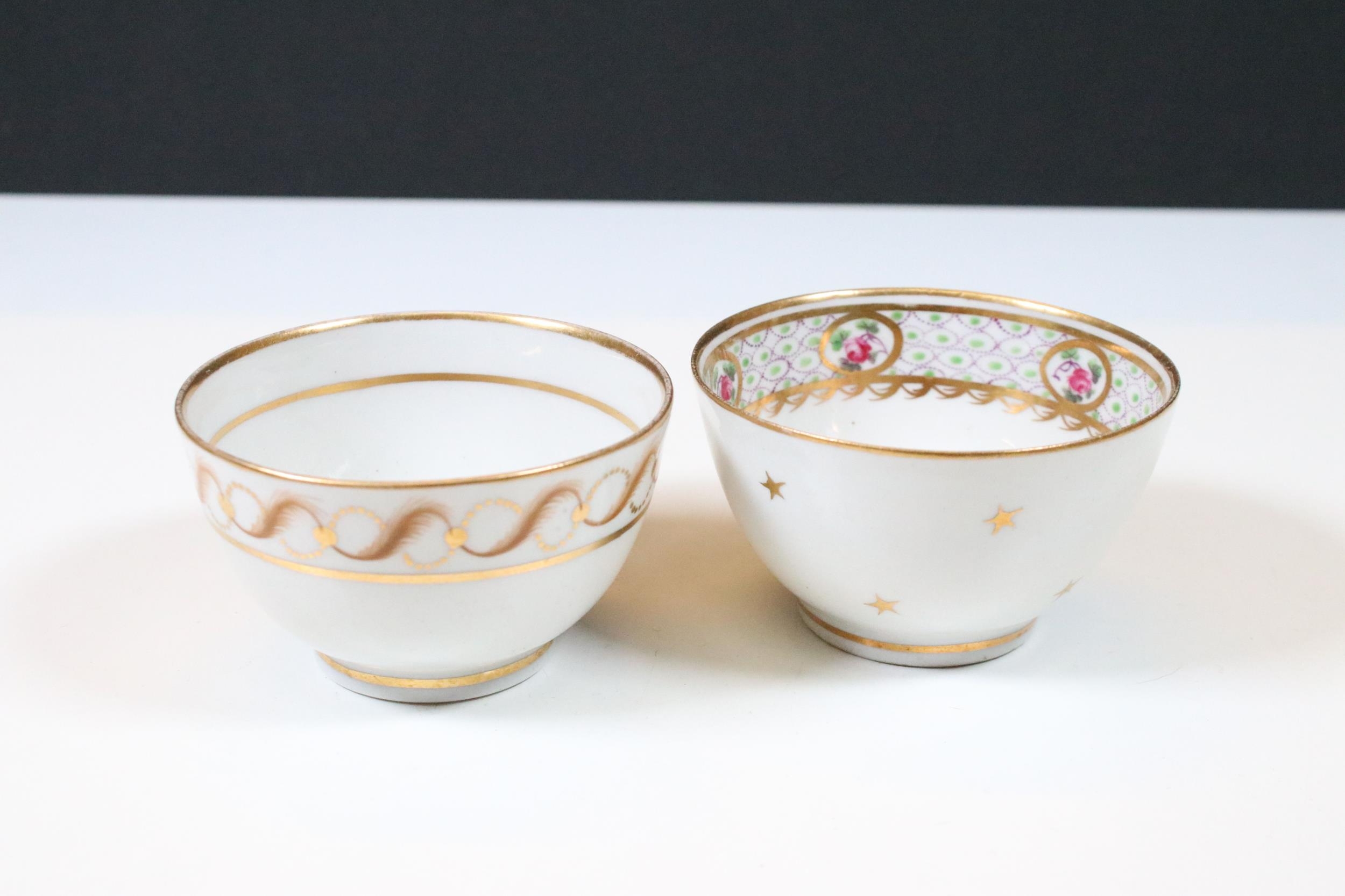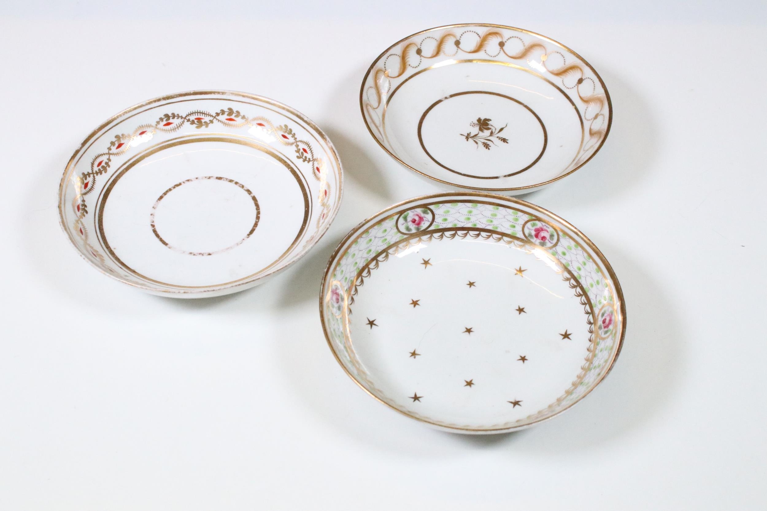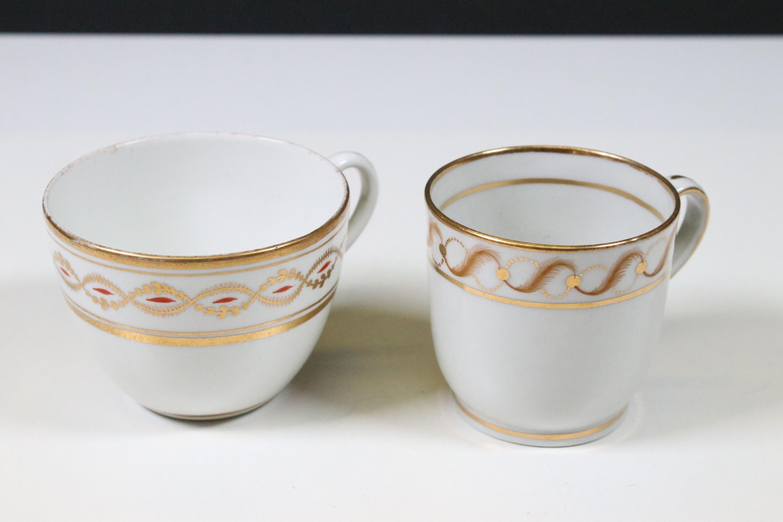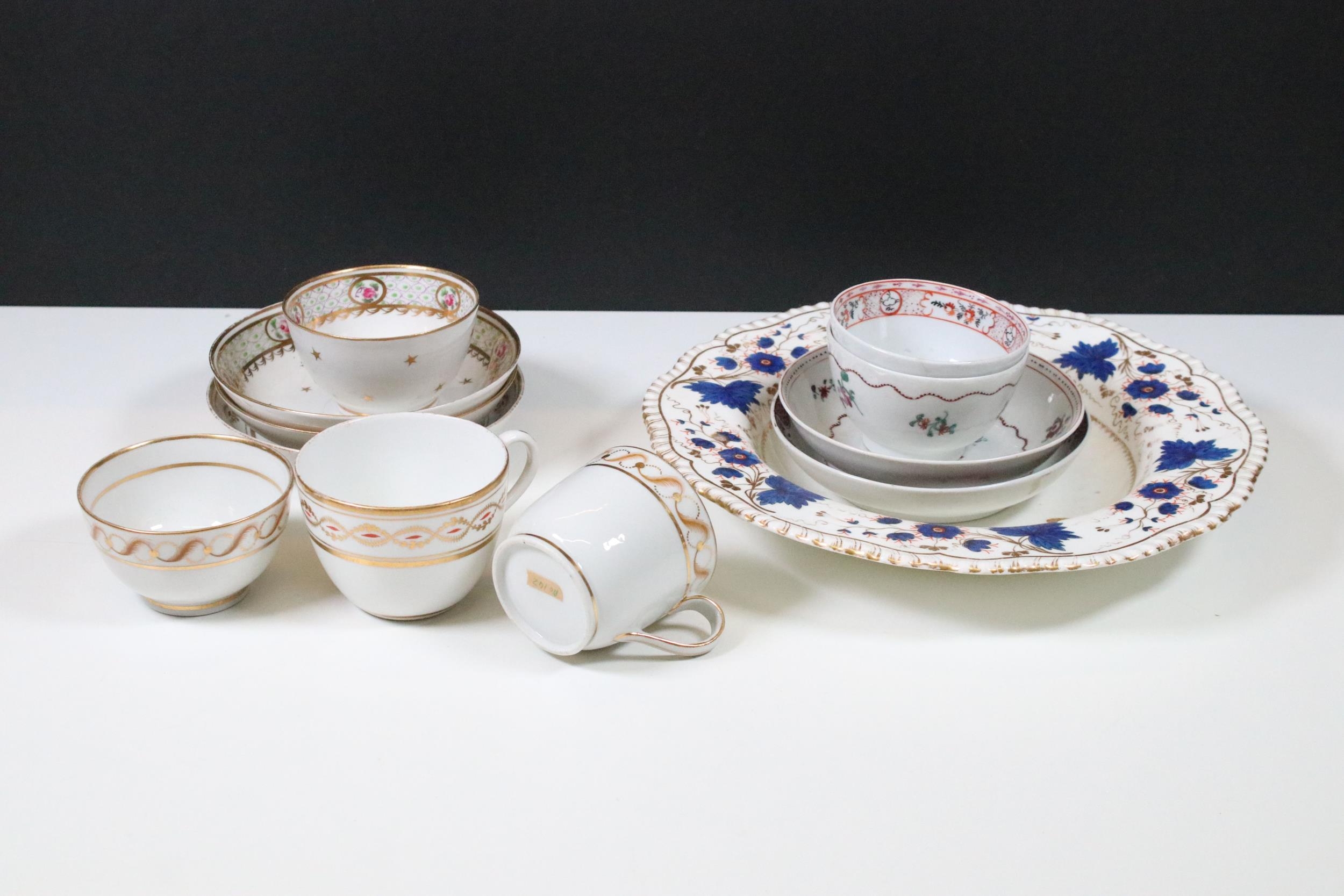 Collection of New Hall ceramics to include gilt pattern coffee and tea set including 1 x teacup and saucer, 1 x coffee can and saucer with bowl, tea bowl and plate with gilt and flower decoration, etc, plus a Coalport plate with blue flower and gilt decoration