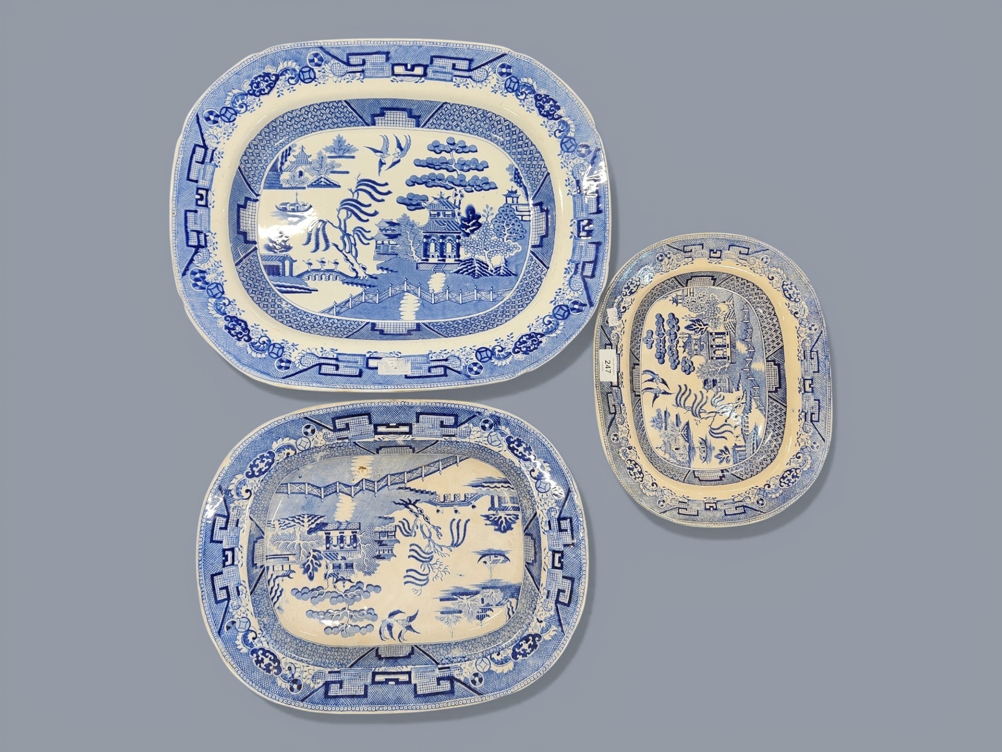 3 LARGE BLUE AND WHITE PLATTERS