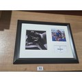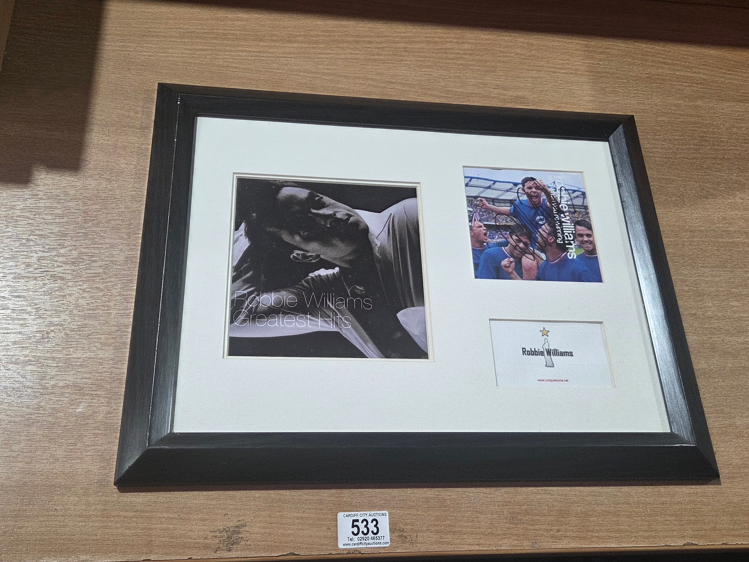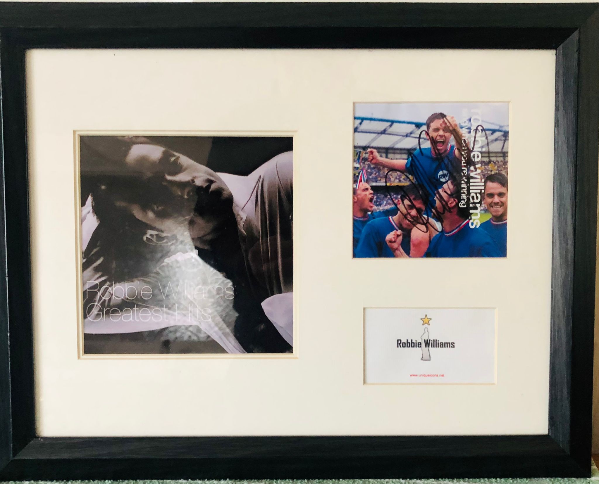 A framed signed photograph - signed by singer Robbie Williams with certificate of authenticity