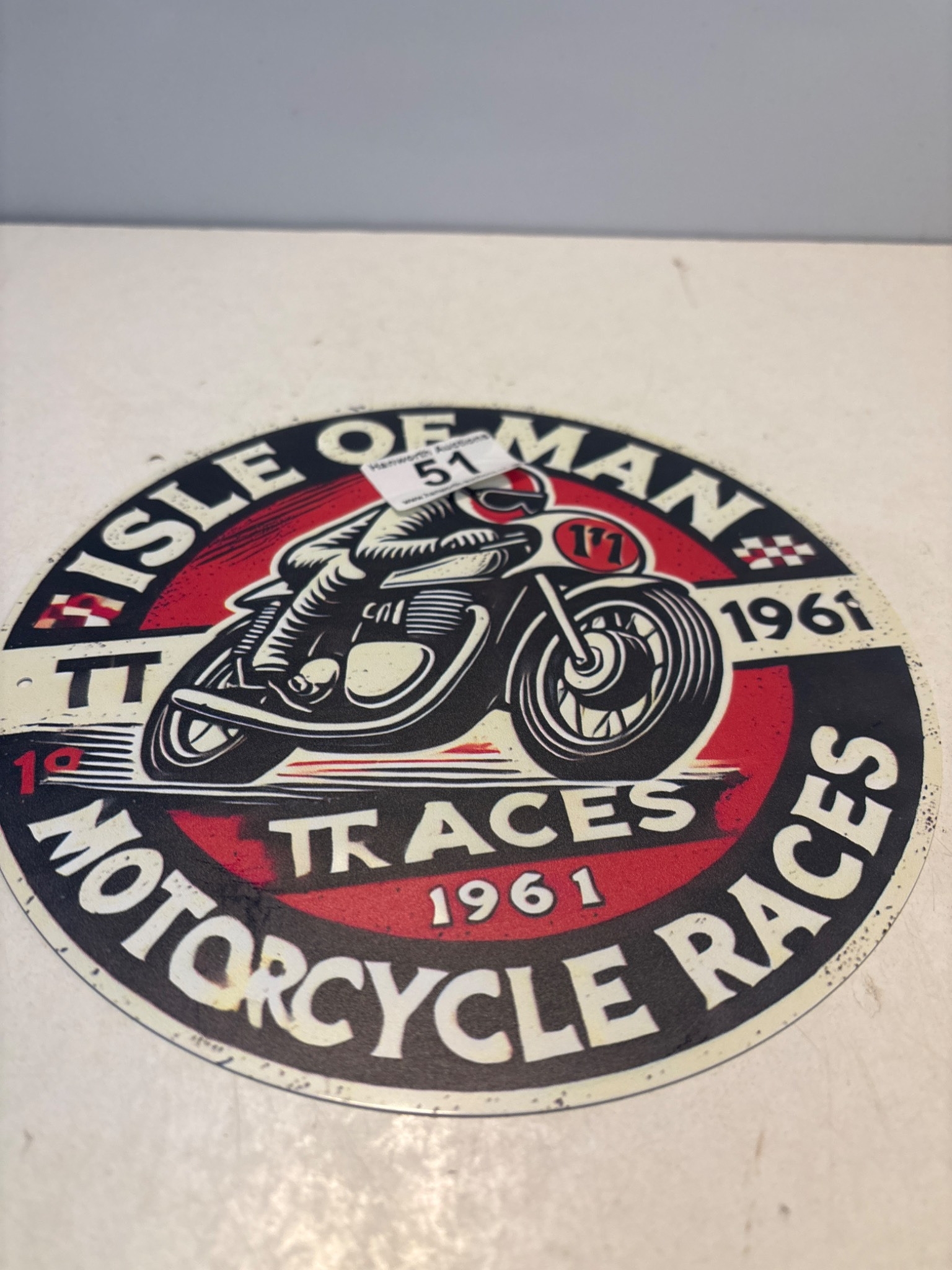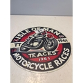 Round Isle of Man motorcycle races tin sign depicting a motorbike and rider with the year 1961 and TT Traces insignia.