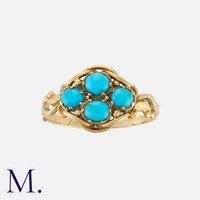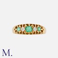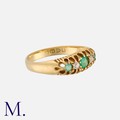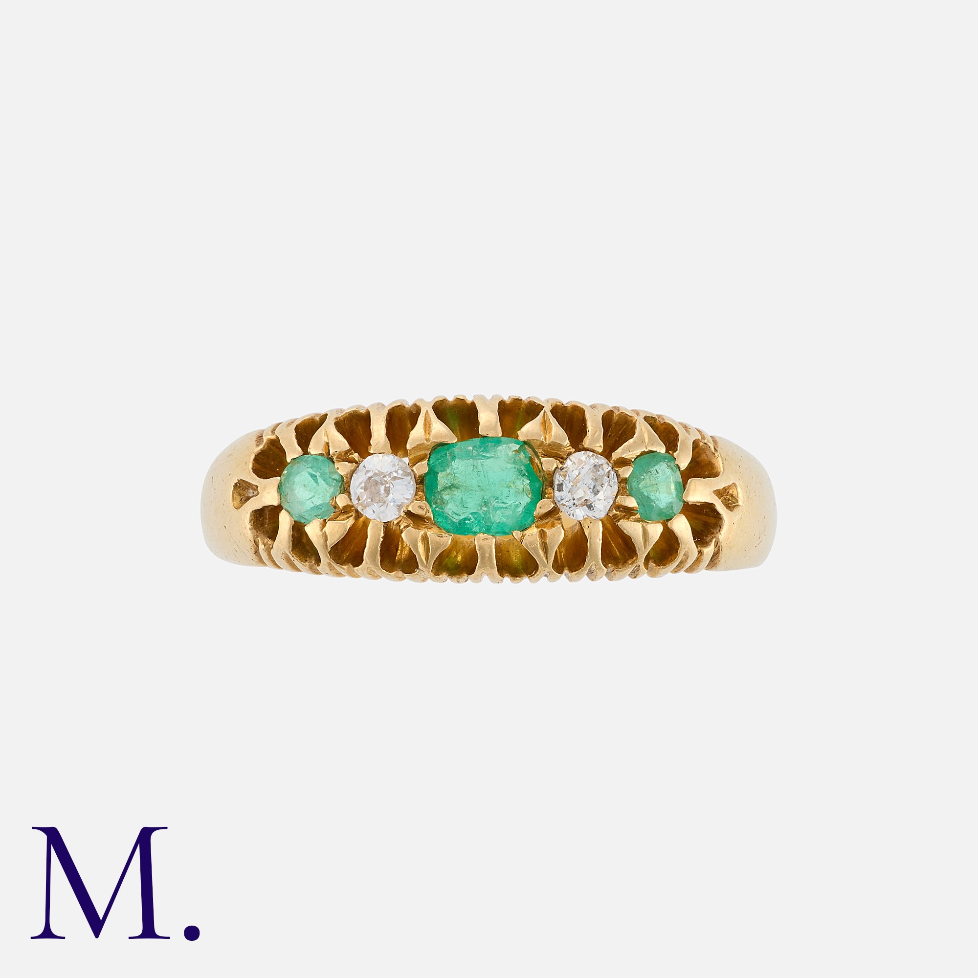 An Antique Emerald and Diamond Ring in 18K yellow gold, set with three emeralds and two old cut diamonds. Hallmarked for 18ct gold.