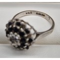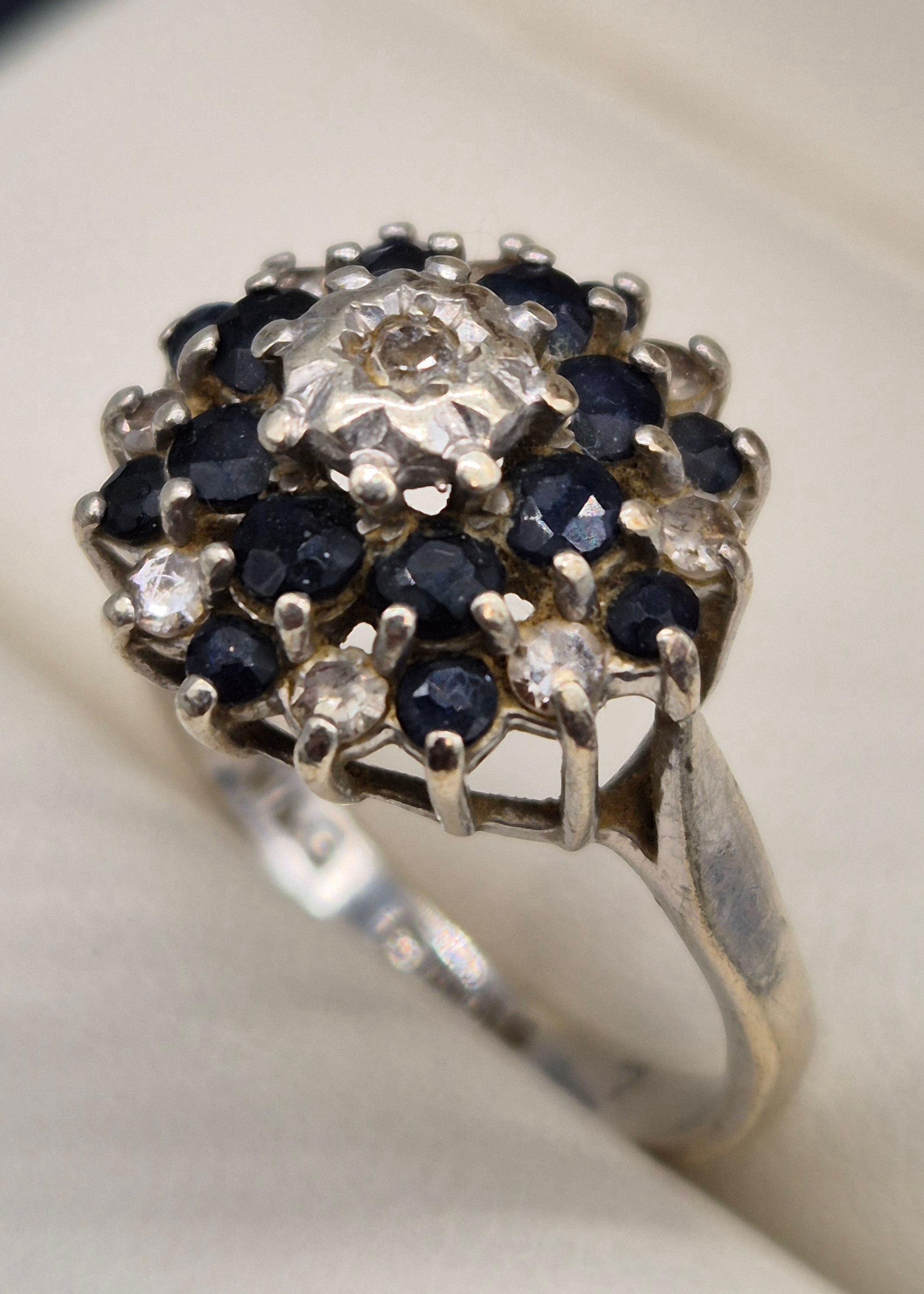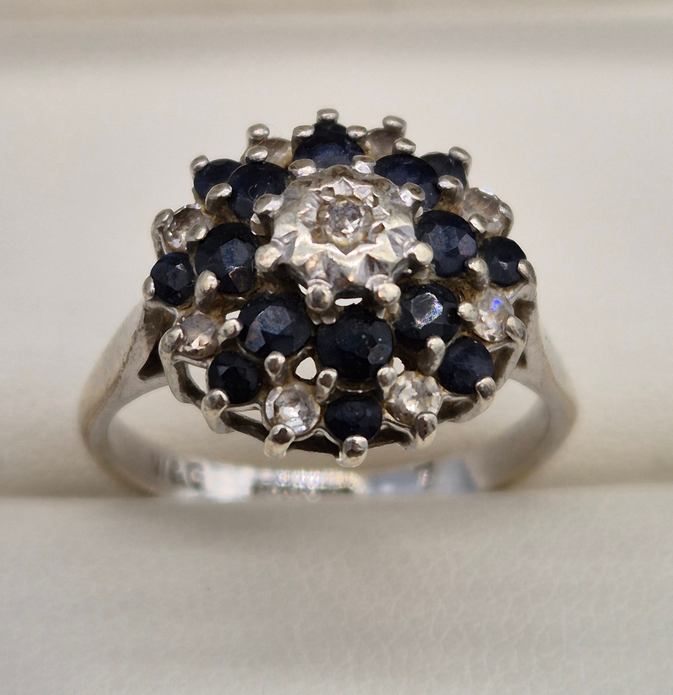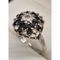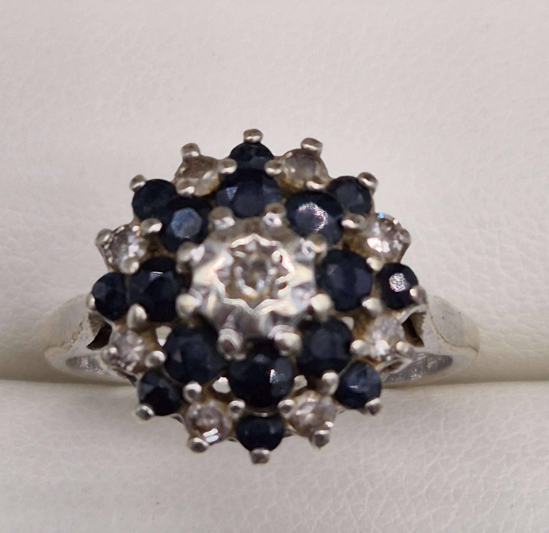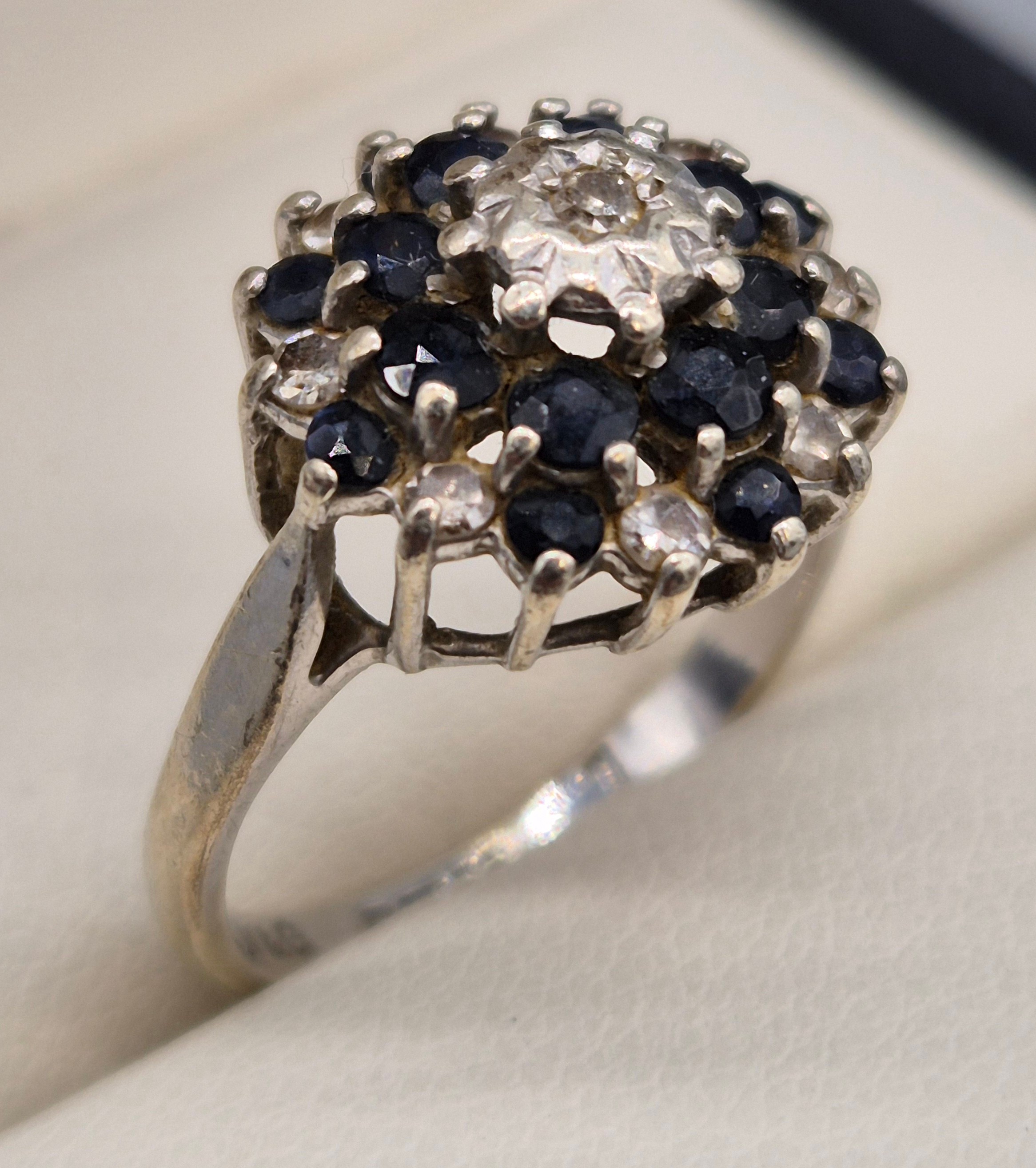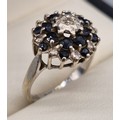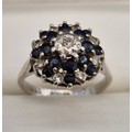 9ct white gold, sapphire and diamond cluster ring. 3.91Grams. Ring size O.