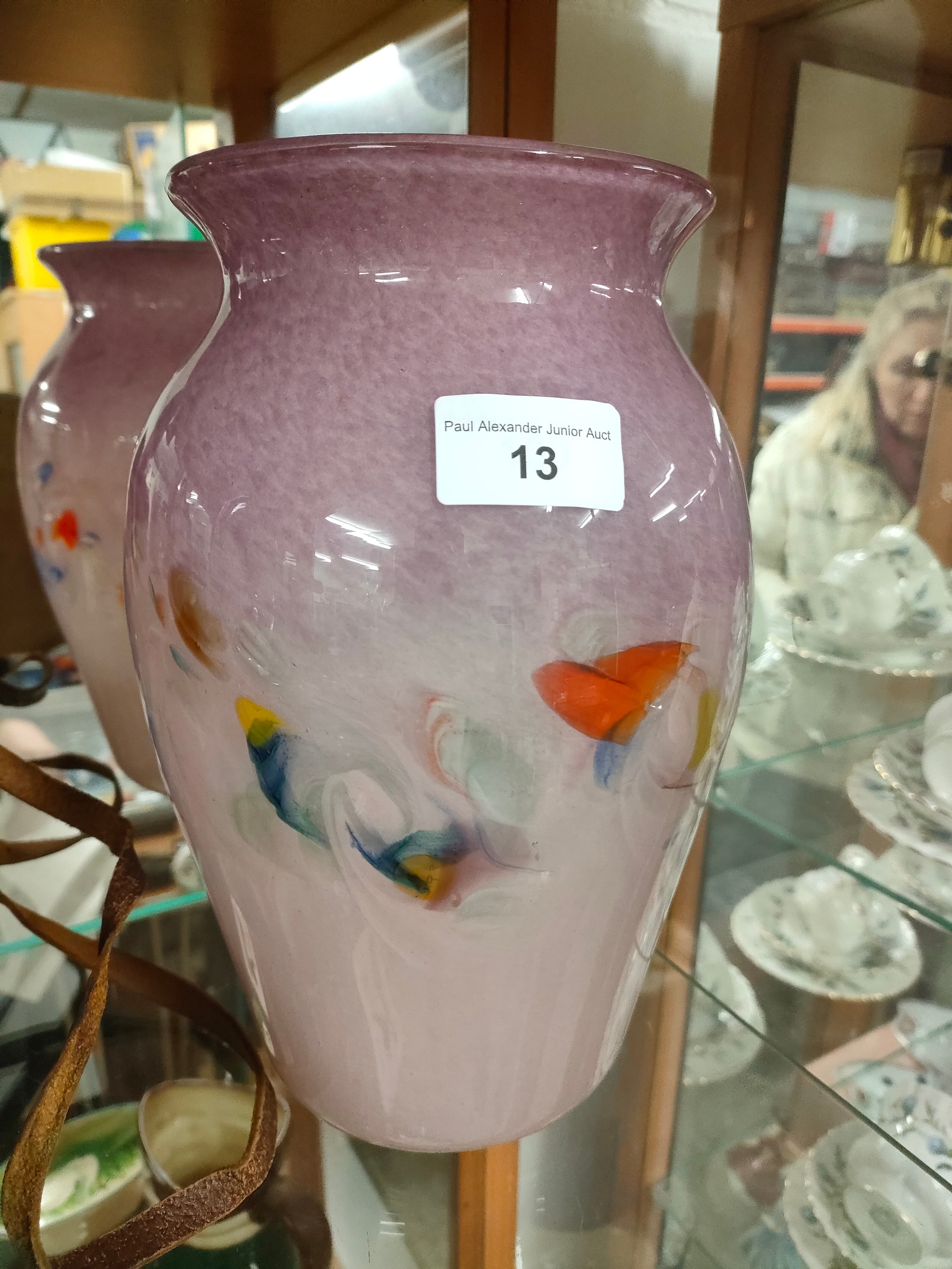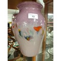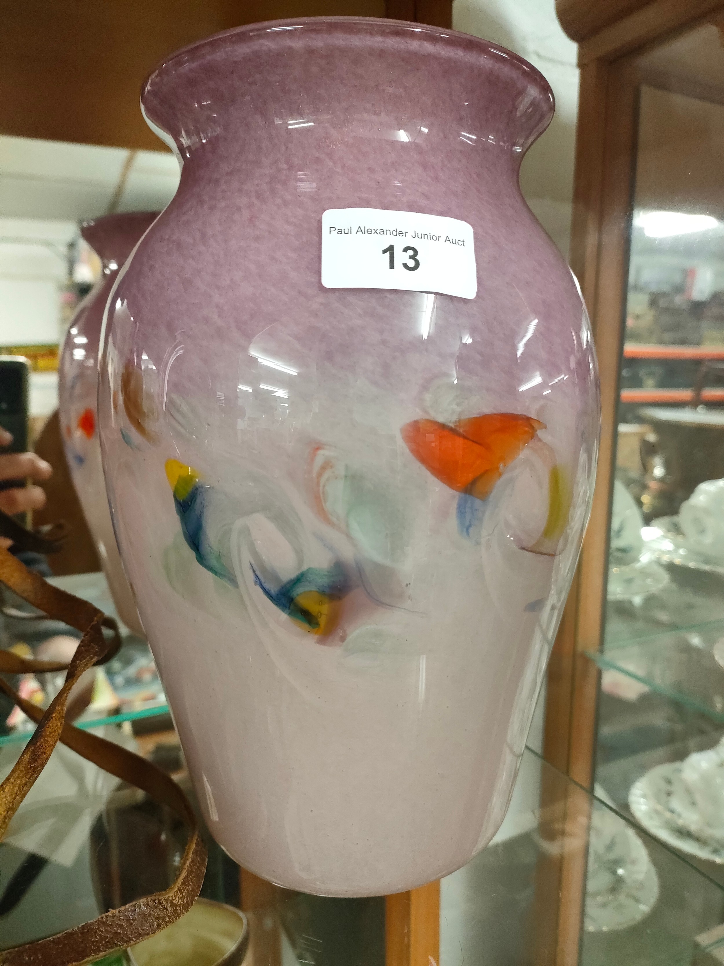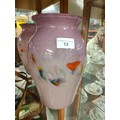 Large strathearn Scottish glass vase with pale and purple back ground with multiple colour swirl adventurine .