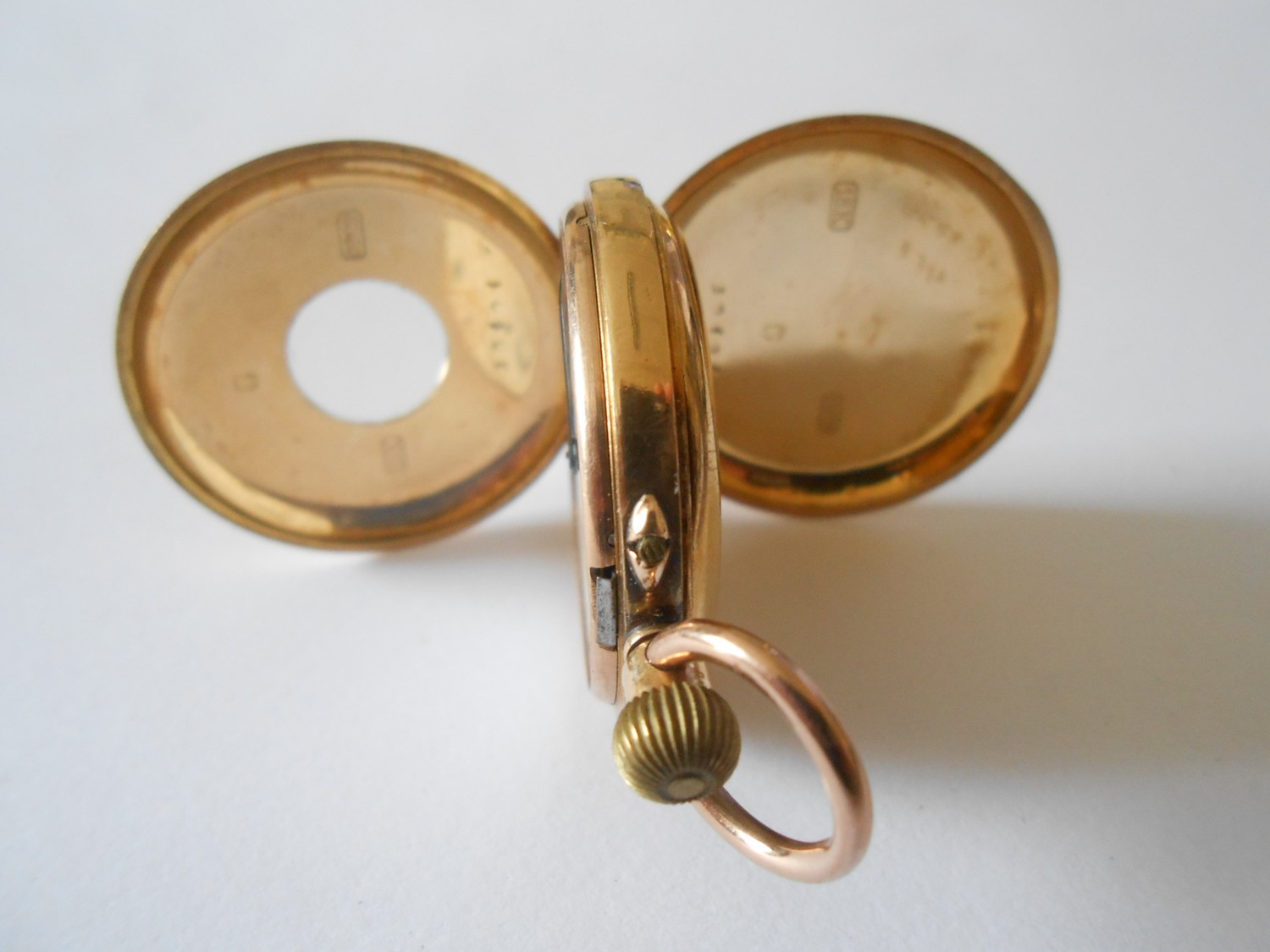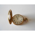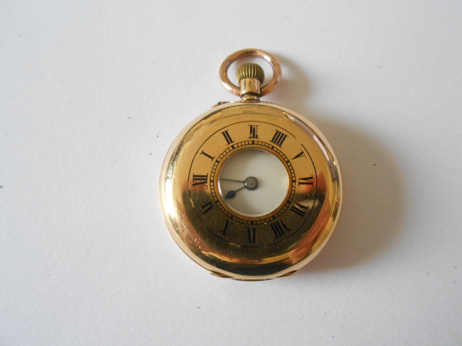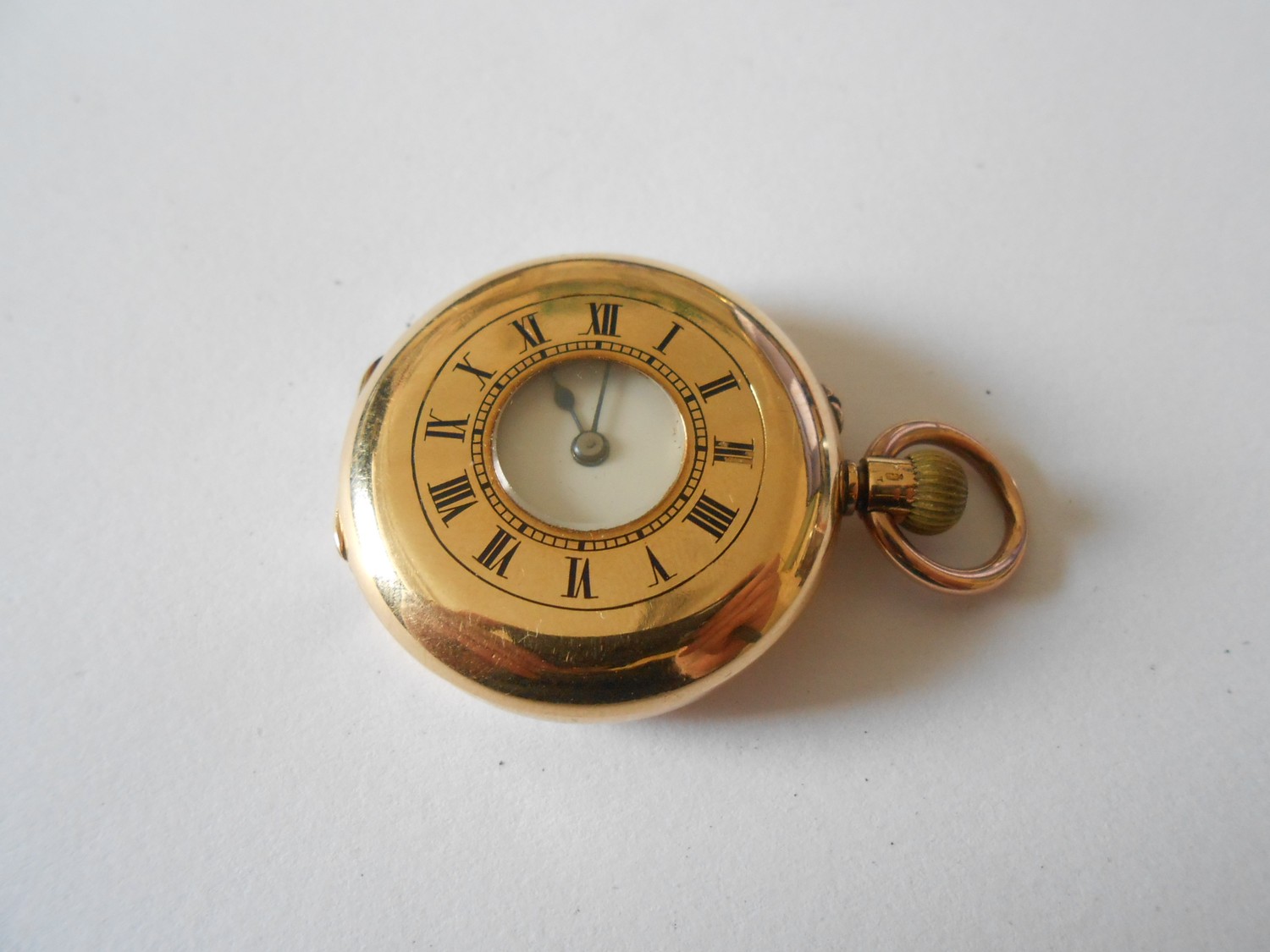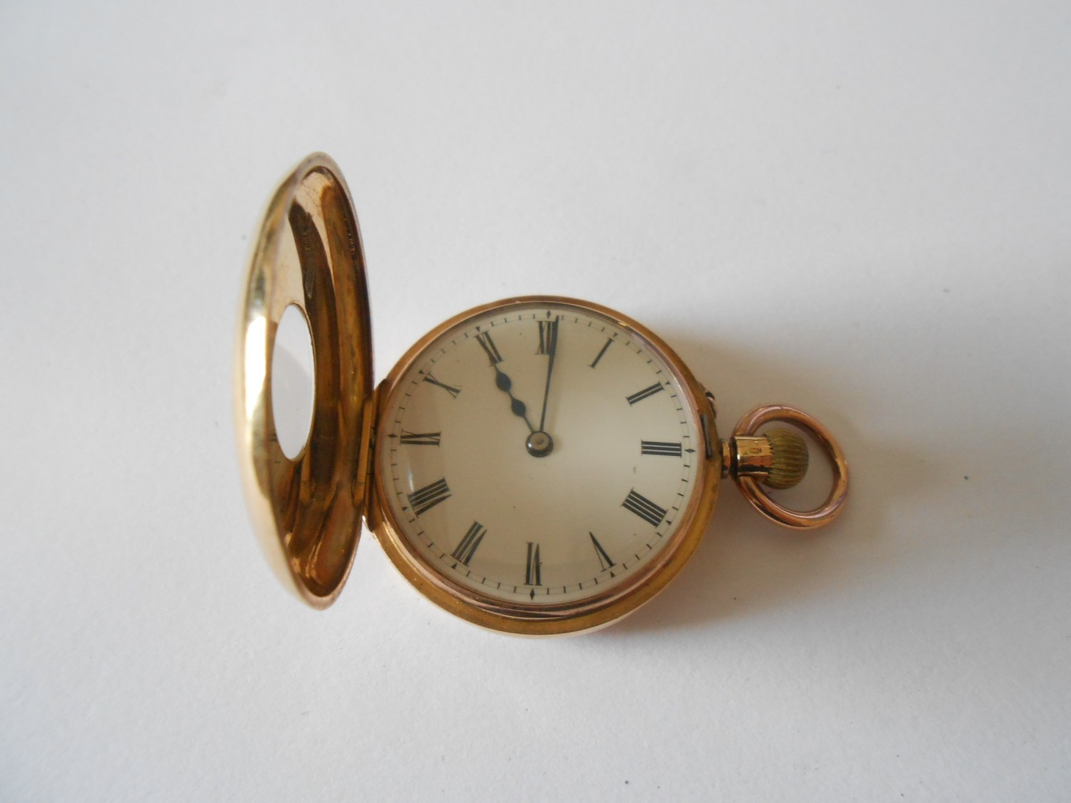 A lady's fob watch retailed by J Sewill, 30 Cornhill, London, white enamel dial, in an 18ct. gold hunting case with black Roman numerals