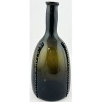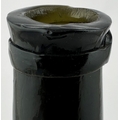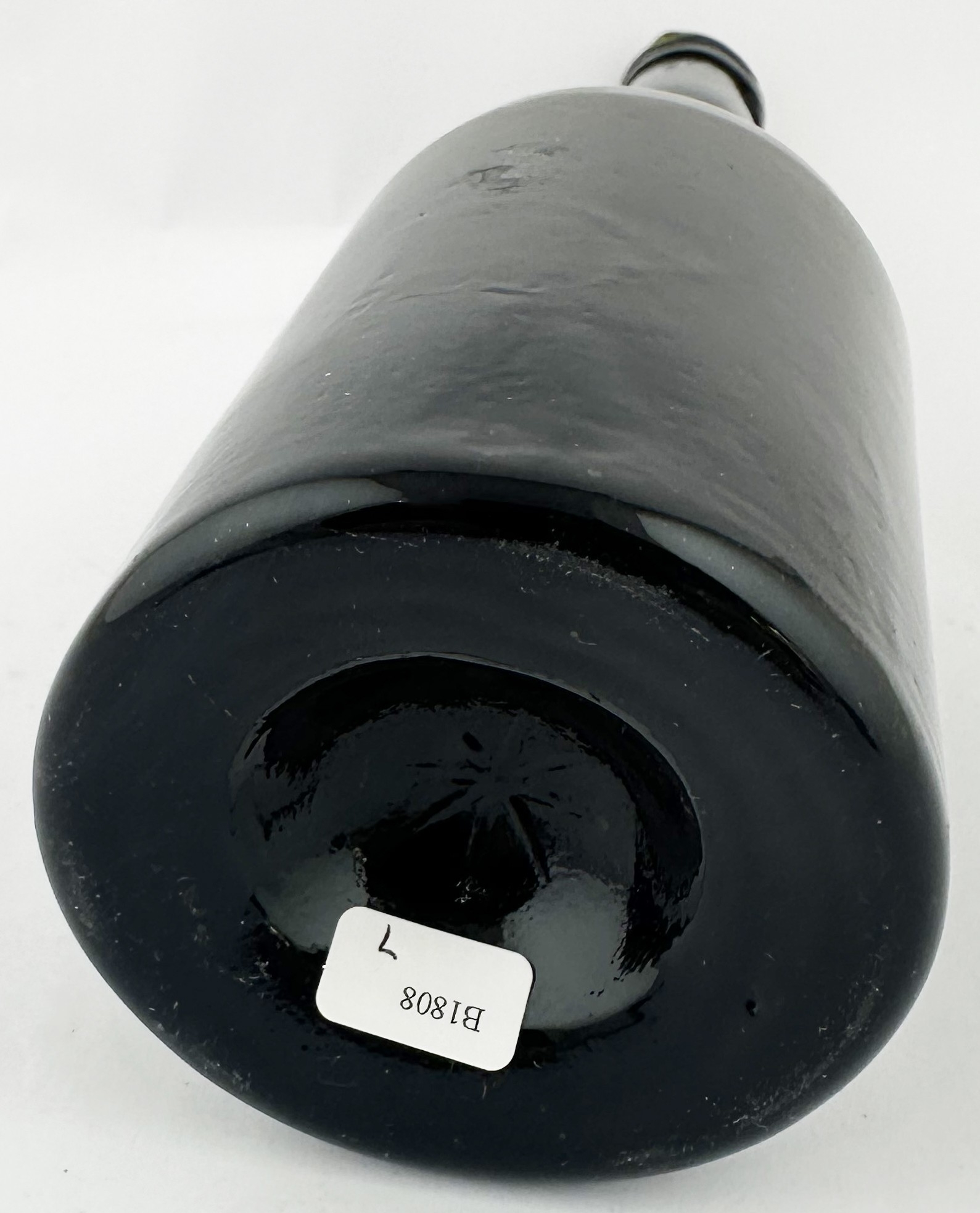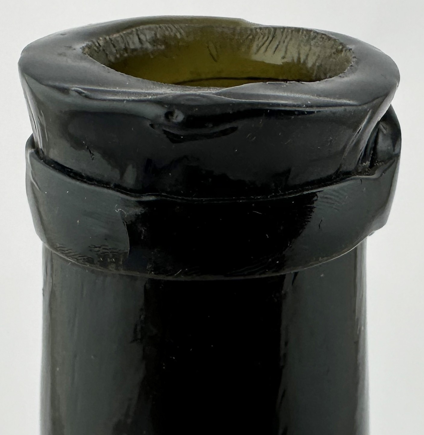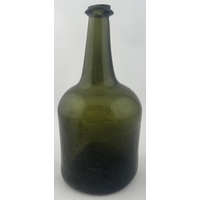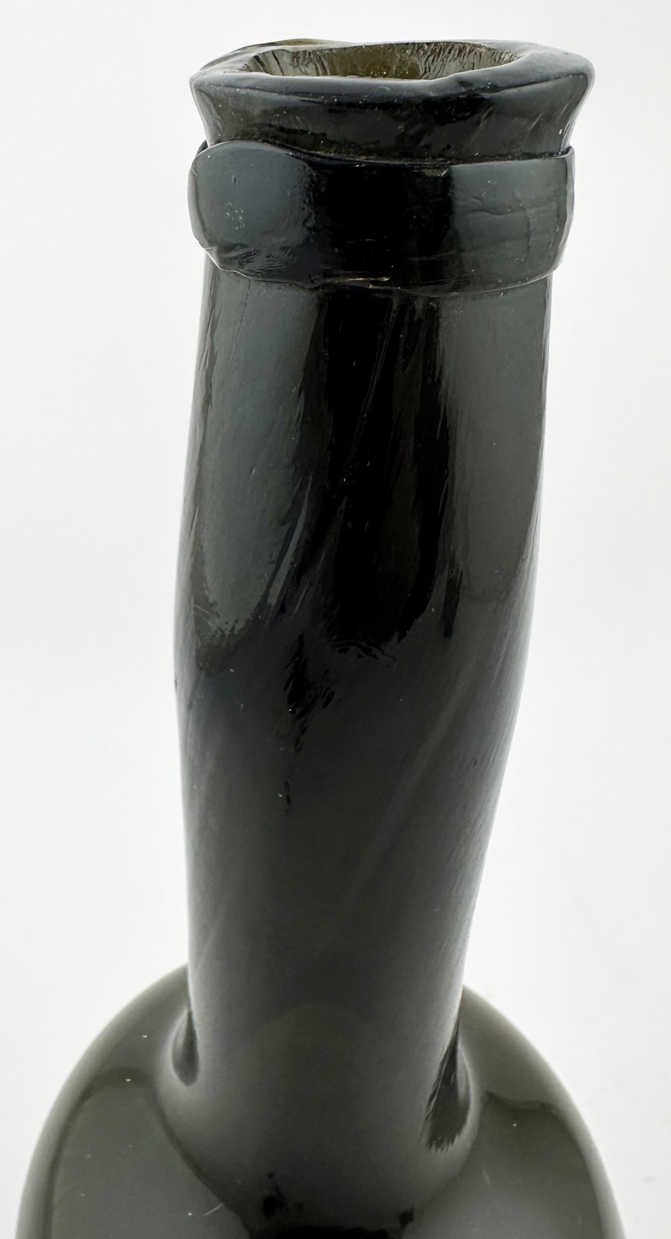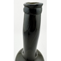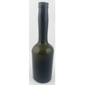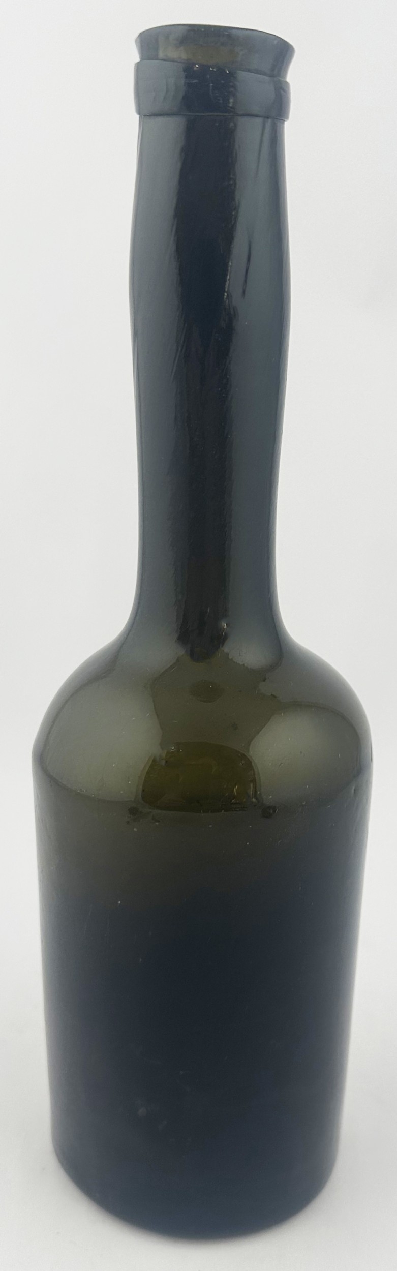 ENGLISH LADIES LEG ANTIQUE WINE BOTTLE. 10ins tall. Black/ very dark green glass cylinder wine bottle, tooled lip, squared applied lower string rim. Full glass sheen, distinctive curved ladies leg shape, long neck. Plenty of whittling & great character. Super rare small size. Fabulous!