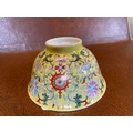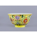 A CHINESE PORCELAIN SMALL BOWL of plain circular form, the exterior painted in colours with the Eight Treasures on a yellow ground, the interior painted in burnt orange with five flying bats, bears Qianlong mark in underglaze blue, 4 1/2" diameter (Illustrated) (Est. plus 24% premium inc. VAT)