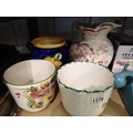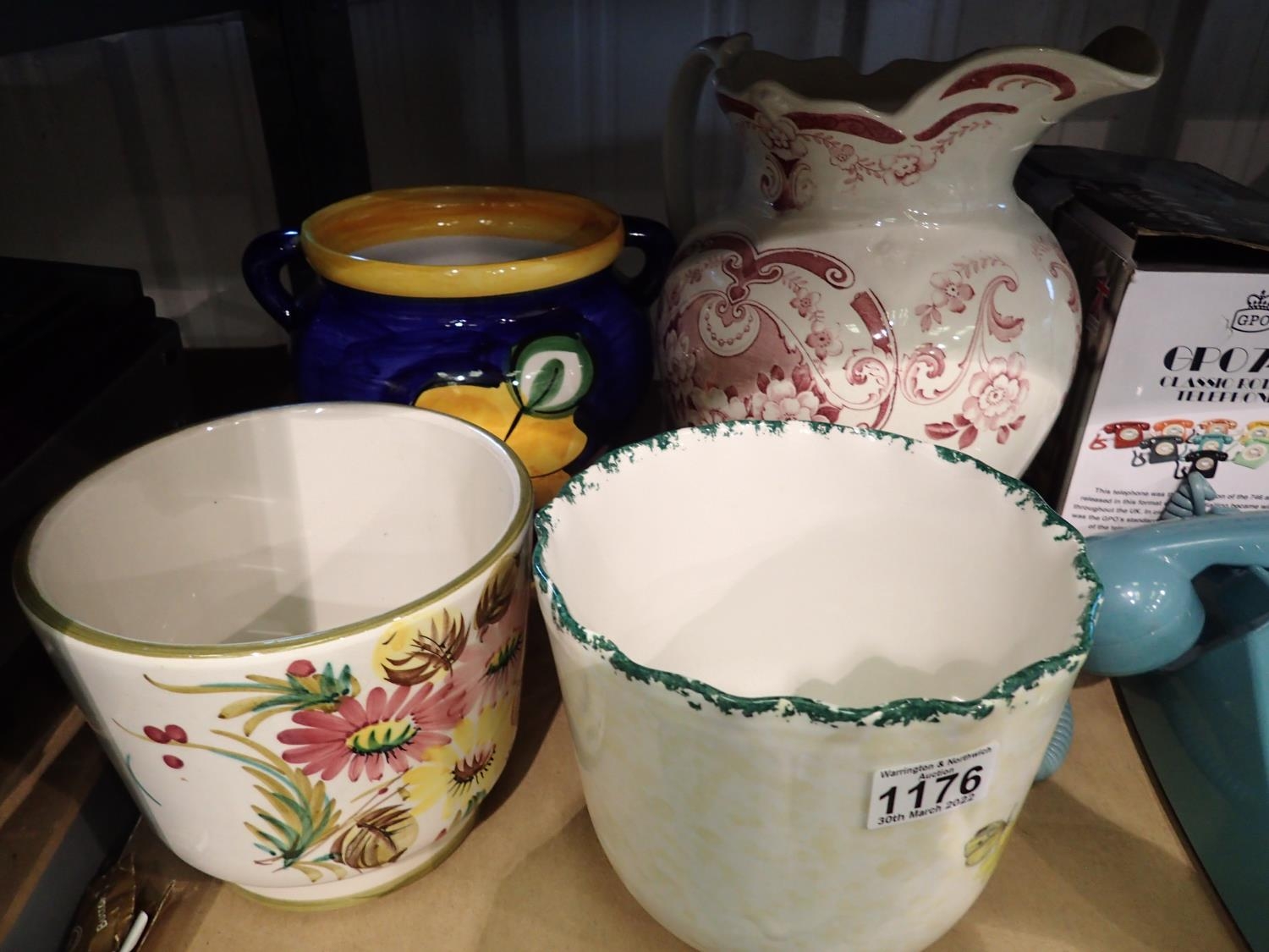 Four ceramic plant pots including a wall hanging example., largest H: 31 cm. Not available for in-house P&P, contact Paul O'Hea at Mailboxes on 01925 659133