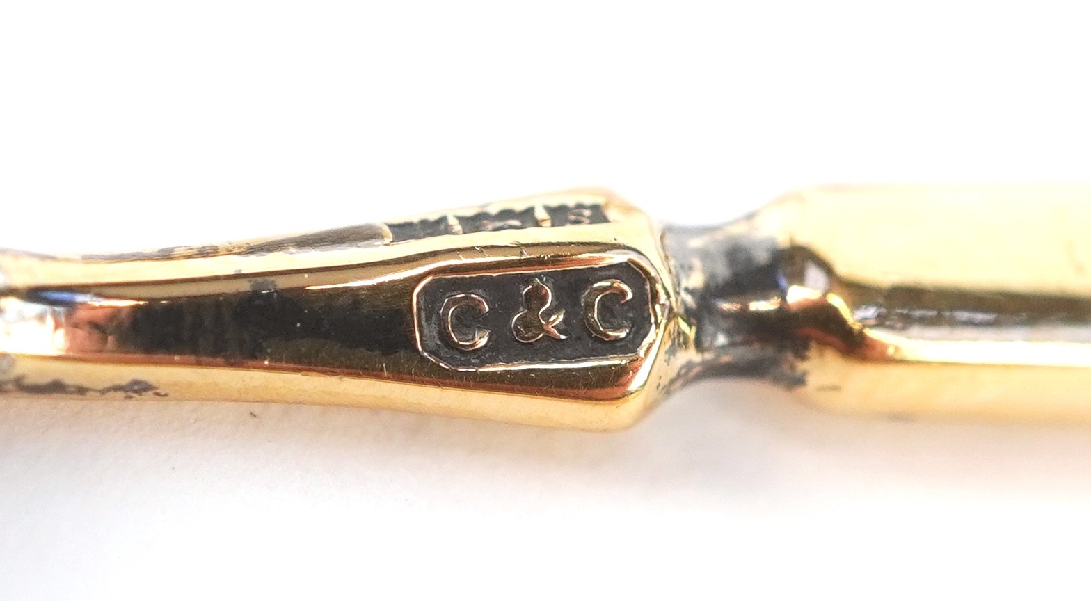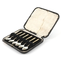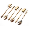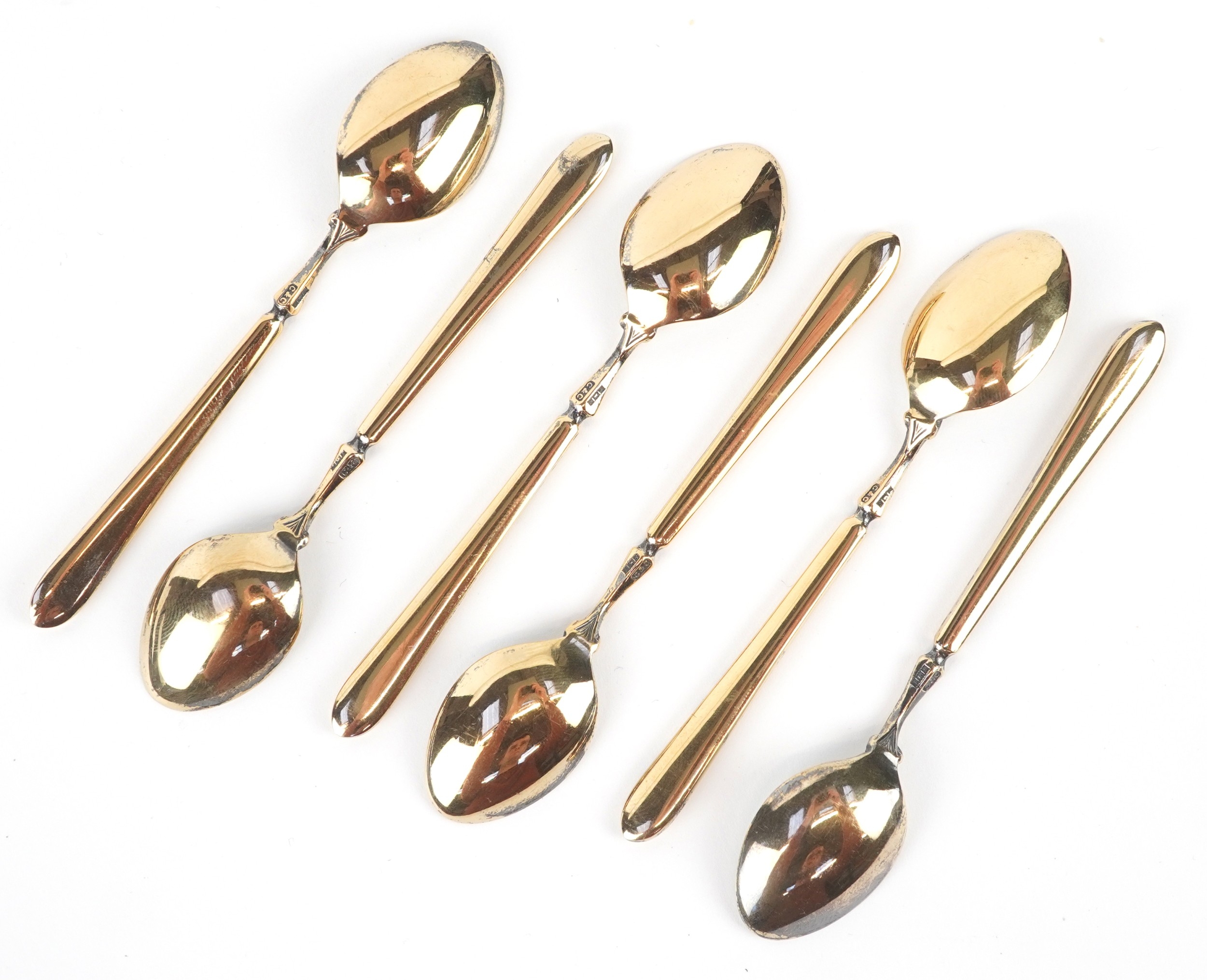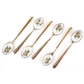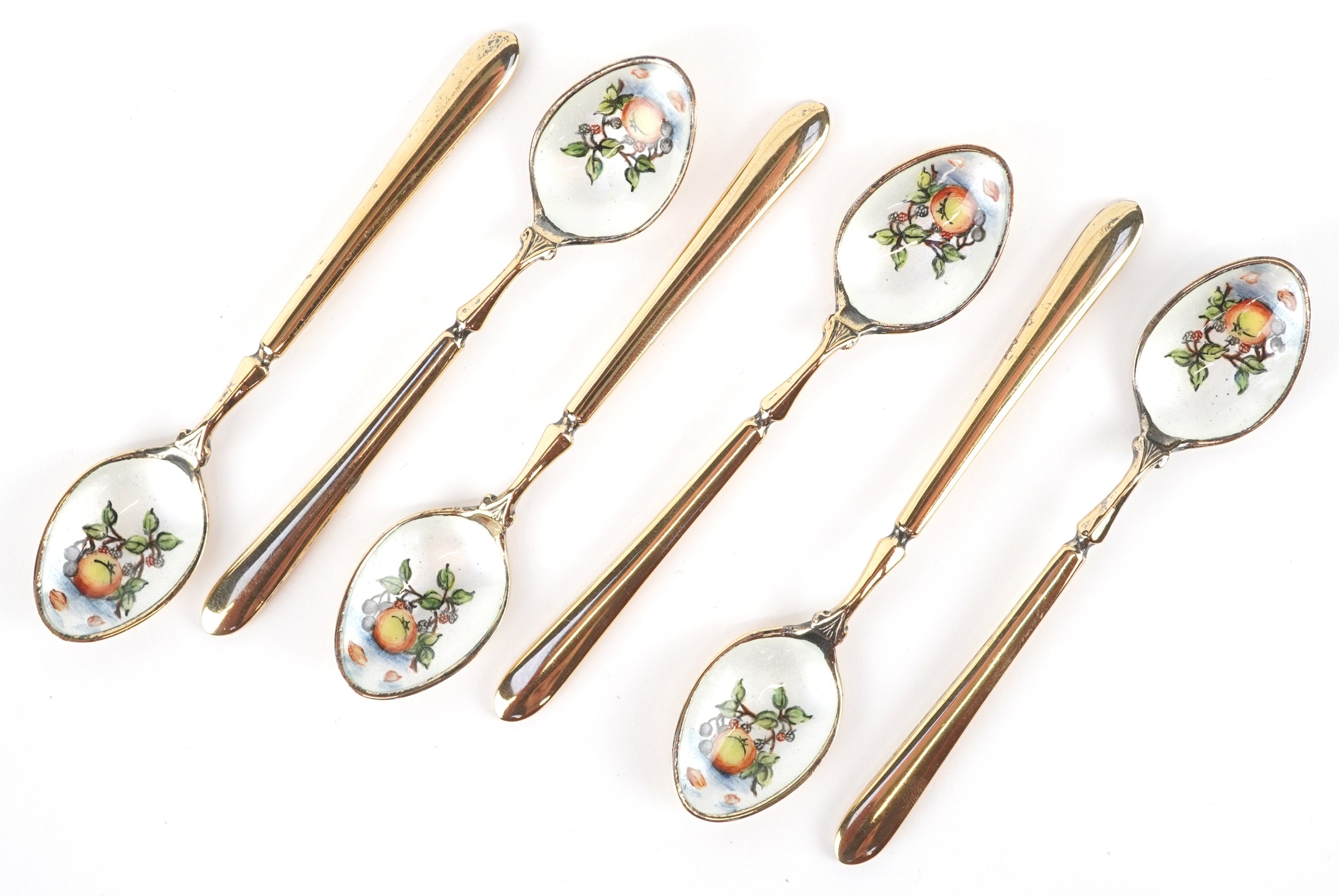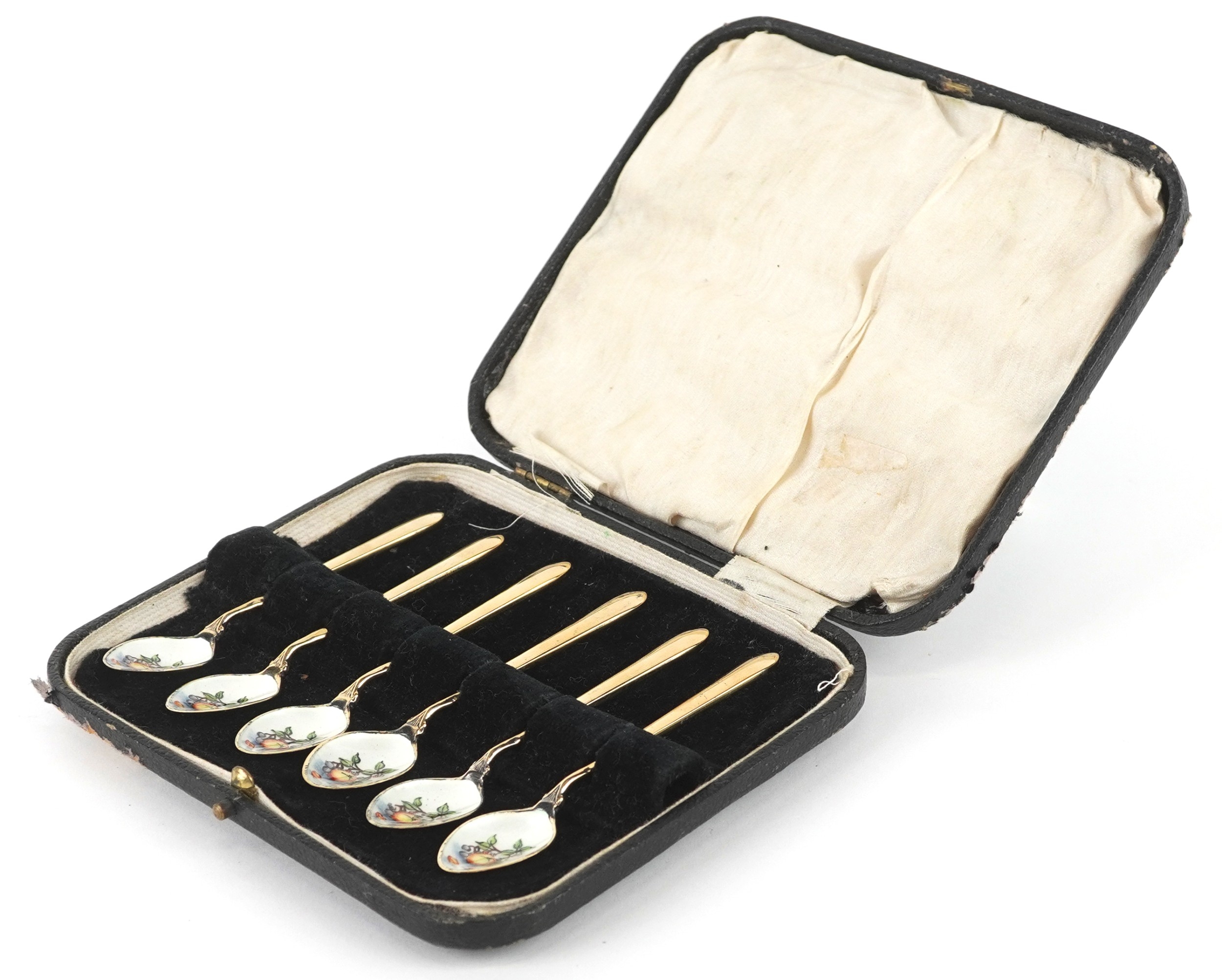 Cohen & Charles, a set of six silver gilt and enamel coffee spoons hand painted with fruit, Birmingham 1967, 9.7cm in length, total 48.9g, housed in a fitted case.