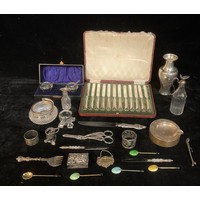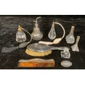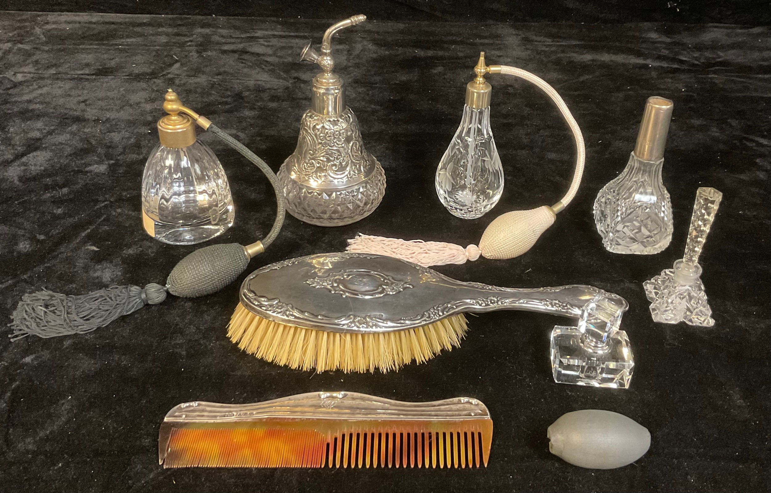 A silver hair brush, Chester 1910; a silver mounted comb, Birmingham 1911; a silver mounted clear glass scent atomiser, Birmingham 1901; other scent bottles and atomisers (8)
