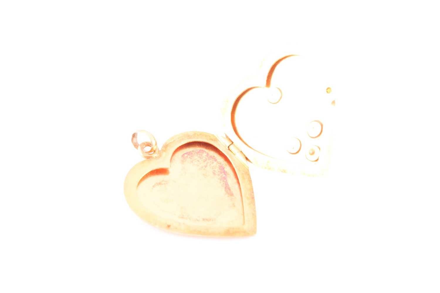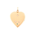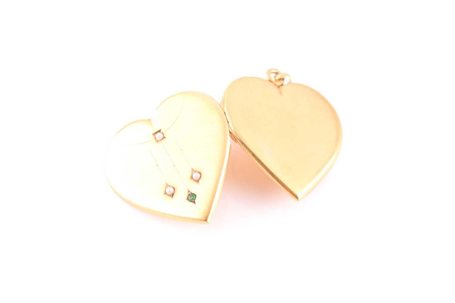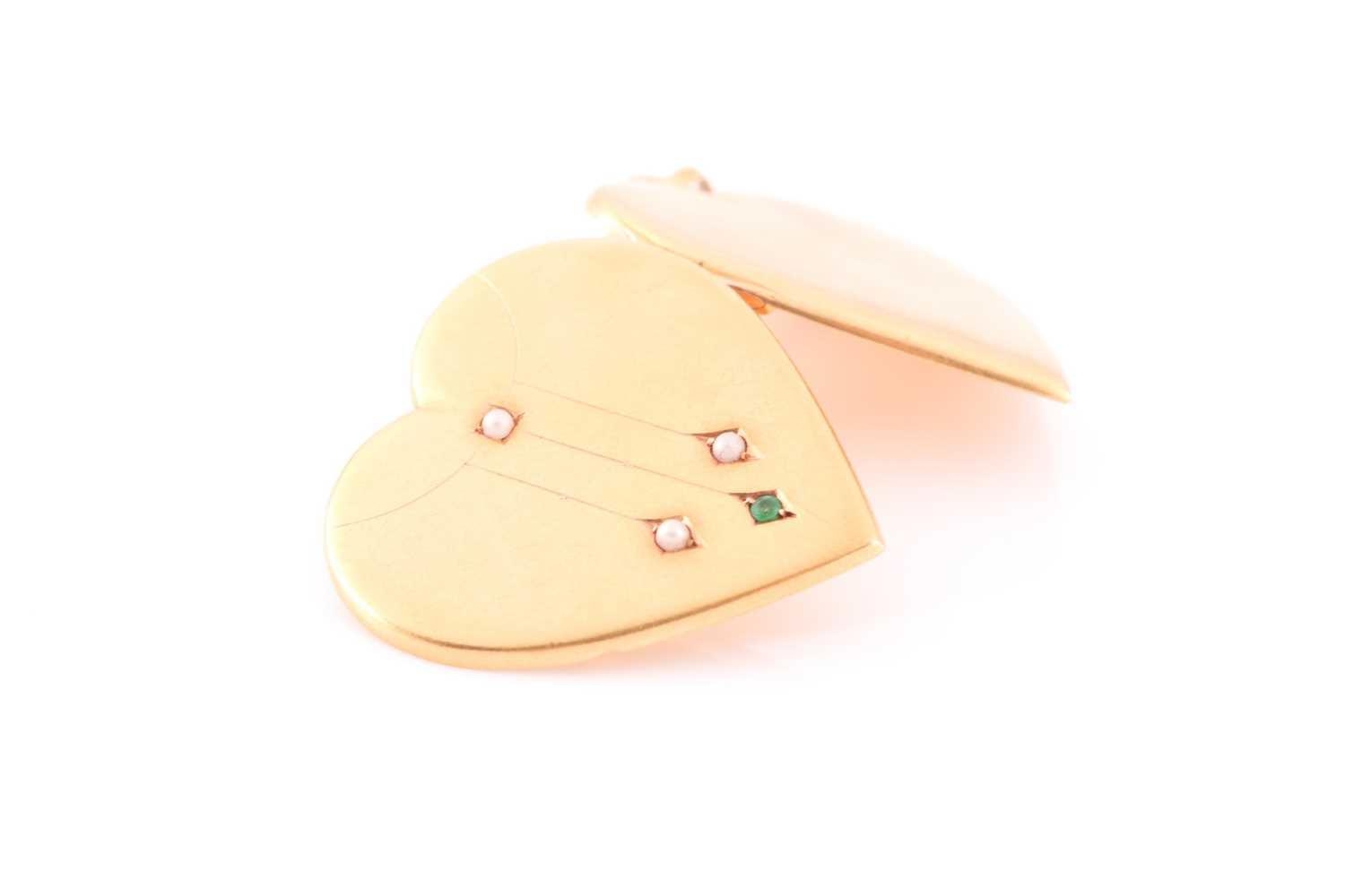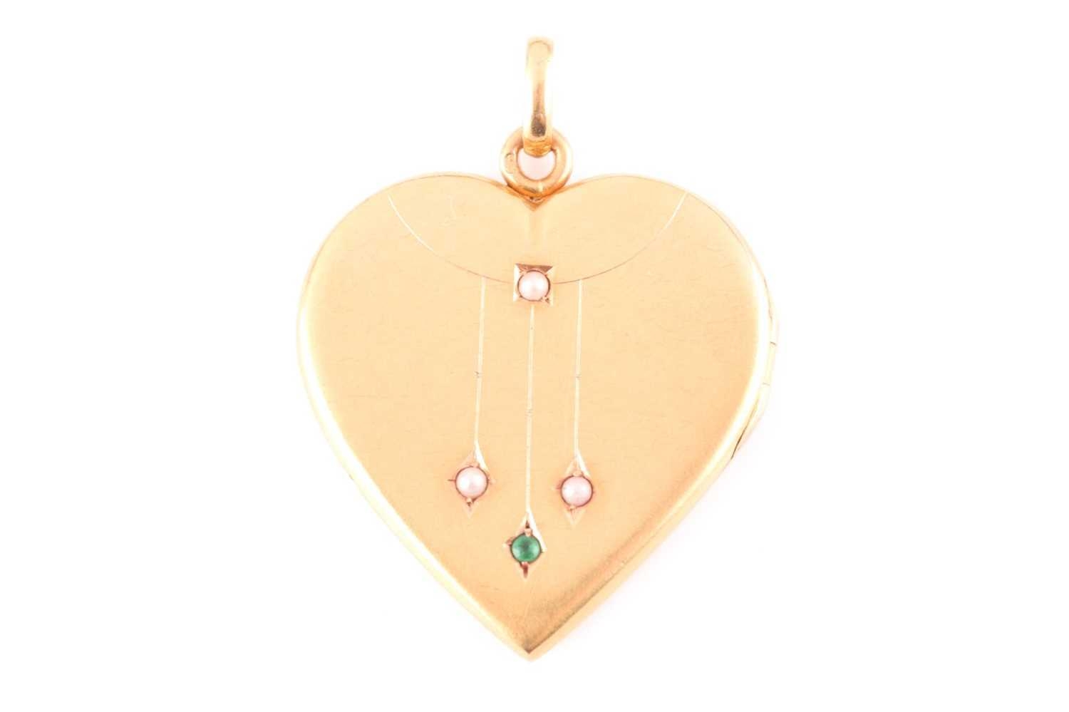 An early 20th century yellow metal heart-shaped locket pendant, the hinged front inset with small seed pearls and an emerald, unmarked, 3 x 2.7 cm, 5.9 grams.