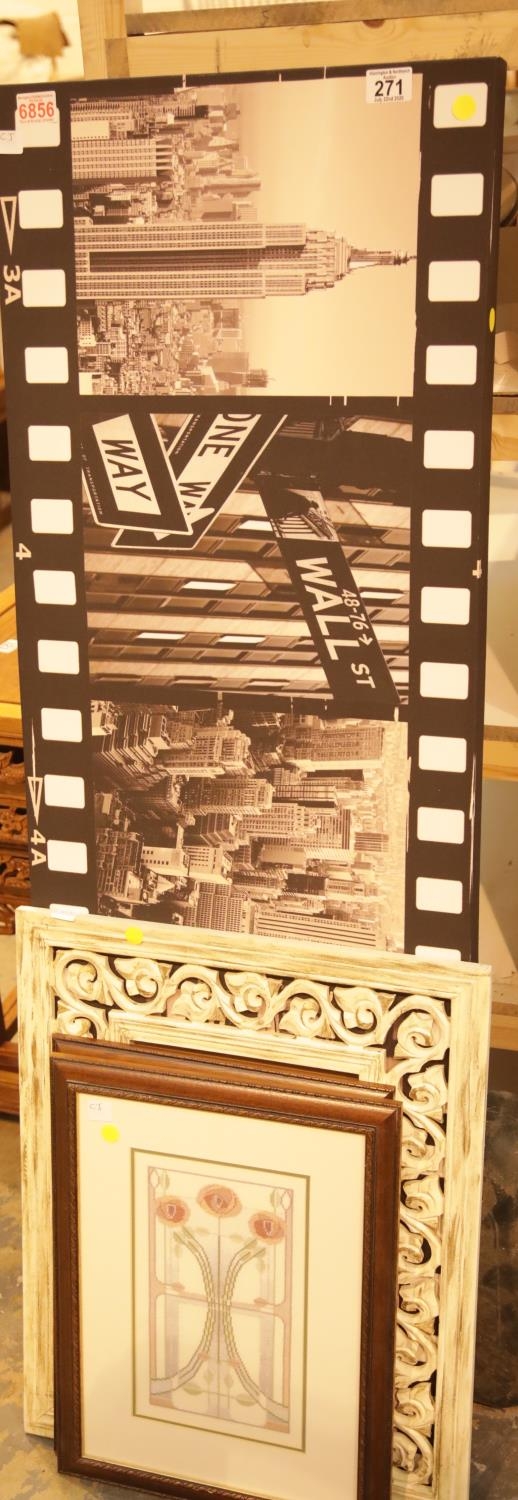 Large modern canvas, small modern wall mirror and two framed tapestries. This lot is not available for in-house P&P.