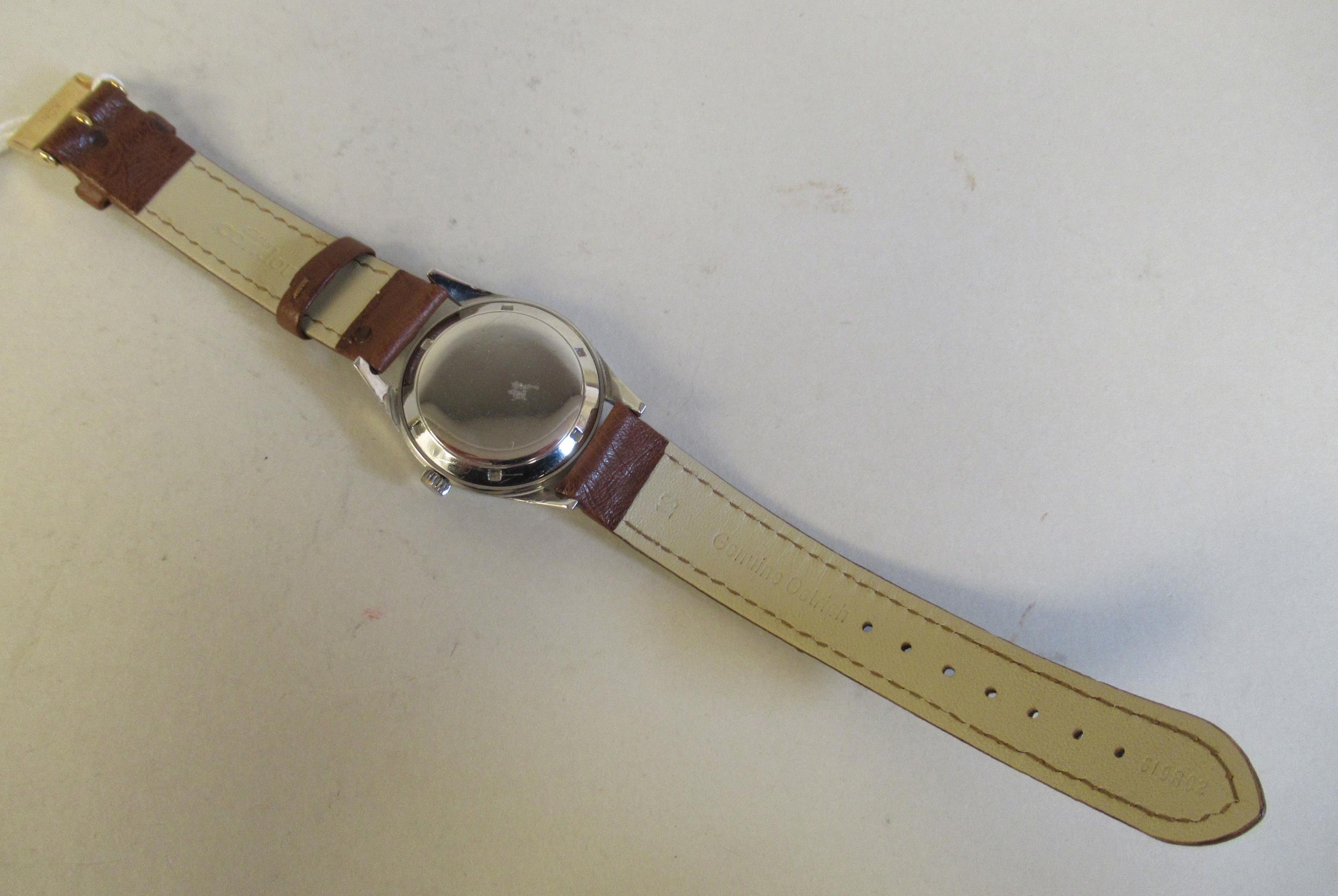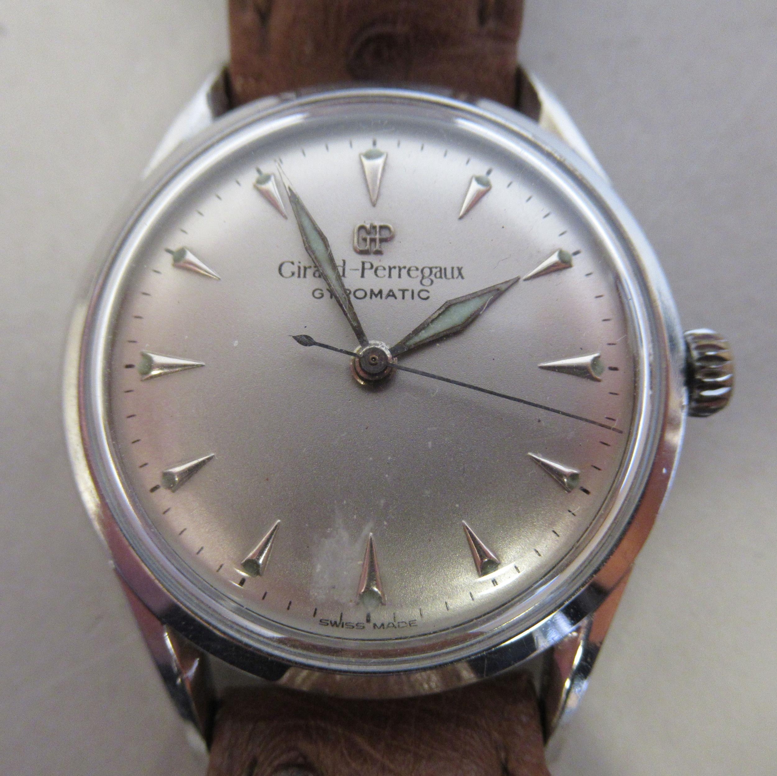 A Girard-Perregaux Giromatic stainless steel cased wristwatch, the automatic movement with sweeping seconds, faced by a baton dial, on a stitched mid brown hide strap