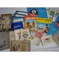 MISC. EPHEMERA AND COLLECTABLES INC. LARGE NUMBER OF CIGARETTE CARDS IN A CIGAR BOX, WWI ERA SILK AND OTHER GREETINGS CARDS AND VINTAGE TRAVEL BROCHURES INC. 1967 GOLDEN ARROW, SKYTOURS, BRITANNIA AIRWAYS INC. IN FLIGHT MENU ETC.