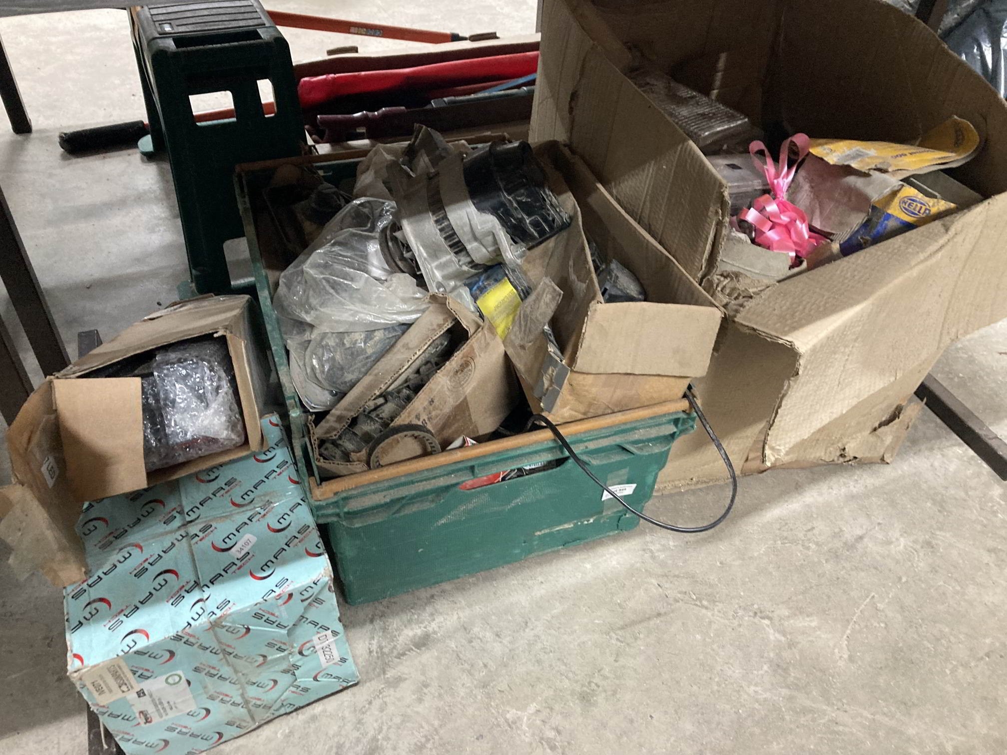 Indicator lamps, rear tail light assembly, alternator, box of assorted car spot lights, automotive miscellaneous items etc