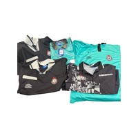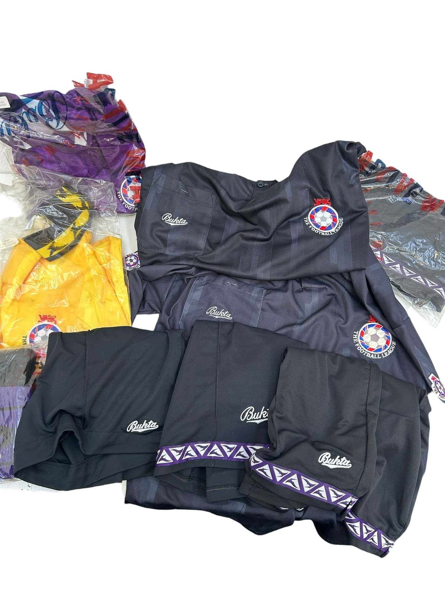 COLLECTION OF 1980/90s FOOTBALL LEAGUE REFEREE WORN KIT, X4 SHIRTS (INC X2 DEADSTOCK), X4 SHORTS,, X1 SOCKS.