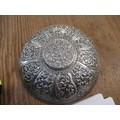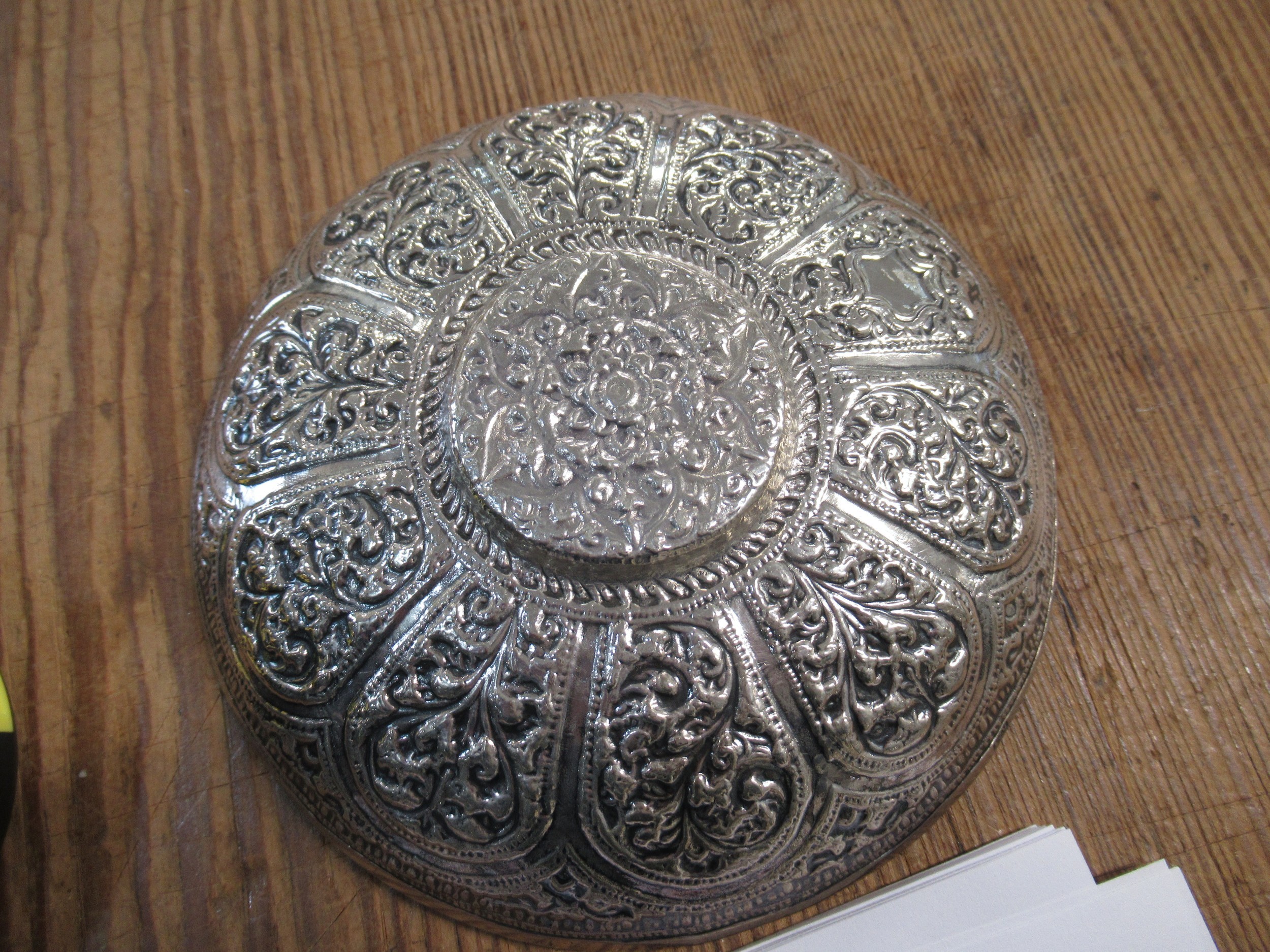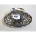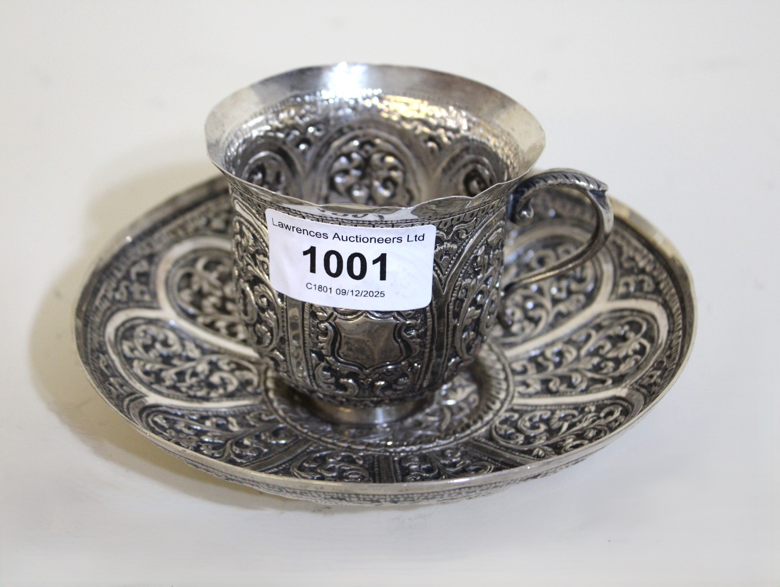 Indian floral embossed white metal cup and saucer, 6.6oz t