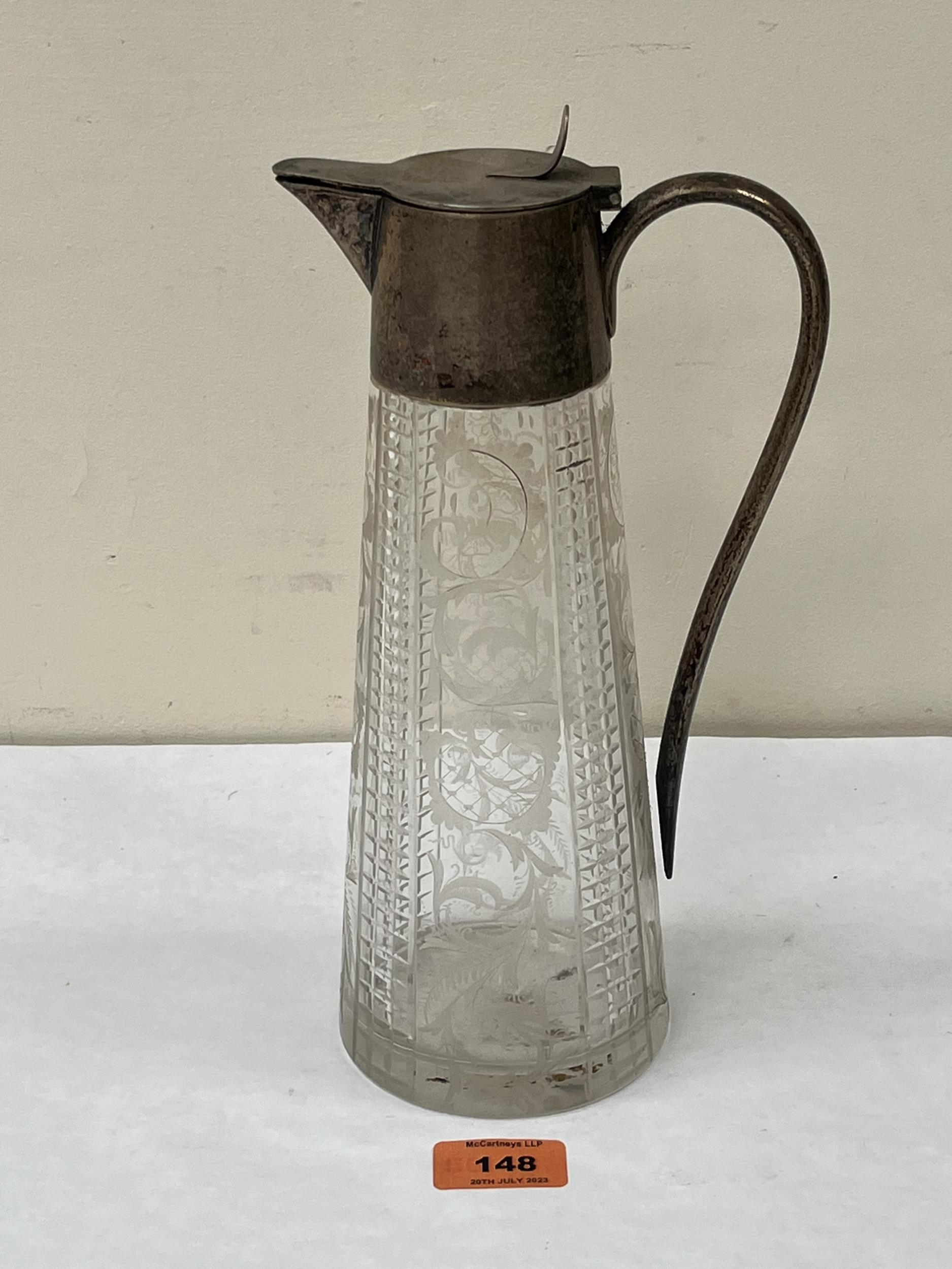 A cut glass claret jug with plated mounts and handle. 11' high.