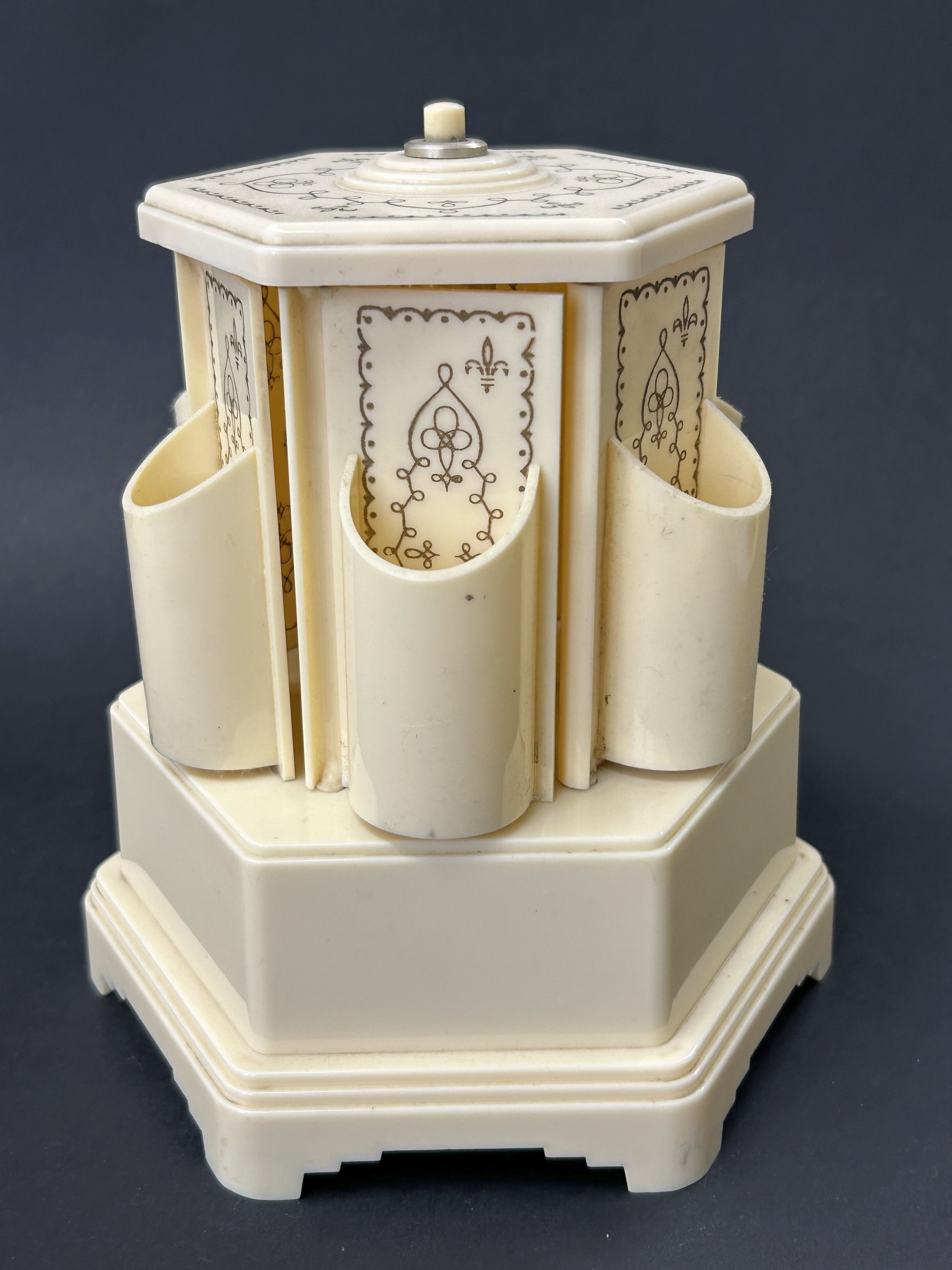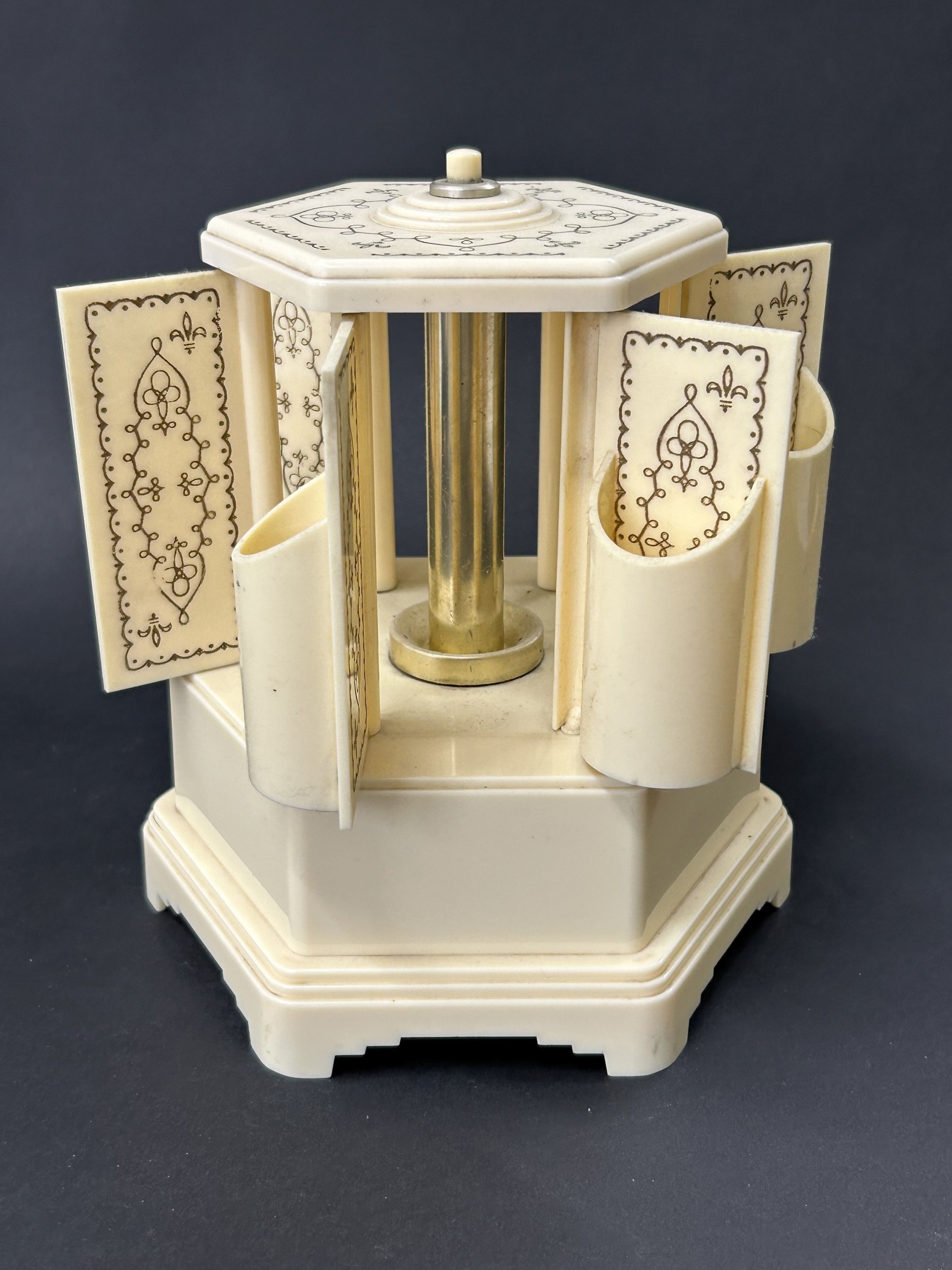 A vintage Selcol musical cigarette dispenser, also known as a lipstick carousel, approx. 7 3/4" high, winds and runs and plays a tune