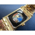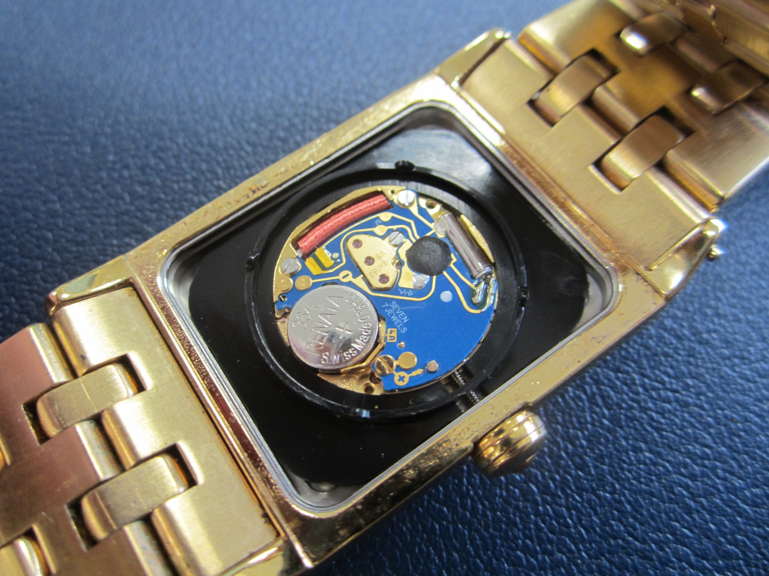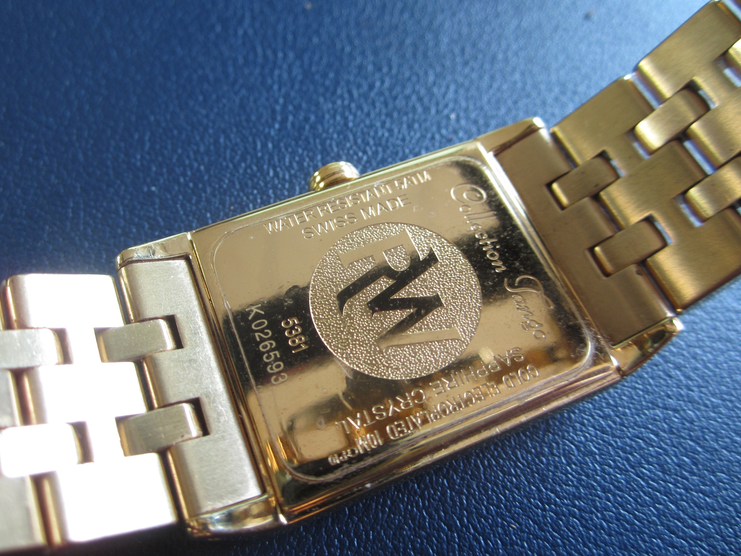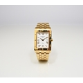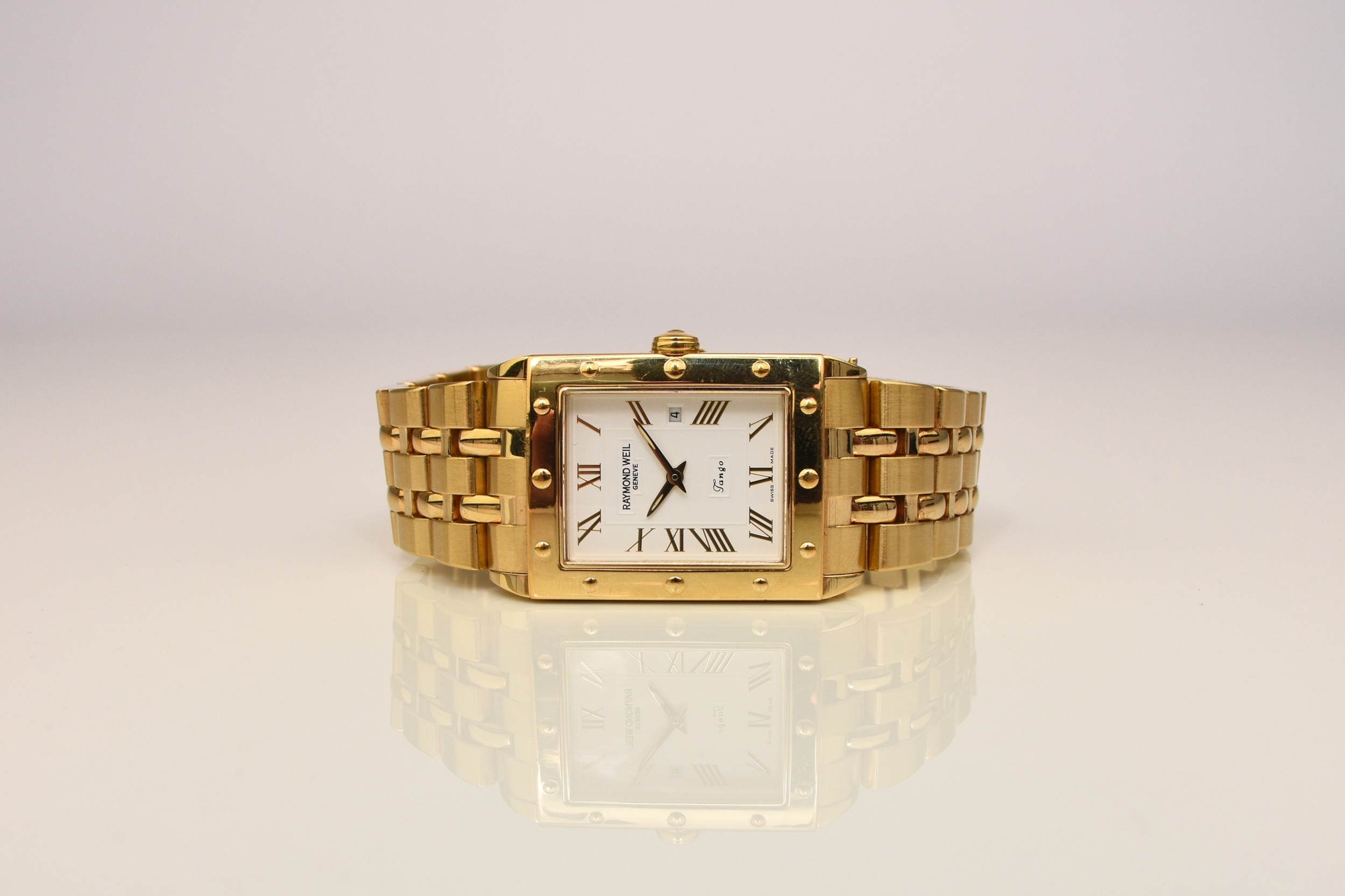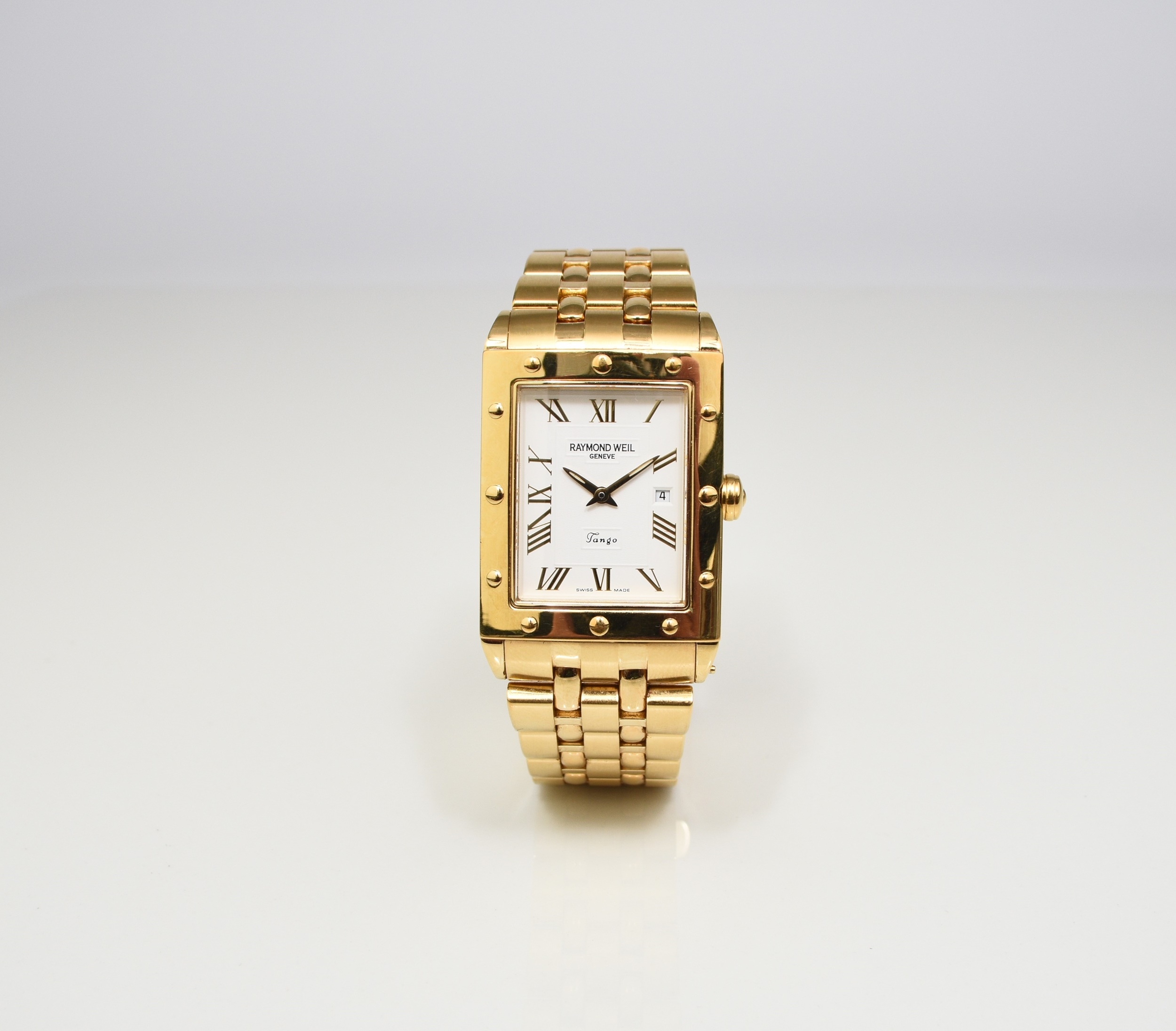 Raymond Weil: A gentleman's gold plated bracelet watch Model: Tango Reference: 5381 Date: Circa 2009 Movement: ETA V8 7 jewel quartz Dial: White with guilloche texture, applied gold Roman hour markers, date aperture at 3, polished gold hands with luminous inserts Case: Rectangular polished, bezel with faux rivets, sapphire crystal, pull-out crown, snap-on back with RW insignia Strap/Bracelet: Brushed and polished five-link style Buckle/Clasp: Butterfly clasp Size: 28mm Accompaniments: Raymond Weil box, outer card, instruction book, spare bracelet link Condition:• Case and back: Good with only a few abrasions and signs of wear. Original plastic still applied to back. • Crystal: Good. • Dial: Good. • Hands: Good. • Strap: Good with some fine abrasions. • Movement: Running. Unless otherwise stated, all watches are likely to have been serviced and/or repaired in their lifetime and may have had parts replaced. While a watch may be described as 'working' at the time of the report, they are not guaranteed for timekeeping - it is advised that all watches are inspected and serviced by a qualified jeweller or horologist before full use.