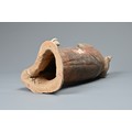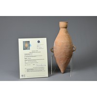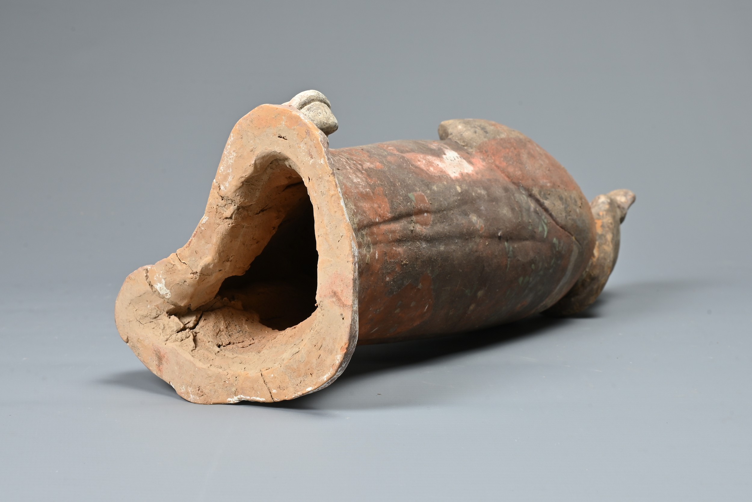 There are minor firing fissures from manufacture to the base of the figure where the pottery is thick. Much of the surface is covered with a thin "calcified" deposit from its long burial and this has helped to preserved an unusually large amount of the original coloured pigments to the body that comprise mostly orange with green flower blossoms on top.