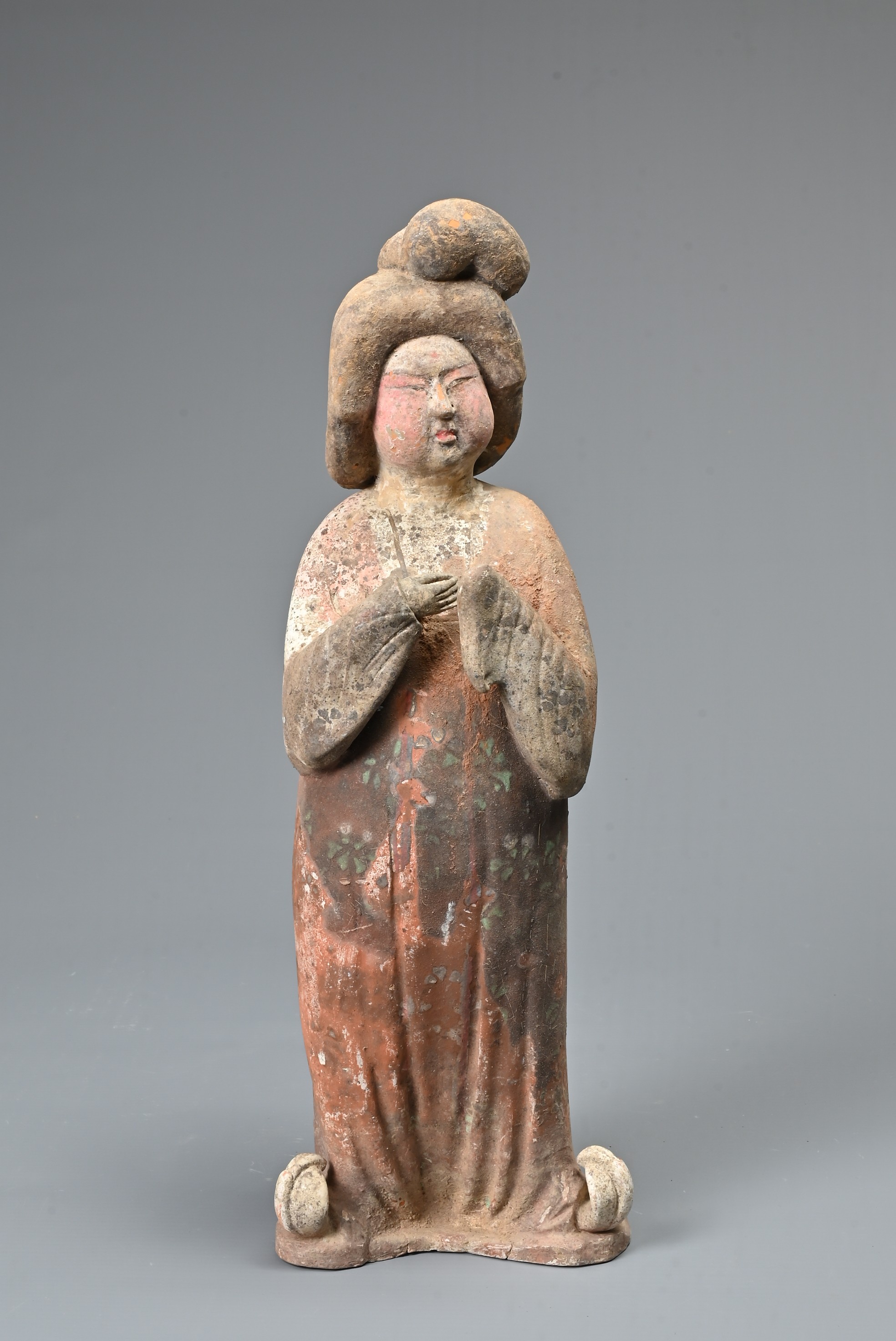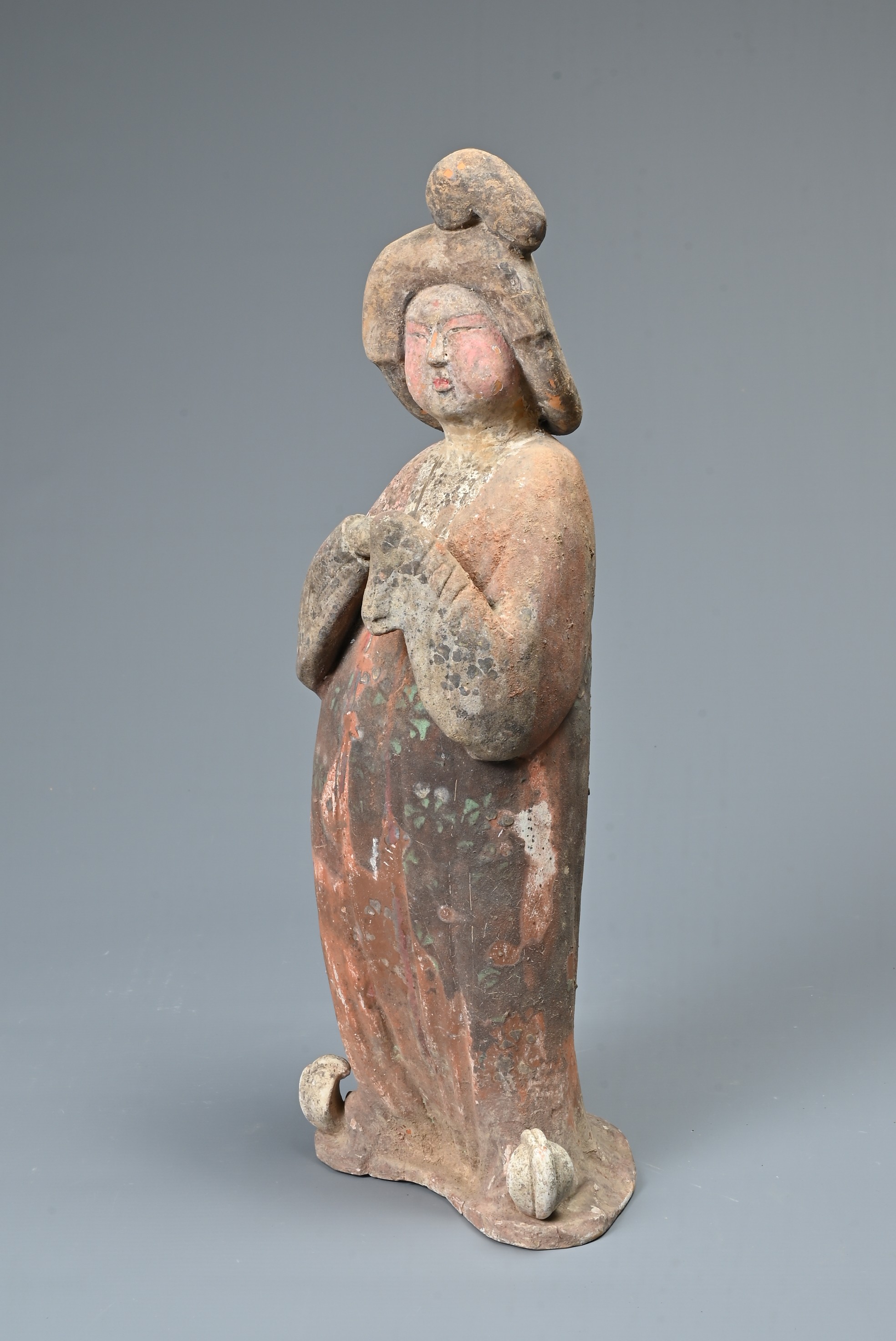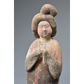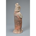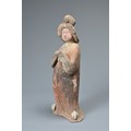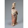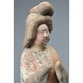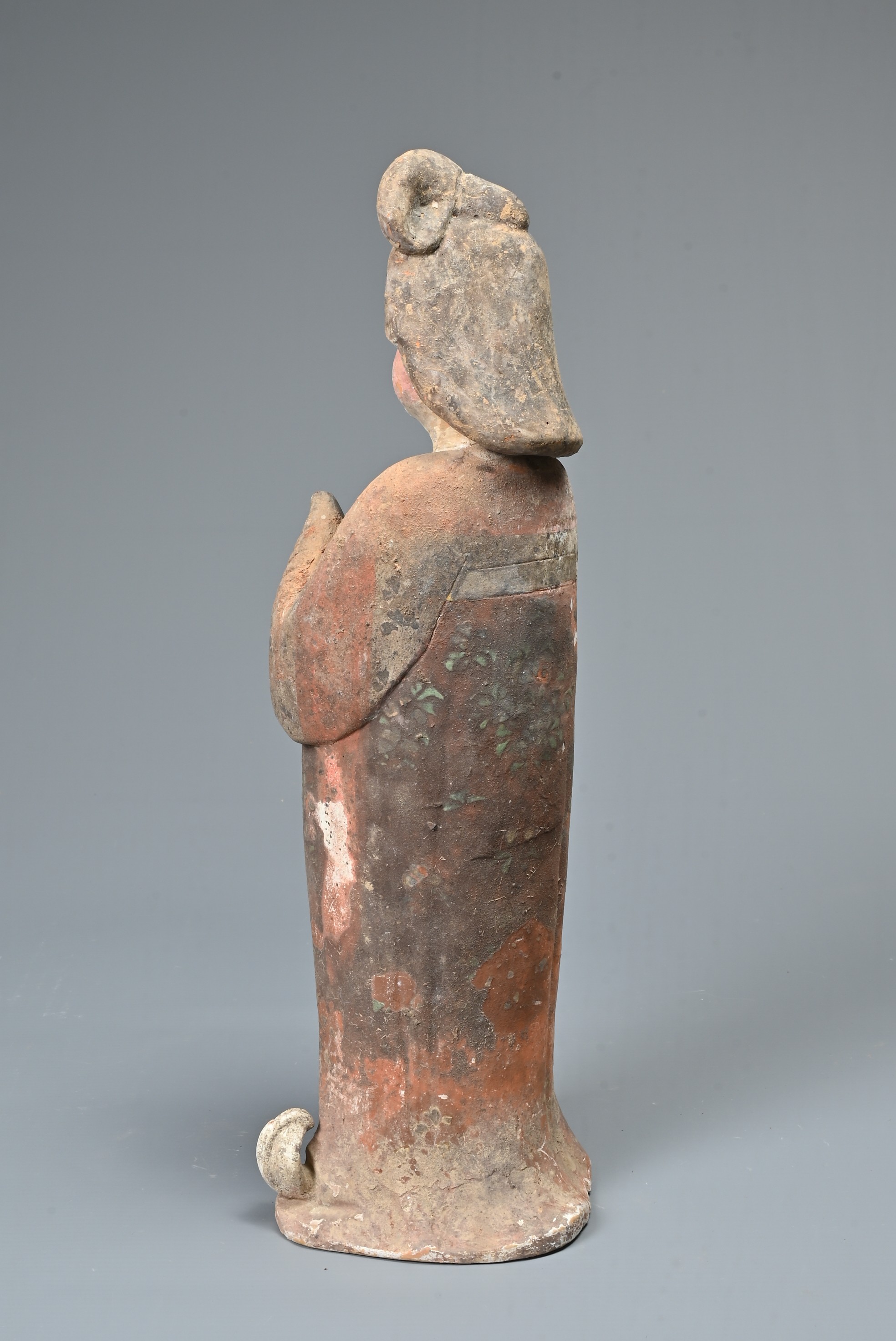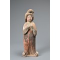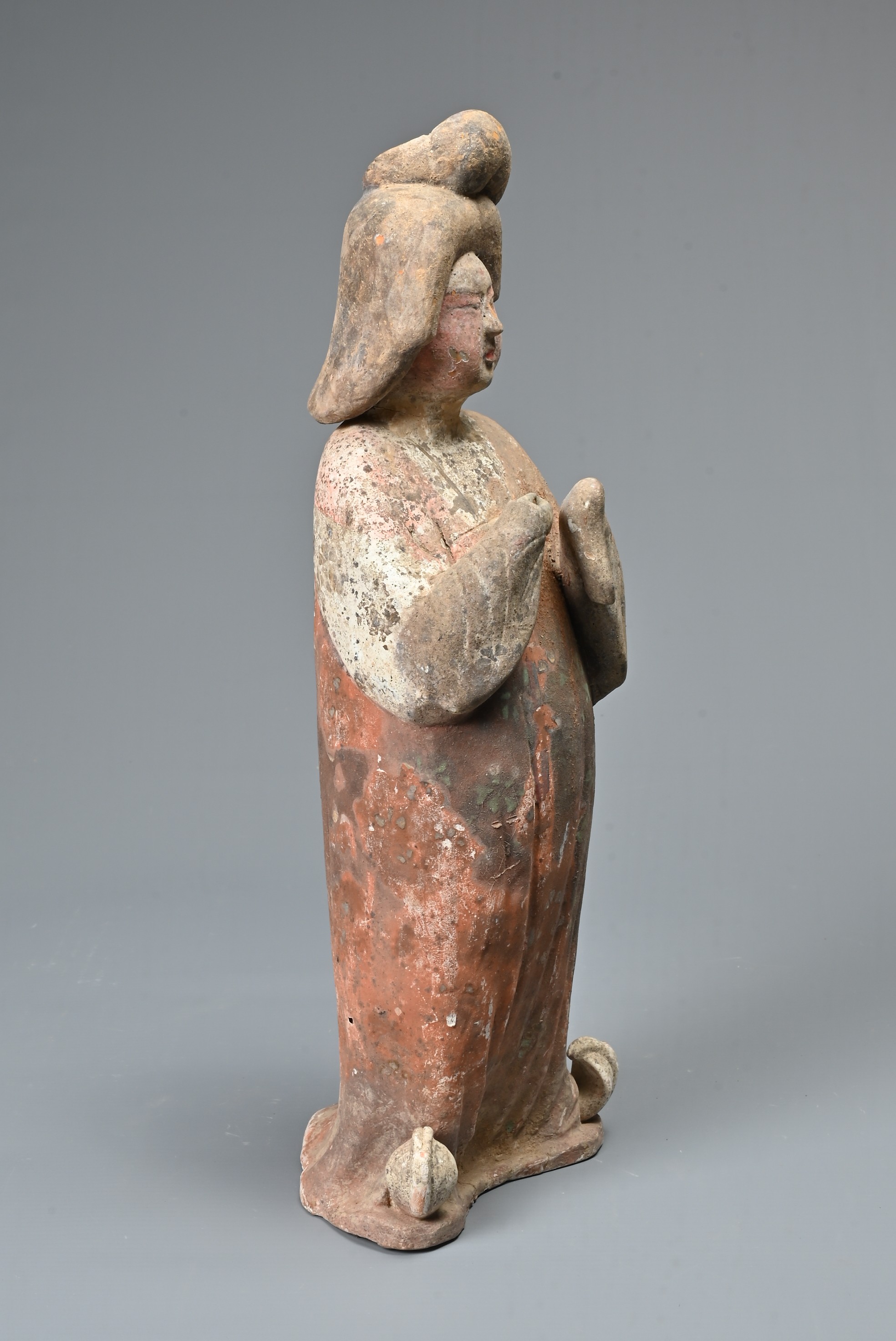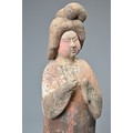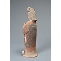 A FINE CHINESE PAINTED POTTERY FEMALE COURTIER, TANG DYNASTY. The lady wears a voluminous long-sleeved robe. Both forearms and hands are raised, her left hand remaining within the long sleeve whilst her right hand is exposed revealing her delicate small fingers. Note also the elaborate hairstyle, the facial features and the footwear protruding from the hem of her robe. It is made from a reddish-brown pottery and is relatively highly-fired. Height 35 cm (13.75 inches). Tang Dynasty AD 618 - 906. A fine example of its type. Bought from Brian Page Antiques in 2016 (with documentation).