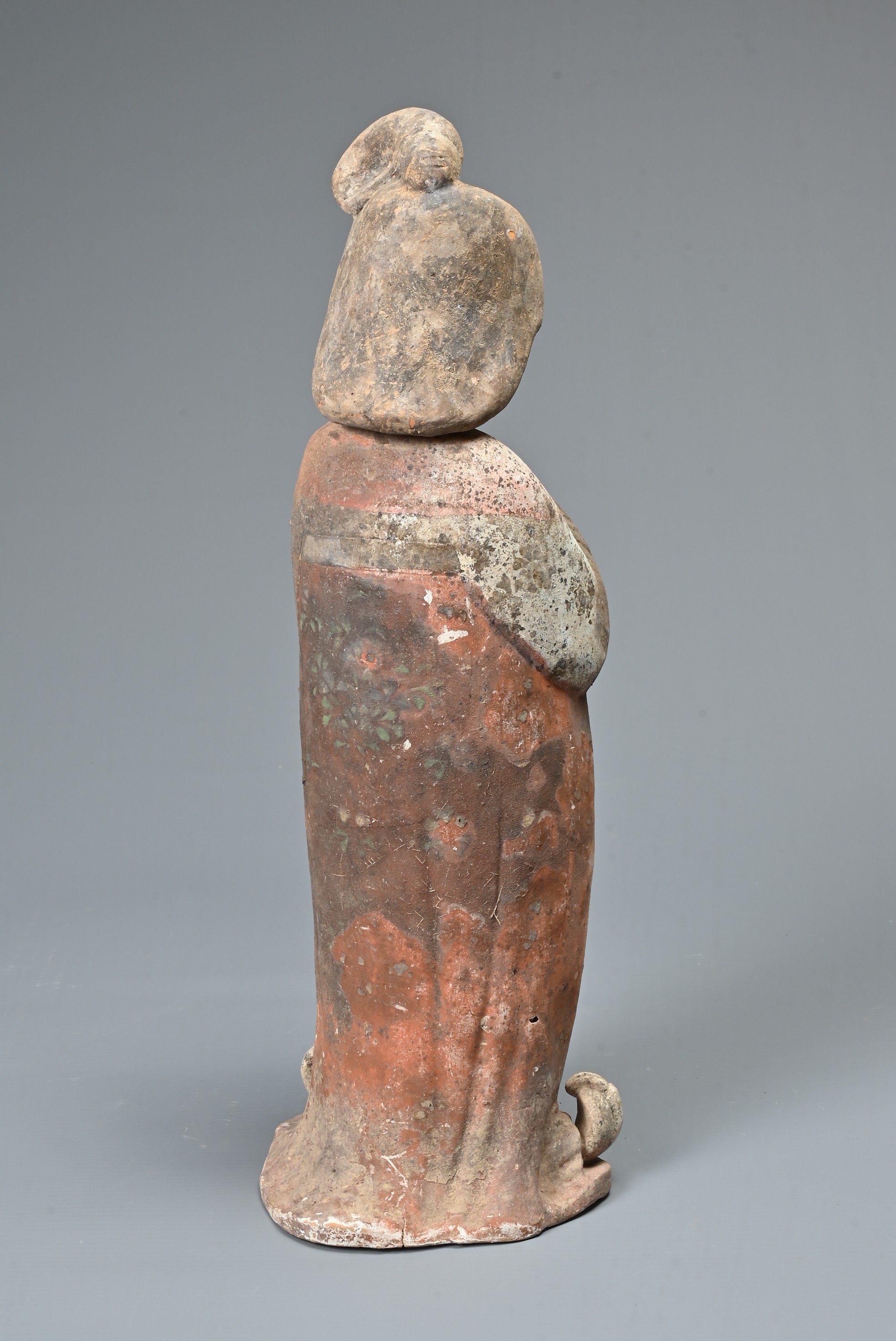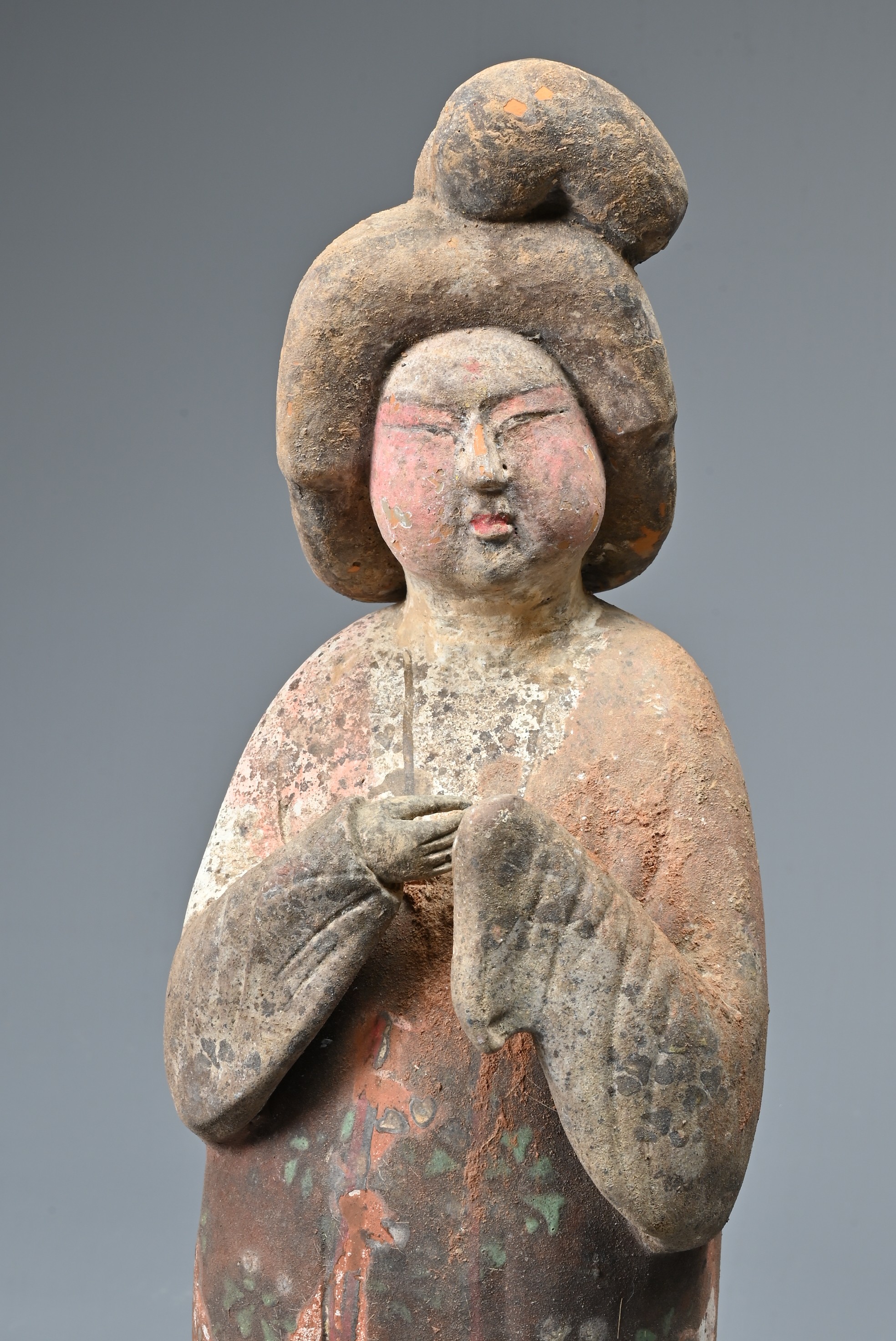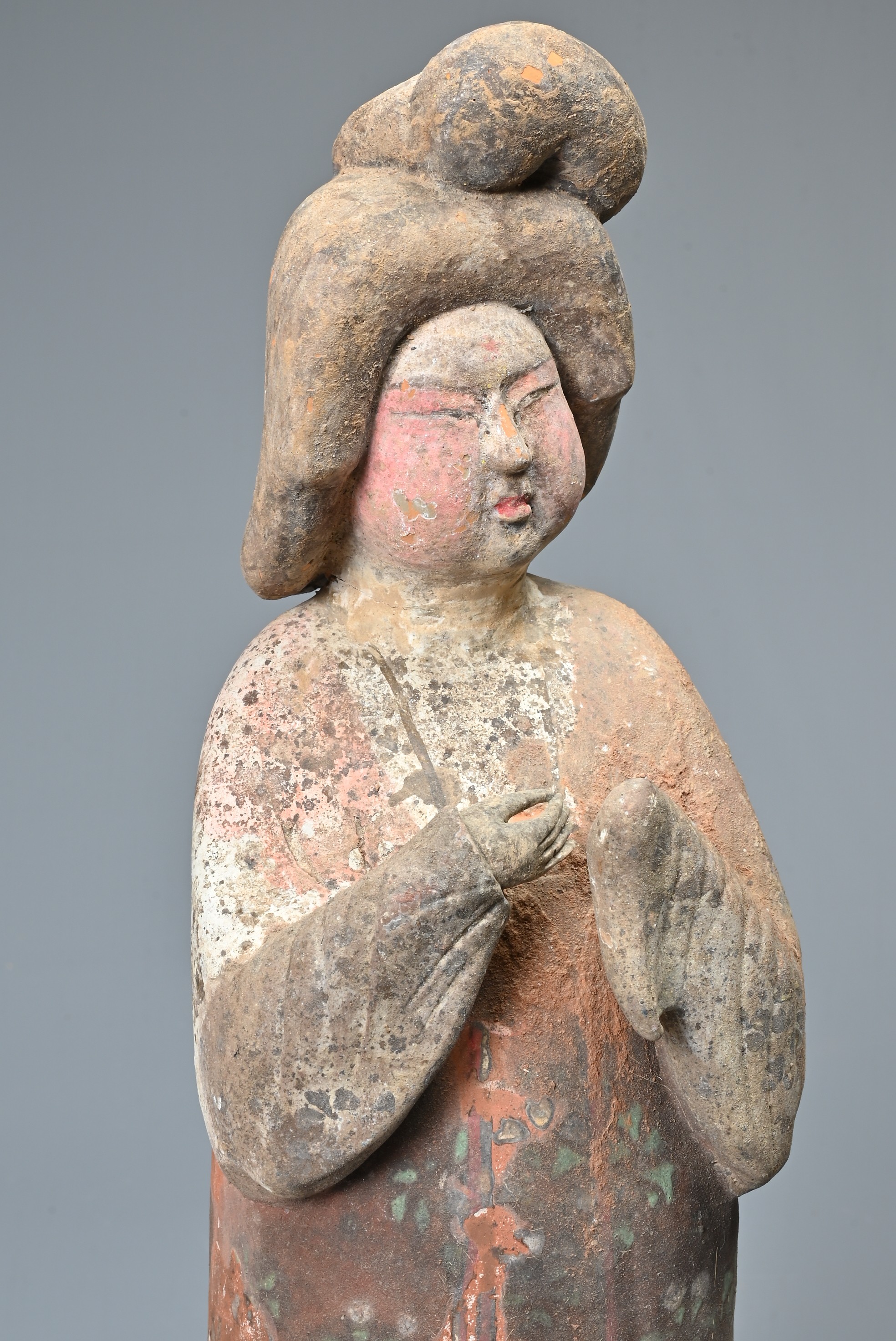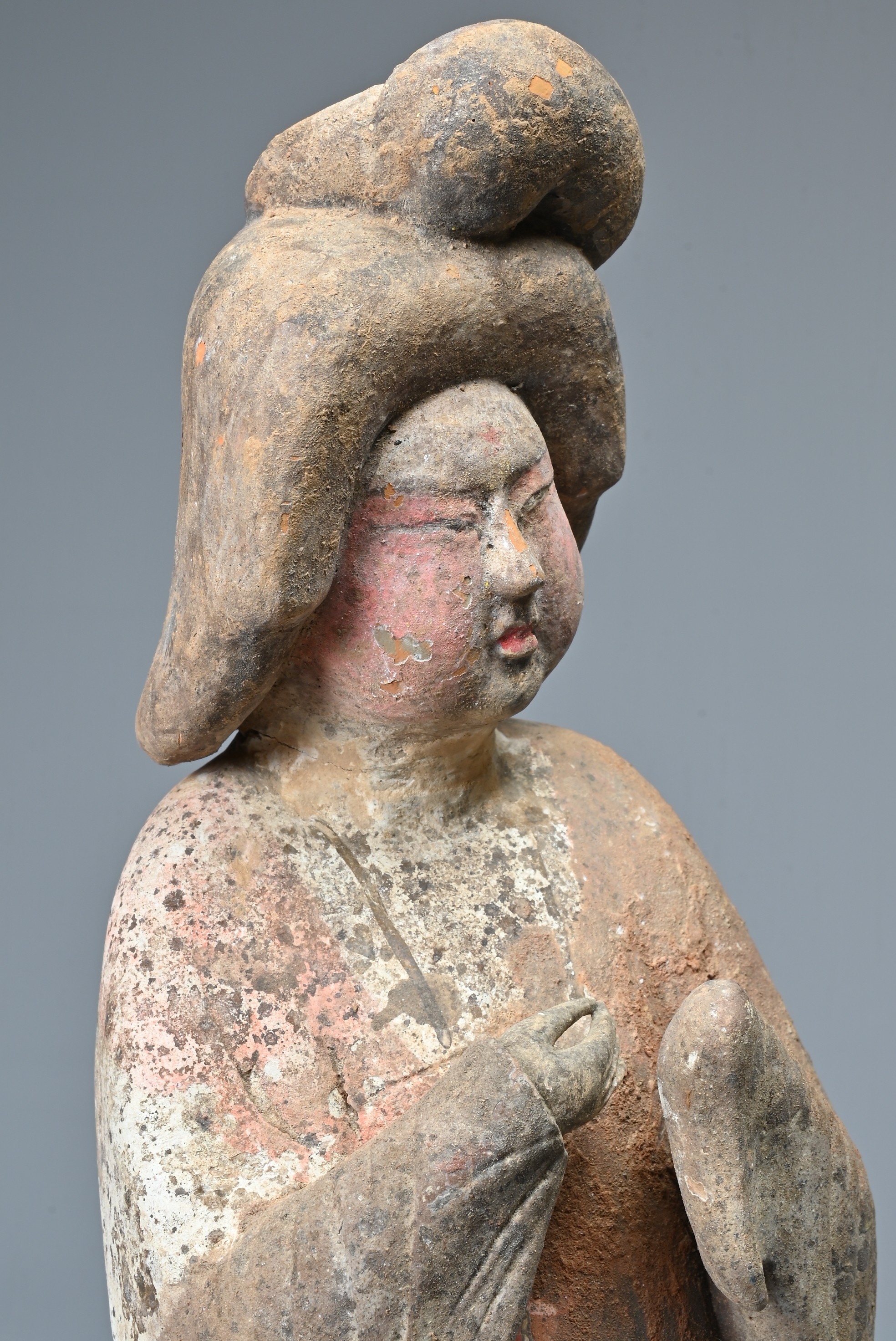 A FINE CHINESE PAINTED POTTERY FEMALE COURTIER, TANG DYNASTY. The lady wears a voluminous long-sleeved robe. Both forearms and hands are raised, her left hand remaining within the long sleeve whilst her right hand is exposed revealing her delicate small fingers. Note also the elaborate hairstyle, the facial features and the footwear protruding from the hem of her robe. It is made from a reddish-brown pottery and is relatively highly-fired. Height 35 cm (13.75 inches). Tang Dynasty AD 618 - 906. A fine example of its type. Bought from Brian Page Antiques in 2016 (with documentation).