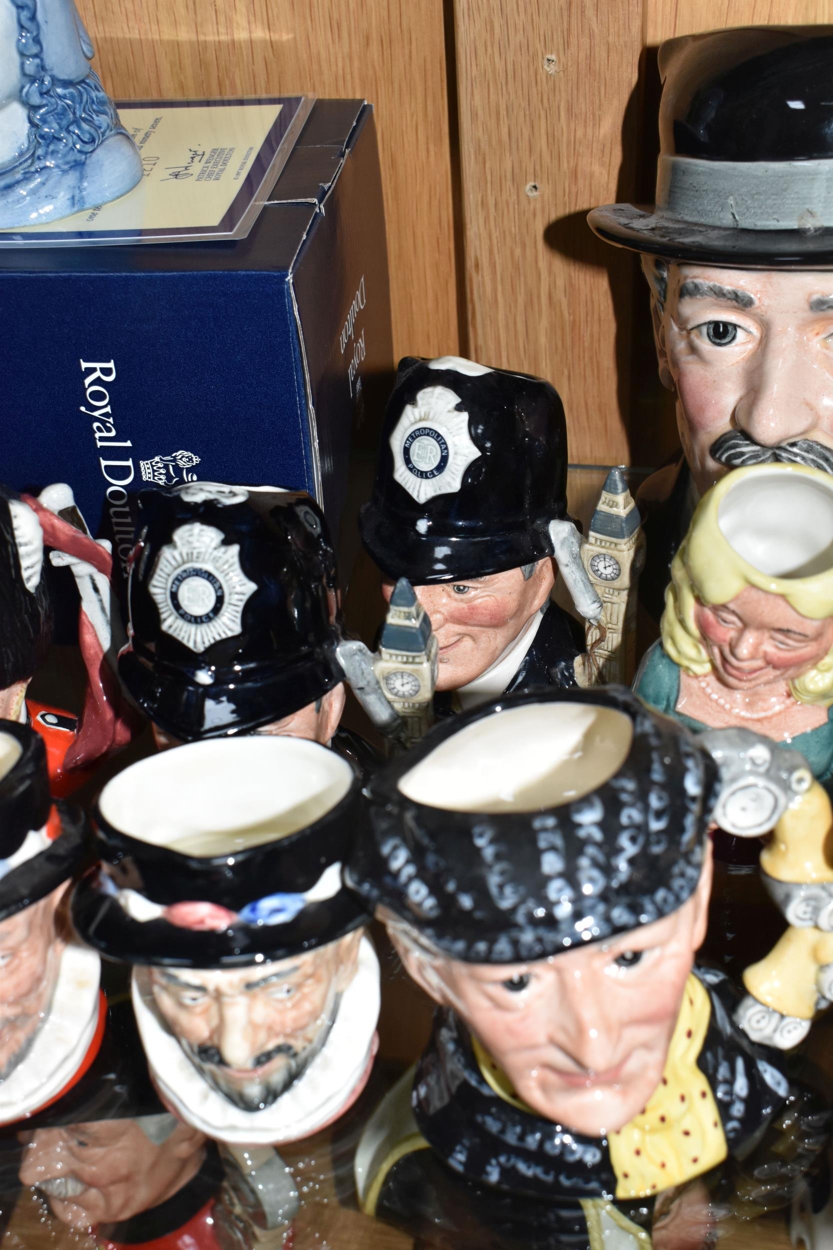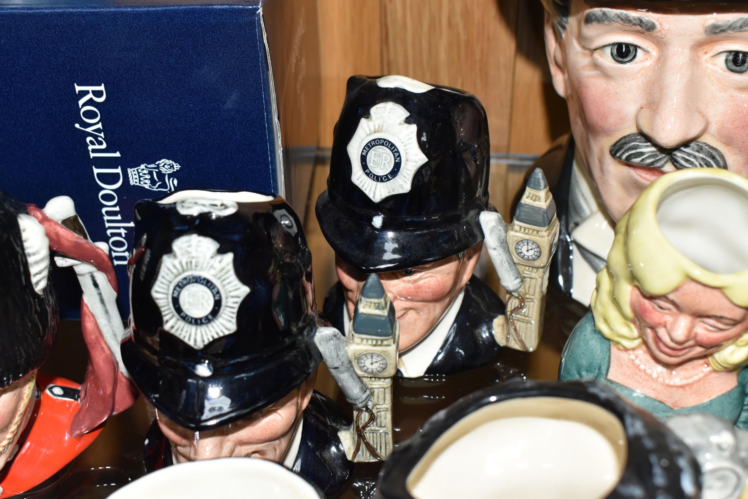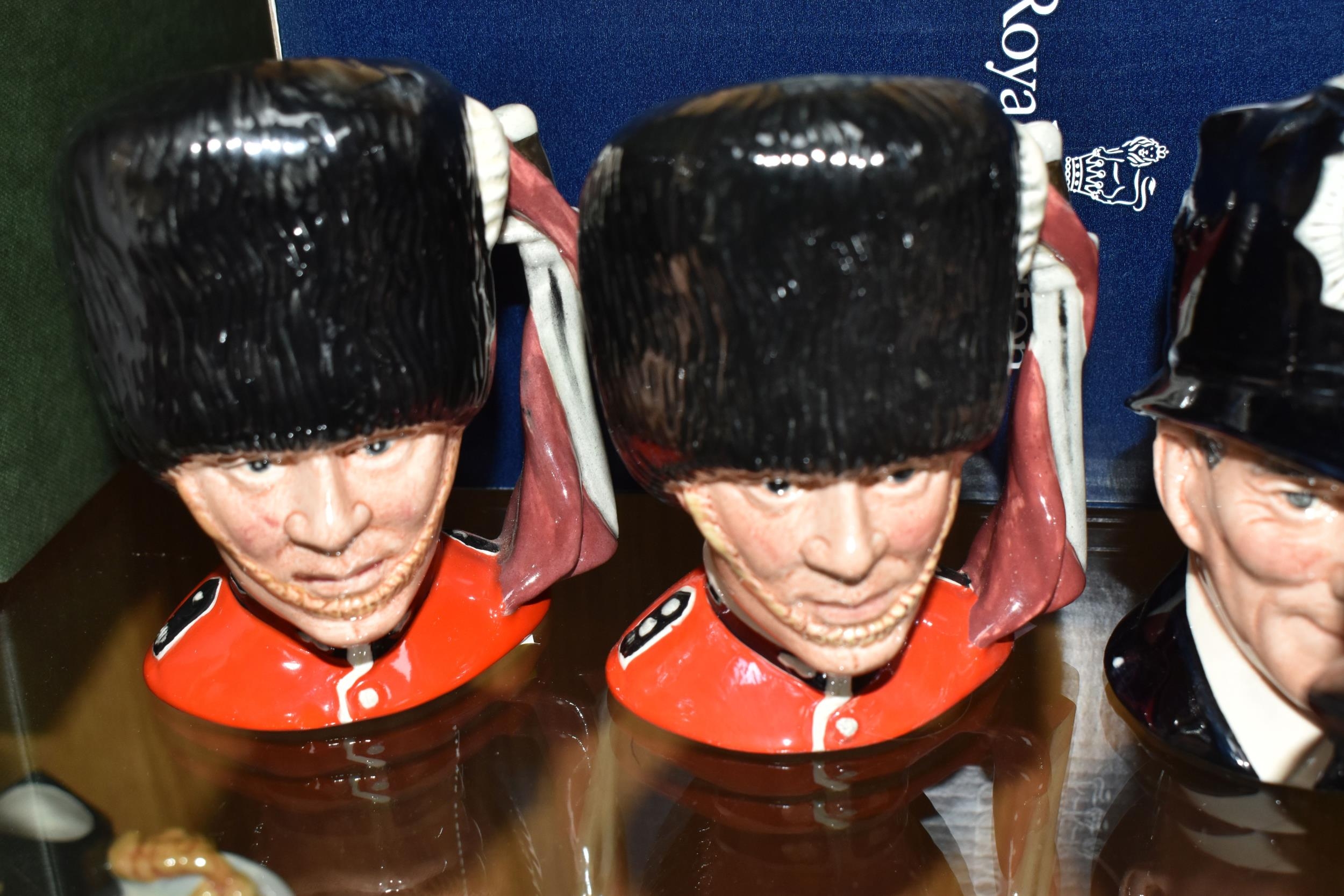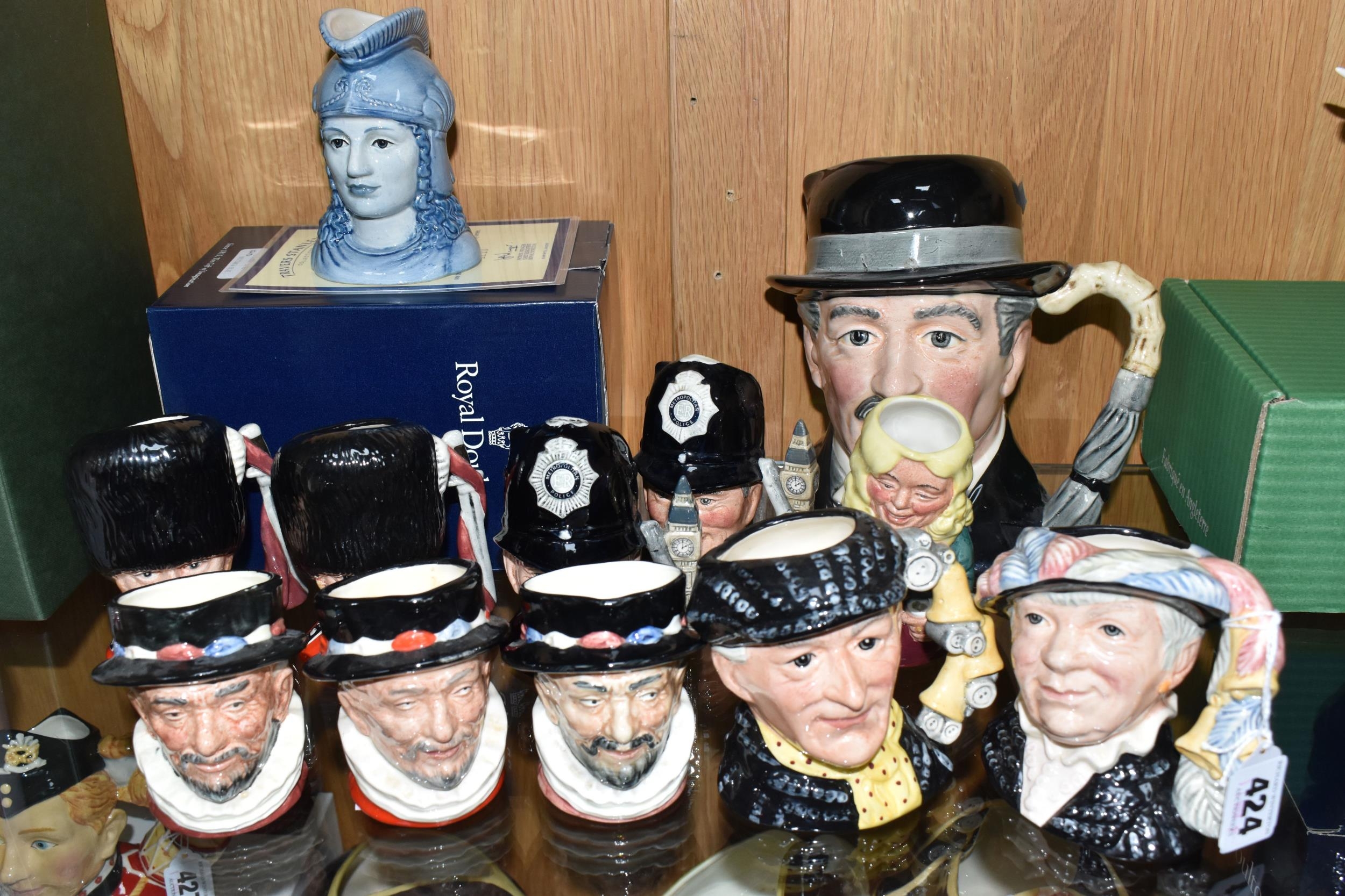 TWELVE ROYAL DOULTON CHARACTER JUGS, with a London/Great Britain theme, comprising a boxed 'Great Britain's Britannia' D7107, a Travers Stanley Collections limited edition 1210/1997 with certificate, large City Gent D6815, Pearly King D6844, Pearly Queen D6843, Betty Bitters the Barmaid D6716 from The Doultonville Collection, two x Beefeater D6233, Beefeater D6206, two x The Guardsman D6771 (both marked as second quality) and two x The London 'Bobby' D6762 (one marked second quality) (12) (Condition Report: pieces appear in good condition with no obvious damage, second quality pieces as stated)