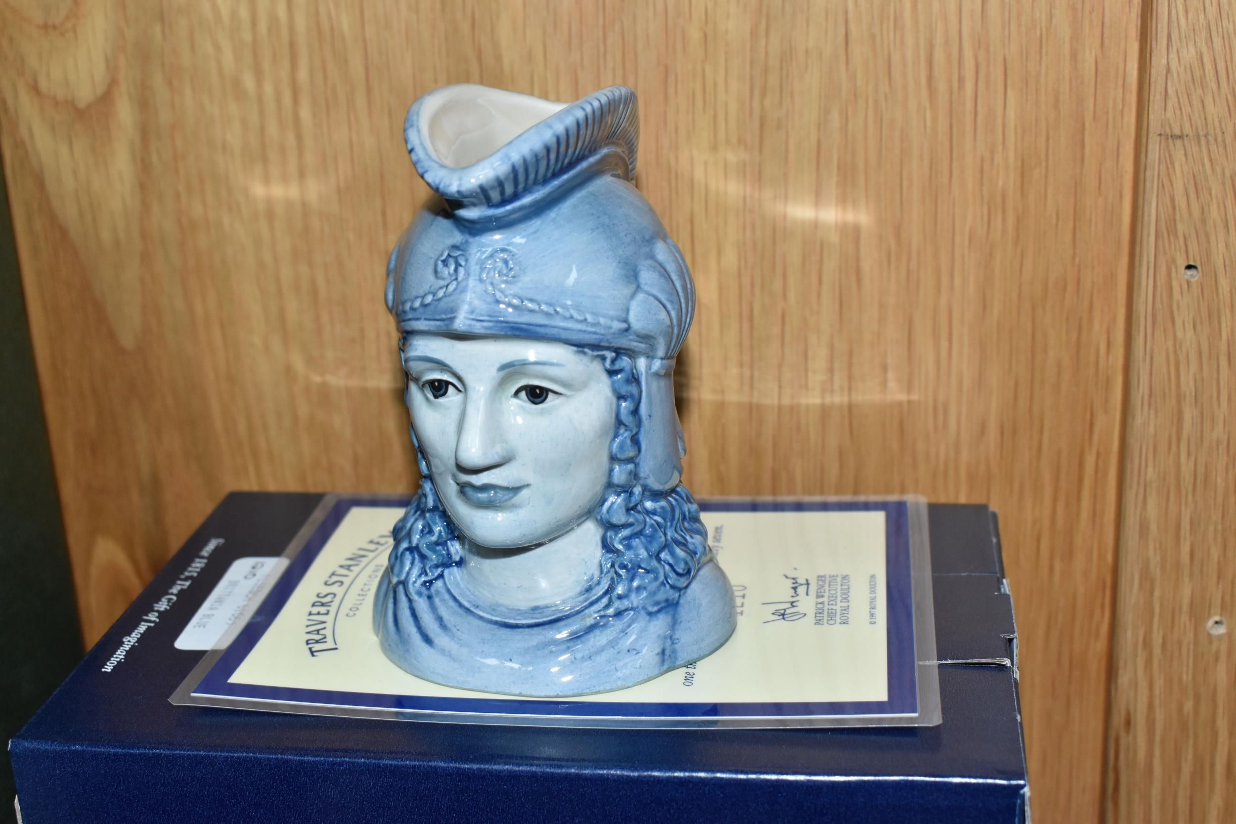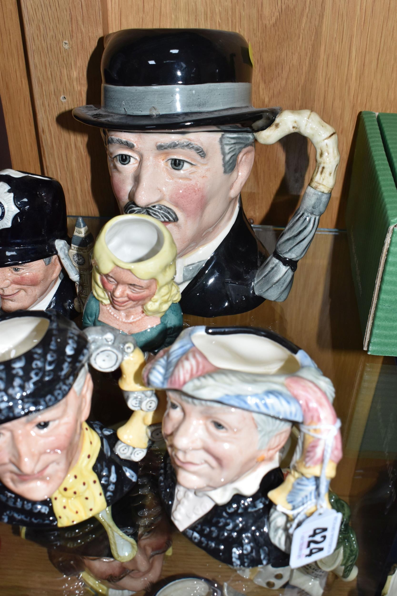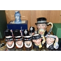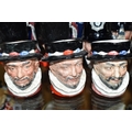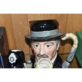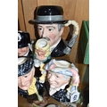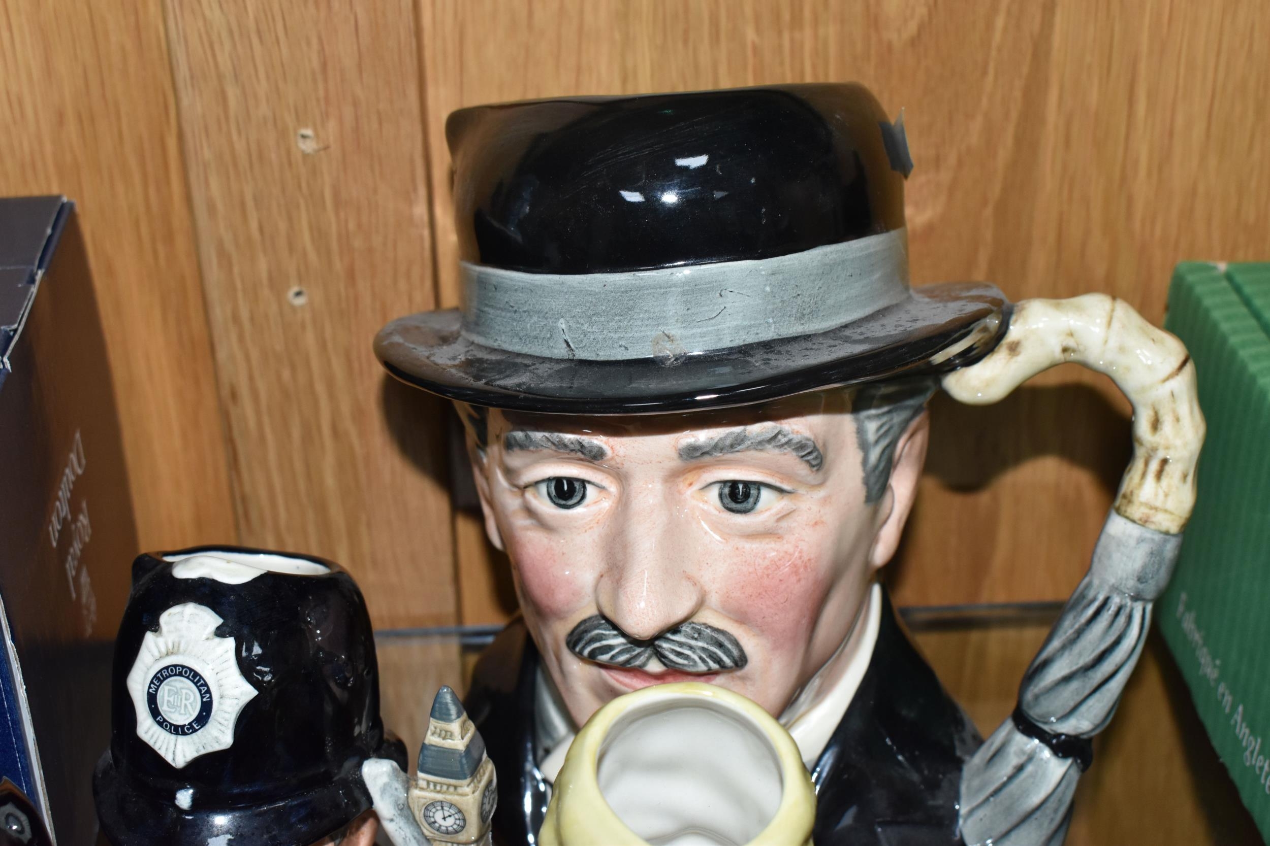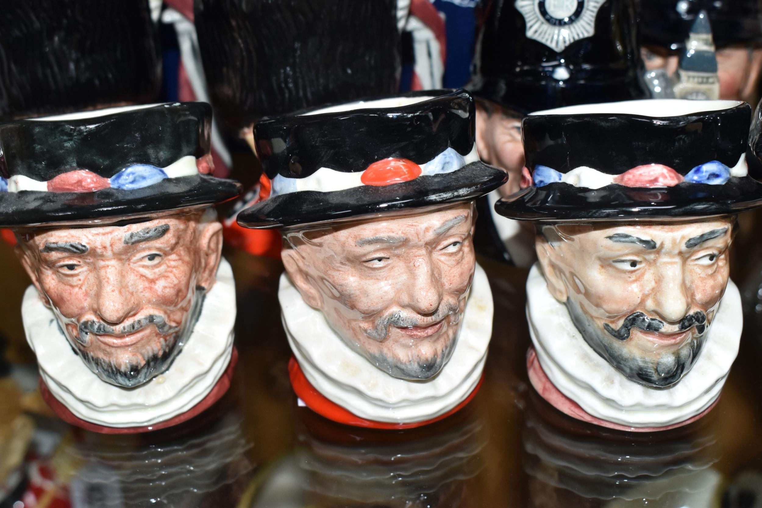 TWELVE ROYAL DOULTON CHARACTER JUGS, with a London/Great Britain theme, comprising a boxed 'Great Britain's Britannia' D7107, a Travers Stanley Collections limited edition 1210/1997 with certificate, large City Gent D6815, Pearly King D6844, Pearly Queen D6843, Betty Bitters the Barmaid D6716 from The Doultonville Collection, two x Beefeater D6233, Beefeater D6206, two x The Guardsman D6771 (both marked as second quality) and two x The London 'Bobby' D6762 (one marked second quality) (12) (Condition Report: pieces appear in good condition with no obvious damage, second quality pieces as stated)