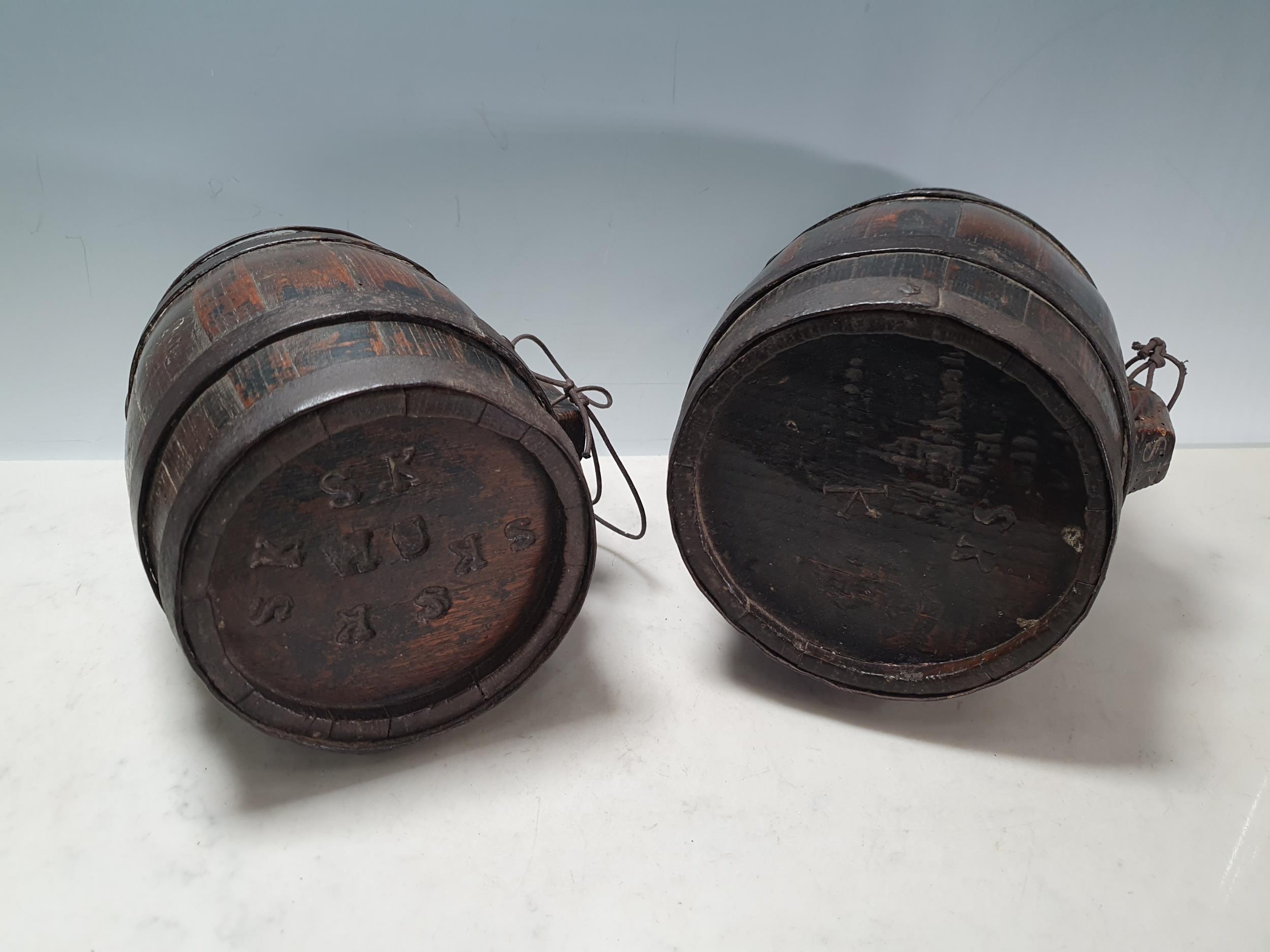 Two 18th Century oak Costrels both bearing the initials "S.K", largest measures 9.5in (R6).