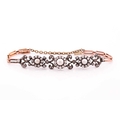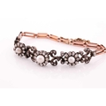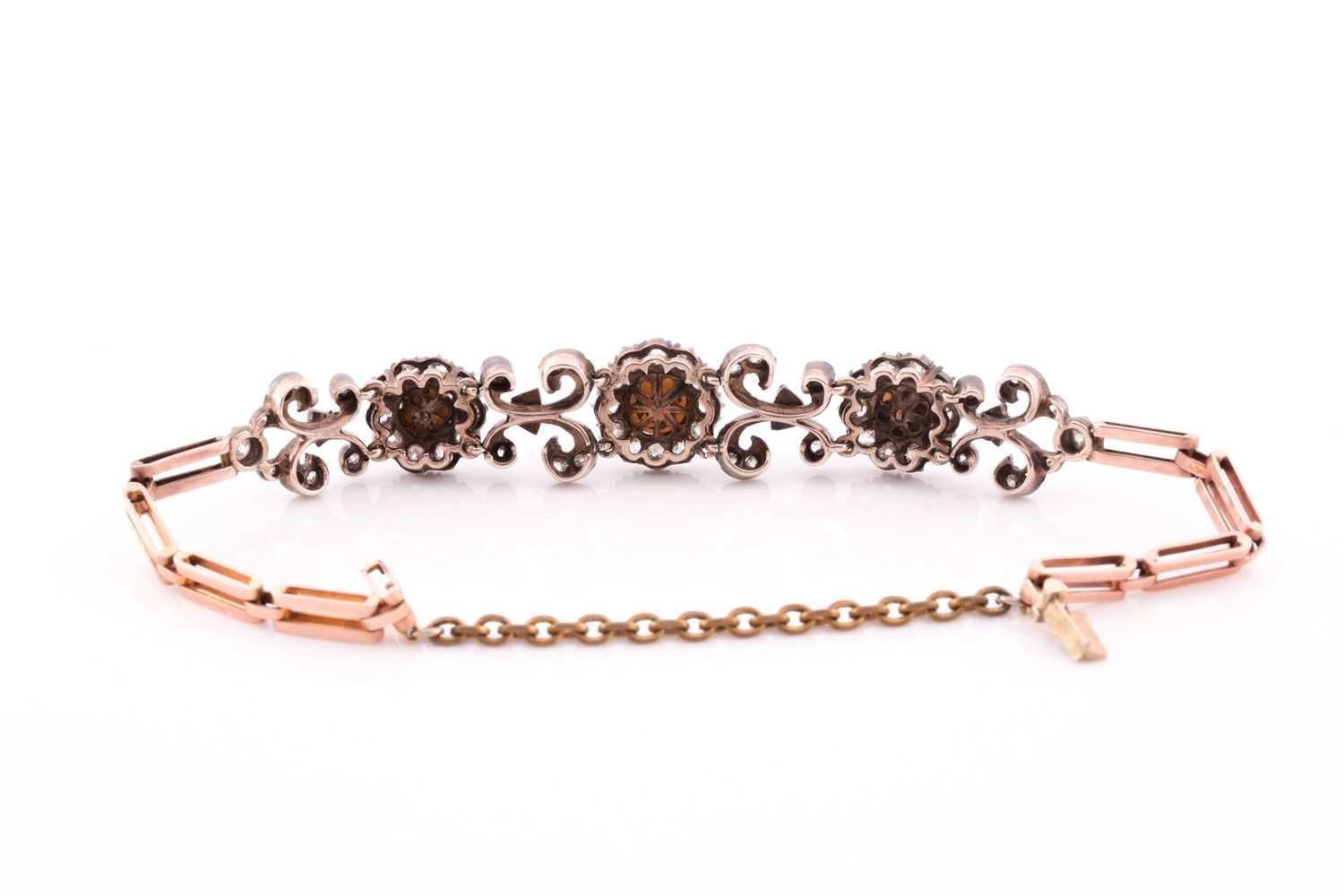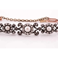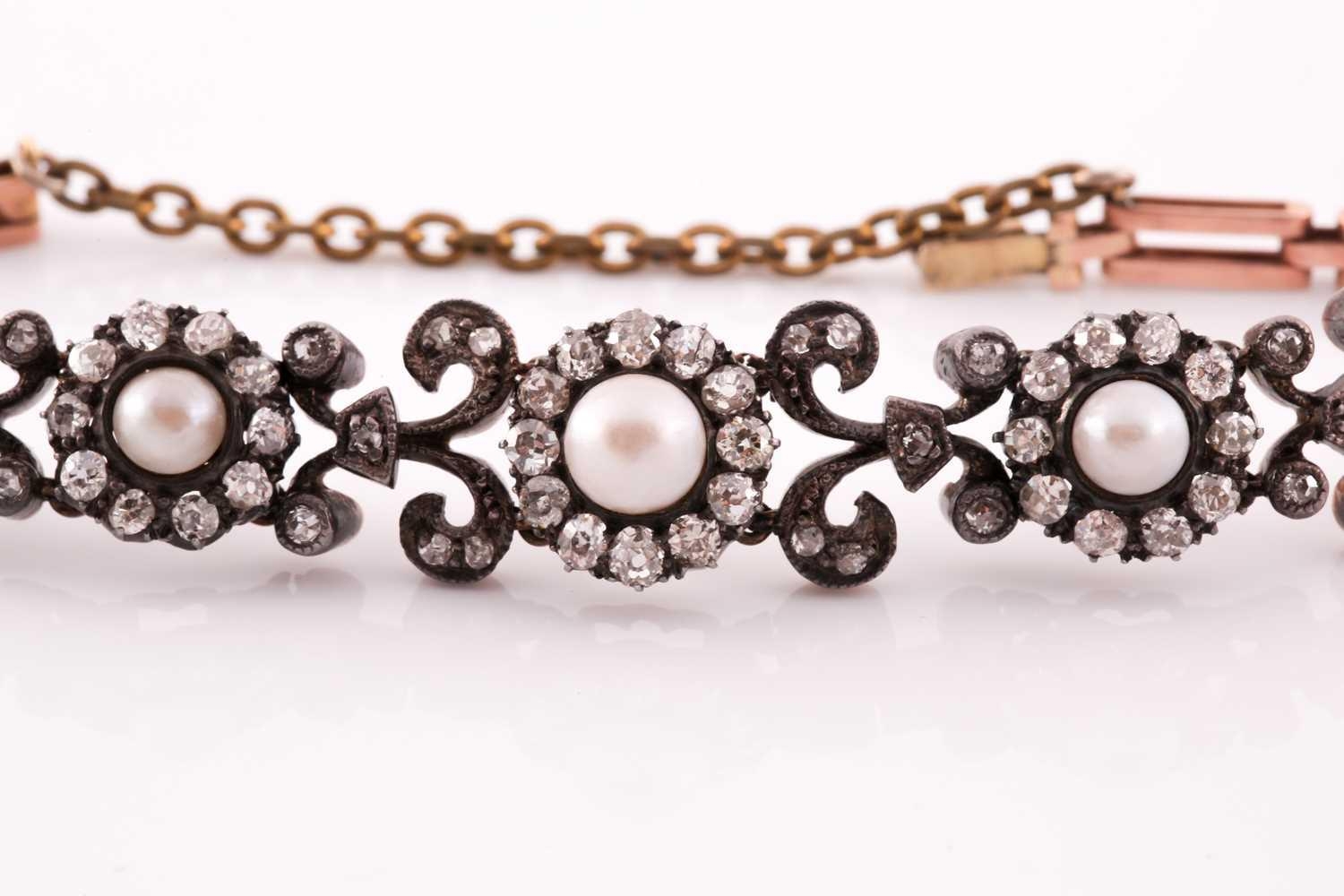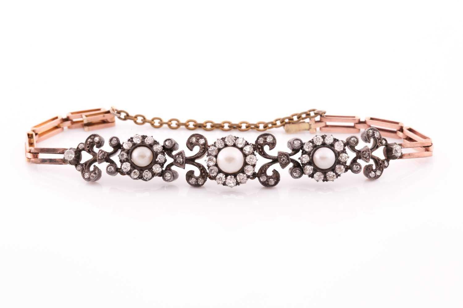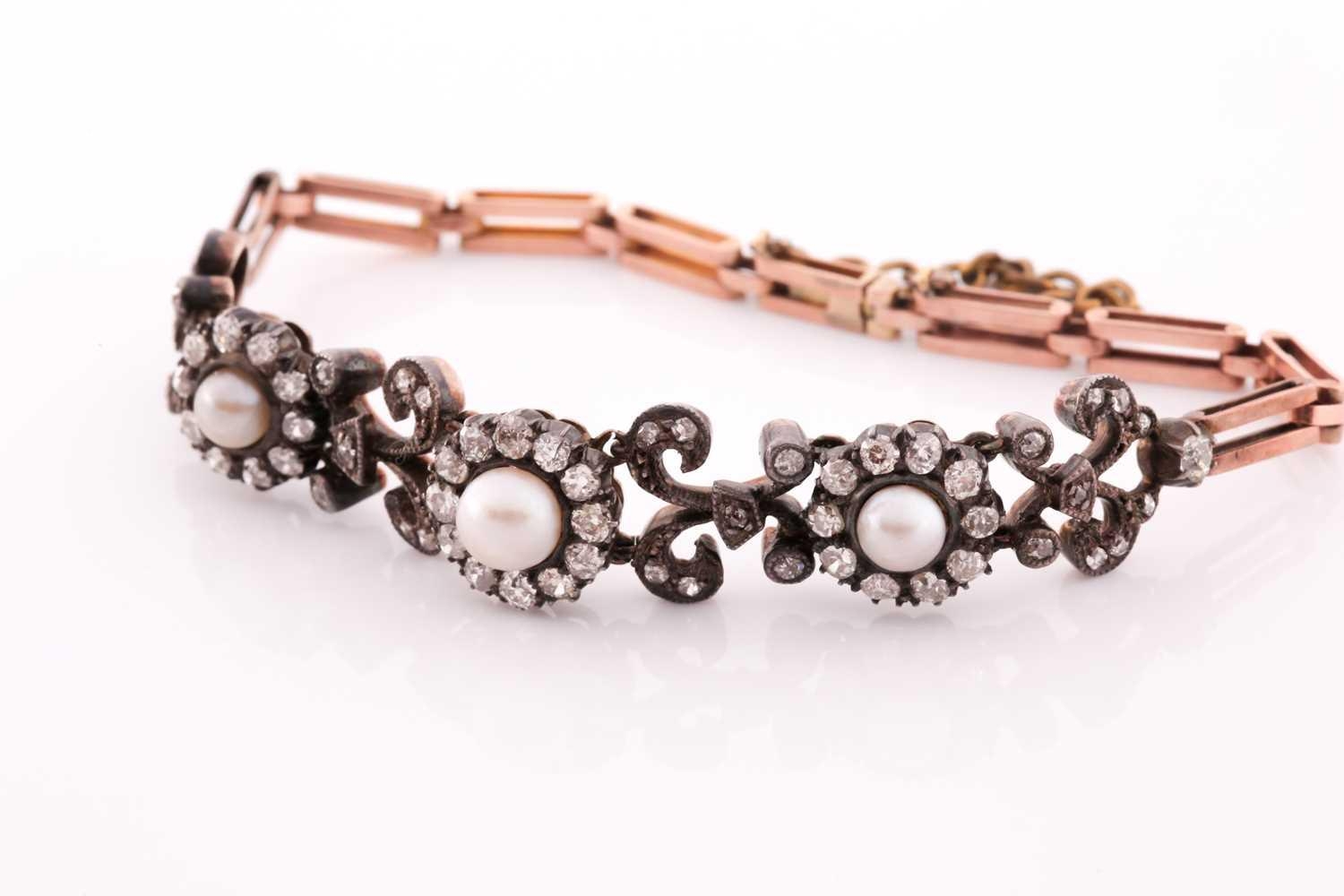 A late 19th / early 20th century diamond bracelet, set with three clusters of old-cut diamonds centred with pearls, with articulated diamond-set links, on a bar link bracelet with fitted clasp, later safety chain.