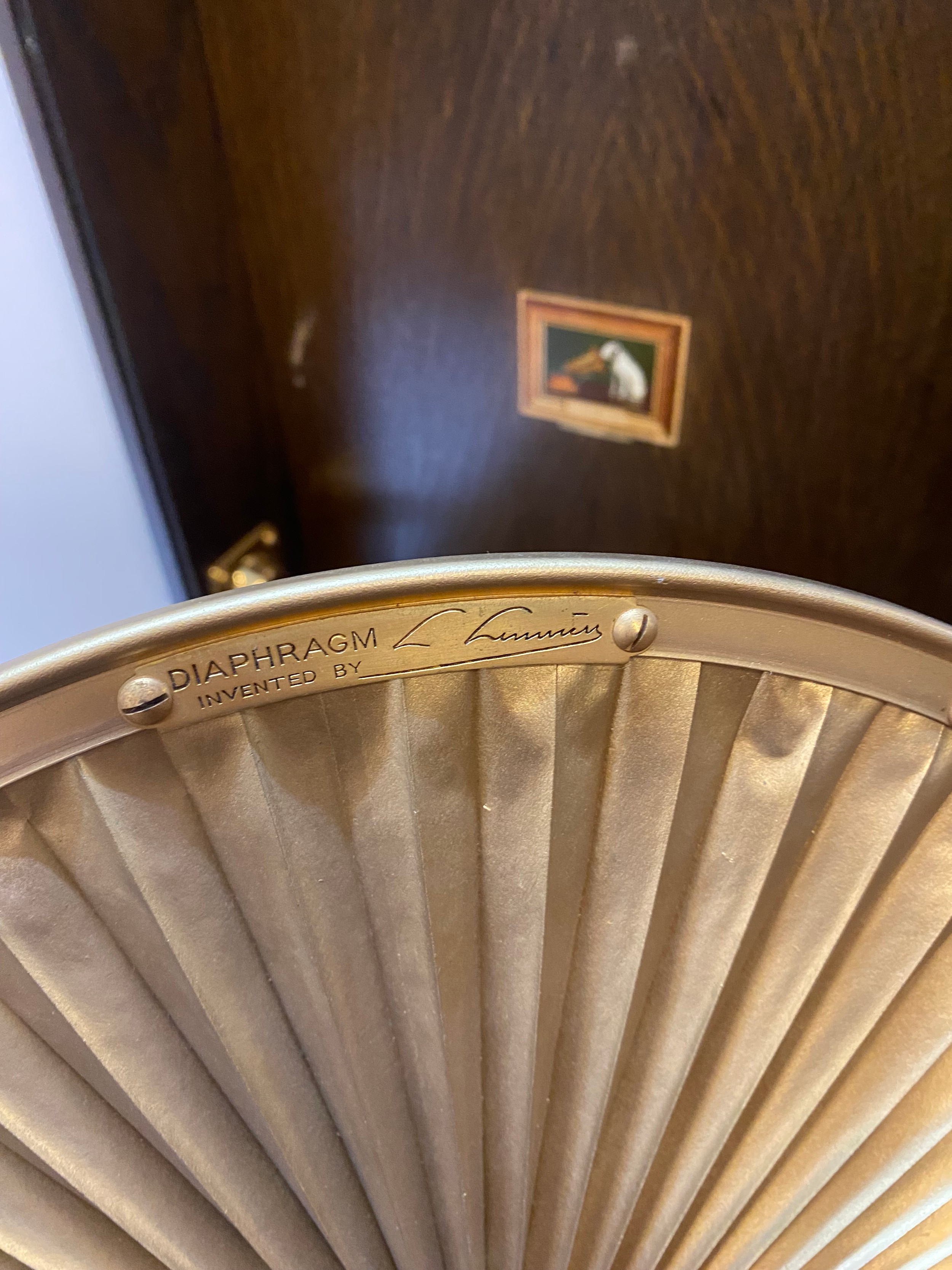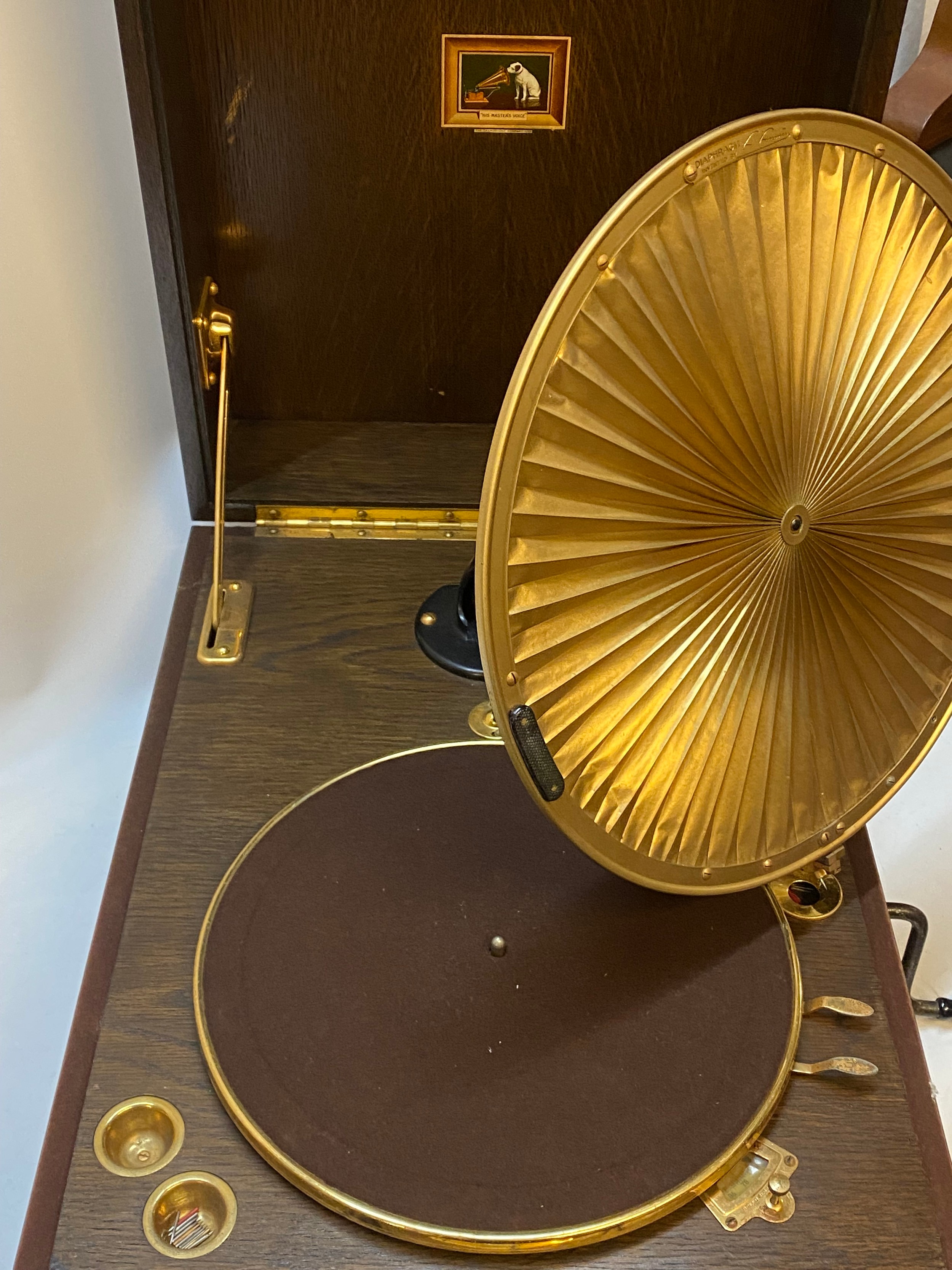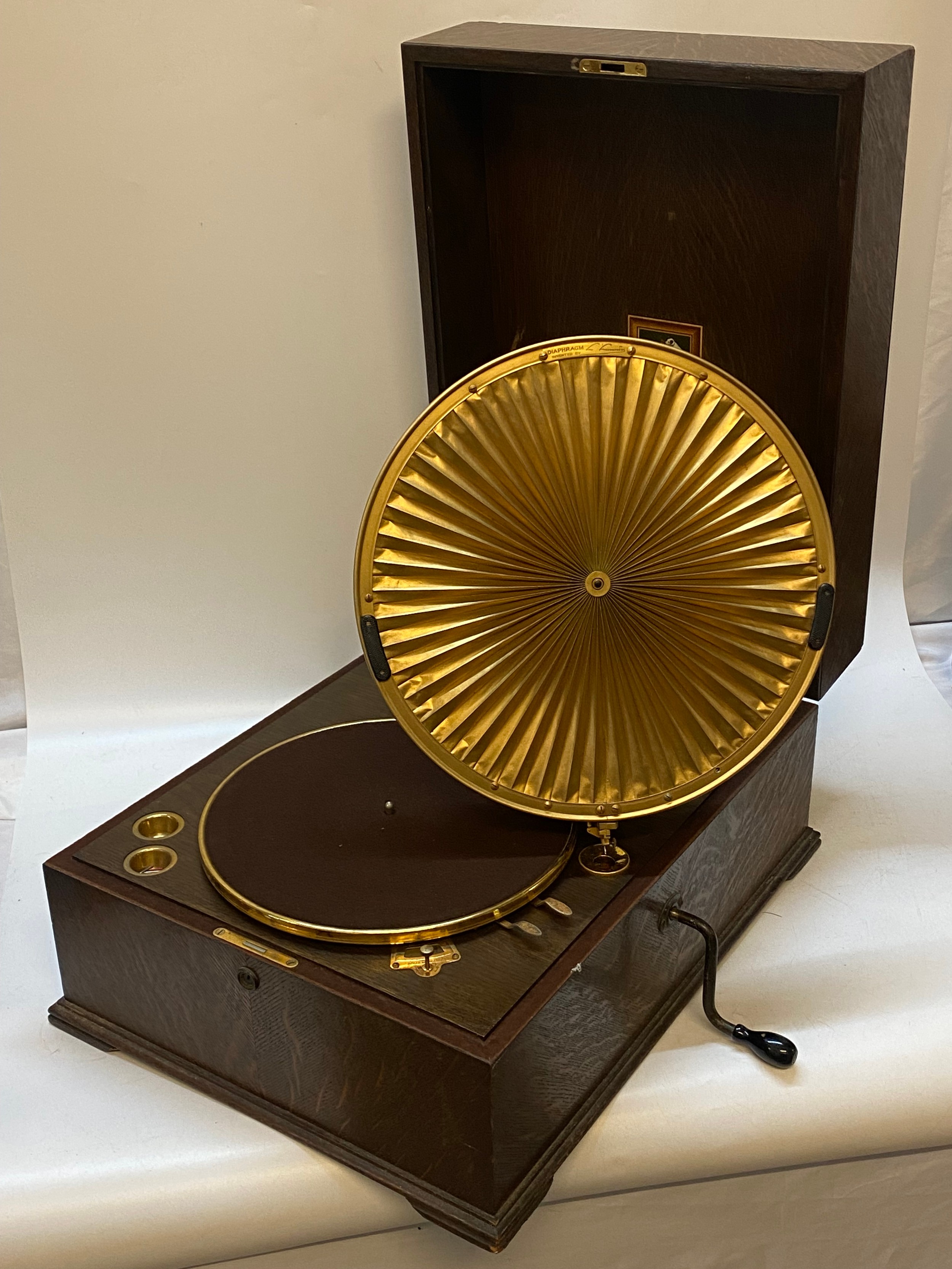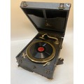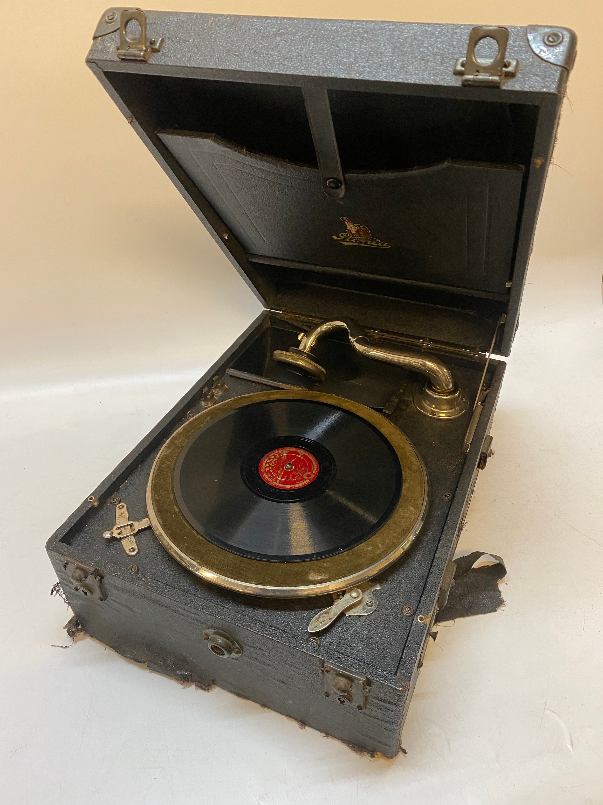 A 1920's HMV table top phonograph with Sterling Primax pleated diaphragm loudspeaker, complete with handle, in an oak case and one other portable gramophone player