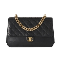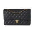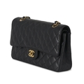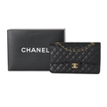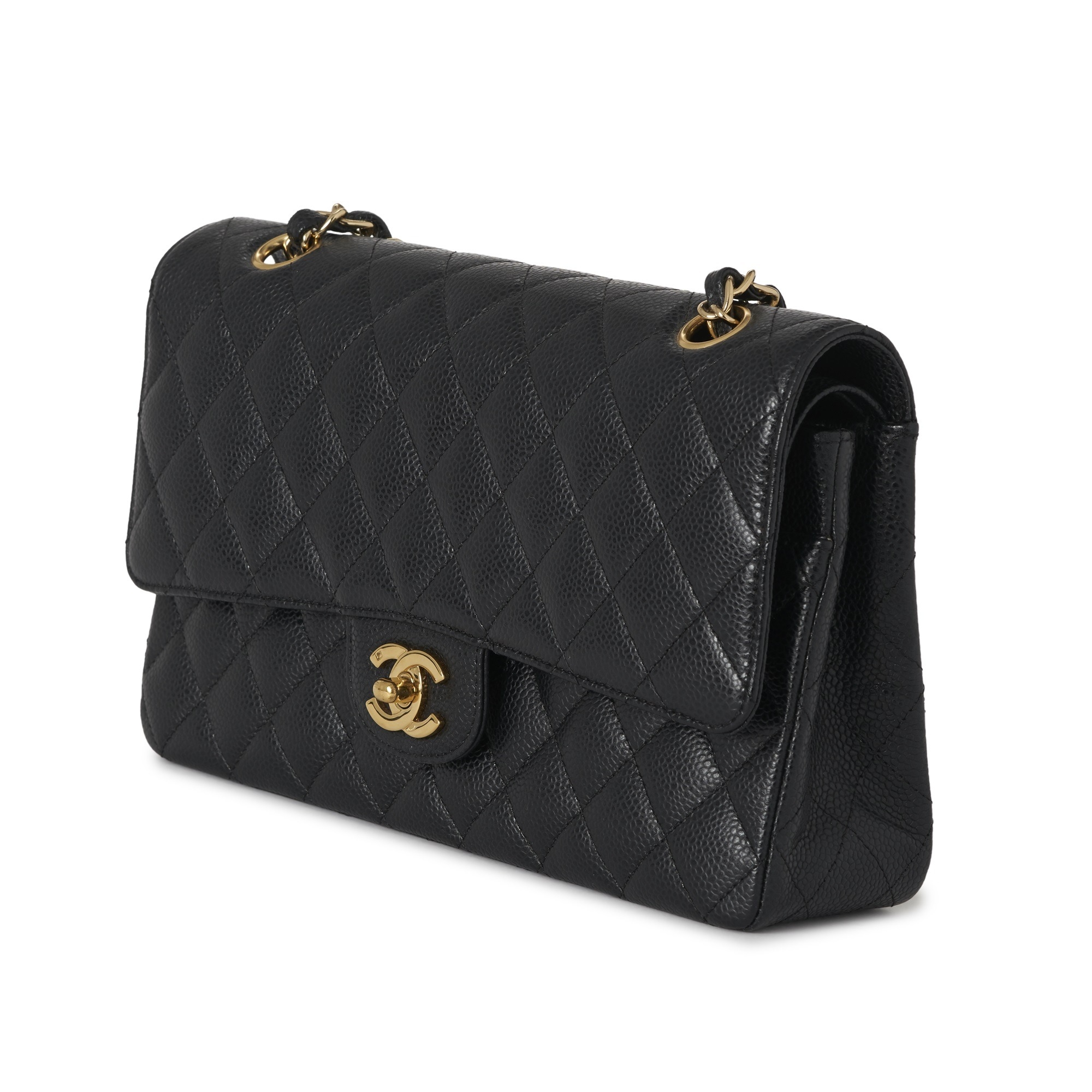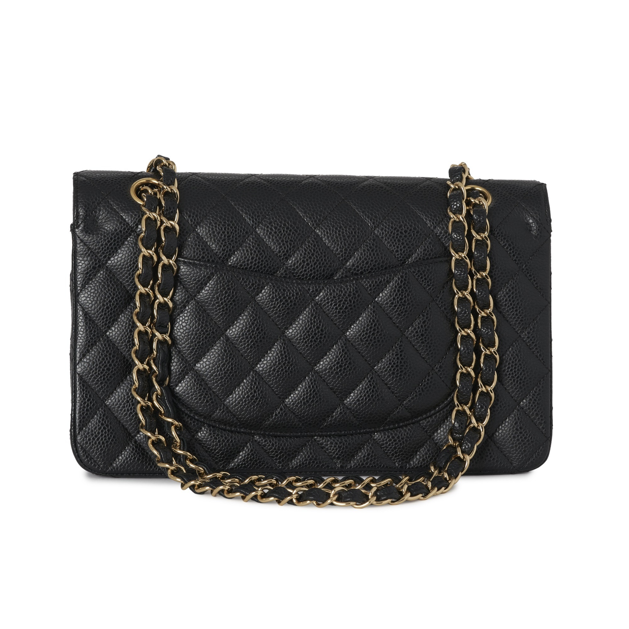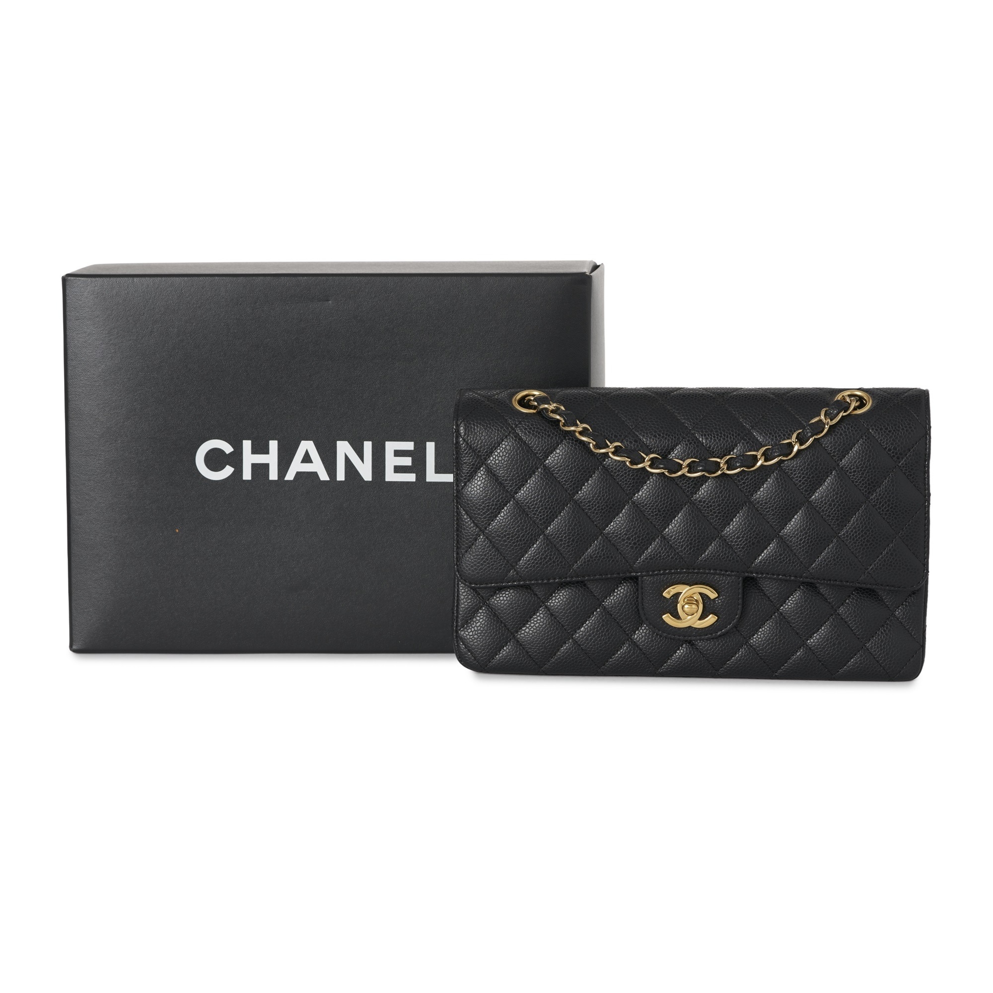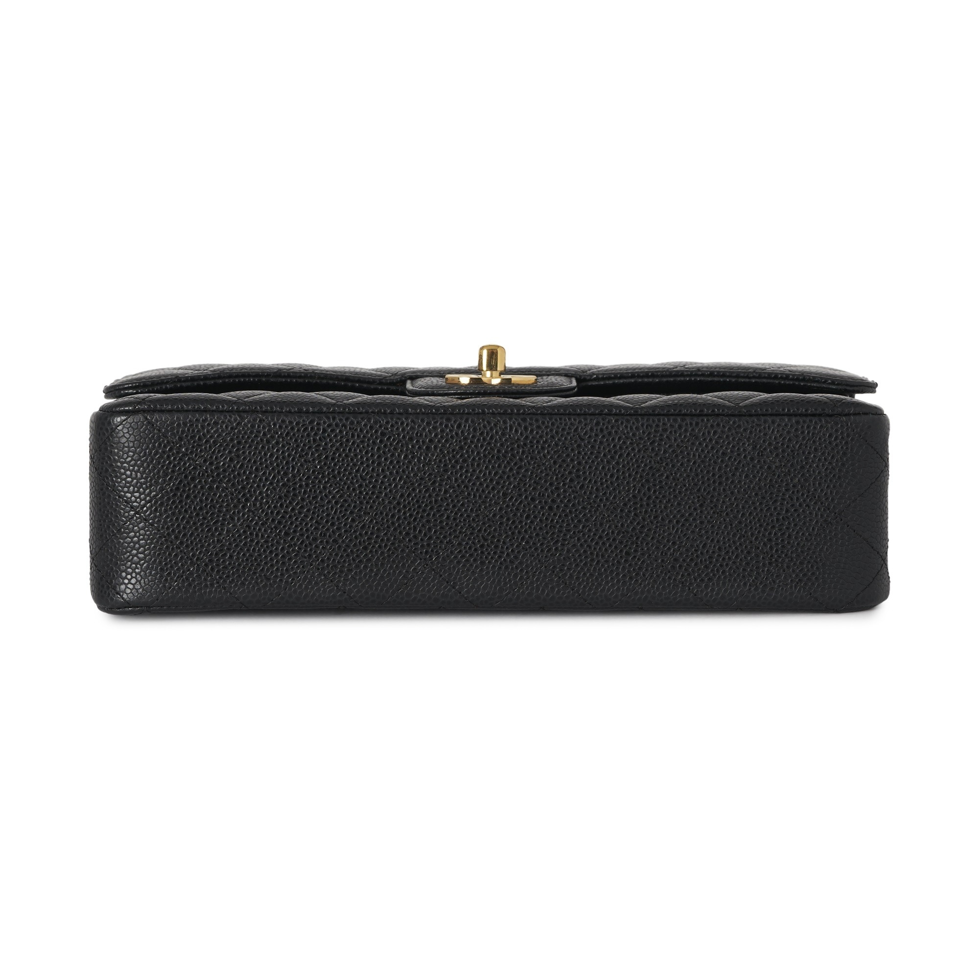 Chanel, a Medium Classic Double Flap handbag, designed with a quilted black caviar leather exterior, with 24k gold-plated hardware, a rear patch pocket, CC turn-lock fastening, double chain and interwoven leather shoulder strap, and an inner flap closure with black leather lining, measuring 6 by 15 by 25.5cm, with maker's authenticity card, care guide, dust bag and box