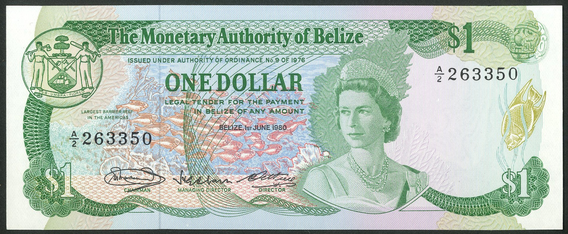 Belize, Monetary Authority, One dollar, 1-6-1980, #A/2 263350, (WPM 38), a couple of tiny dents, AU-UNC.
