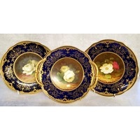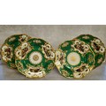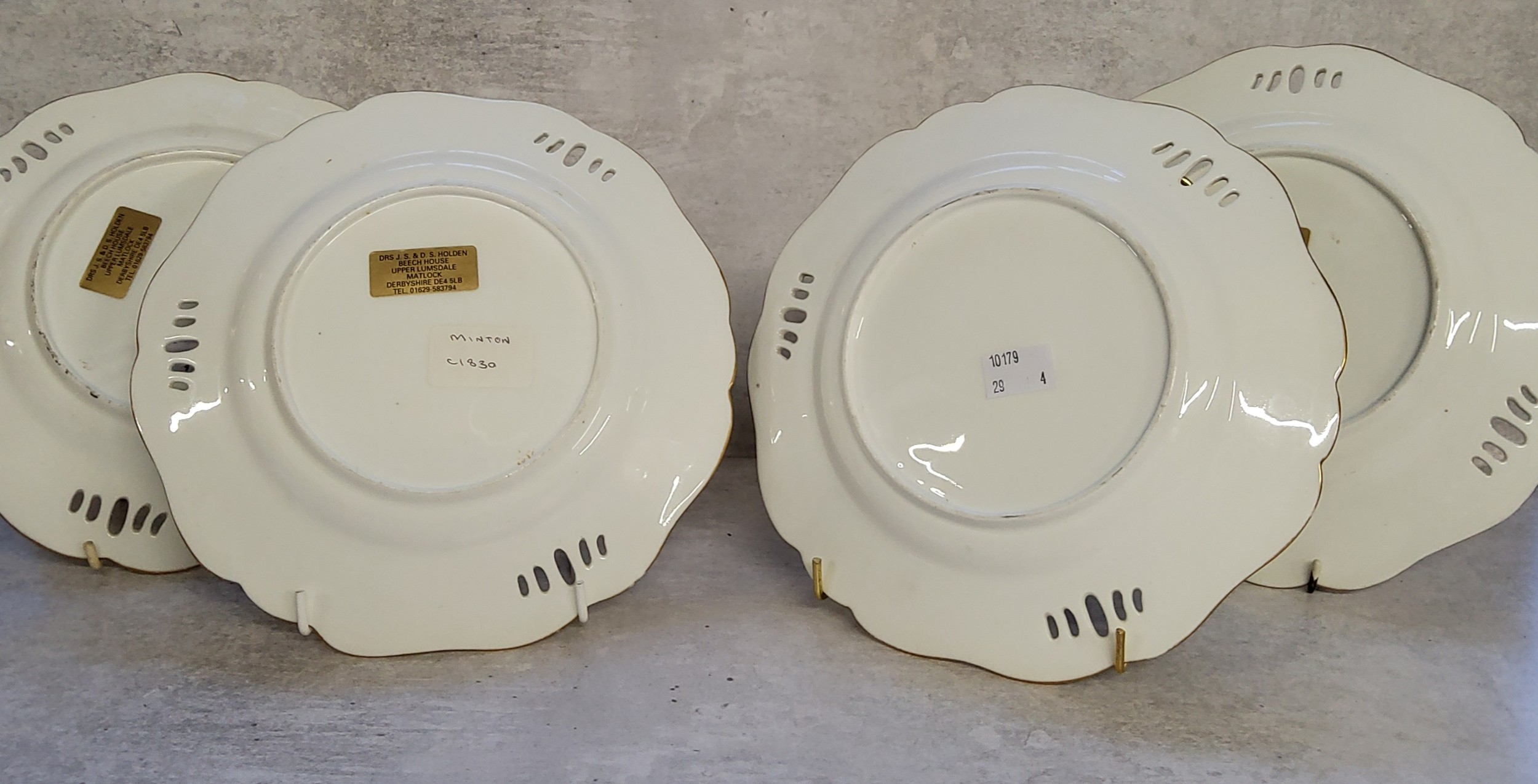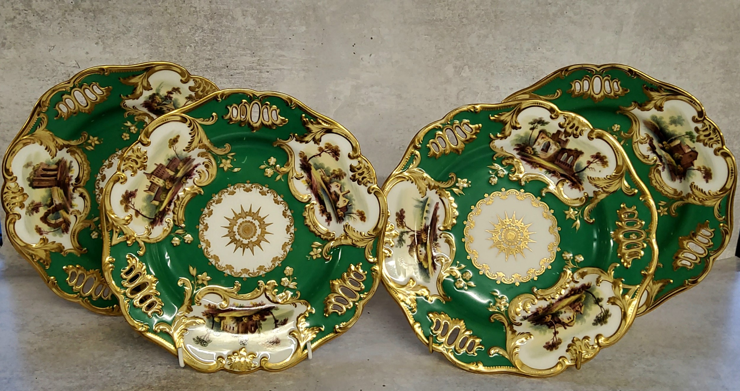 Four early 19th century wavy edge cabinet plates, possibly Minton, the apple green plates with central nautical compass type motif surrounded by intermitted hand painted Abbey scenes and rural farmsteads c.1930/40. Unmarked. 23.5cm diameter. Excellent condition.