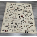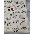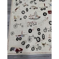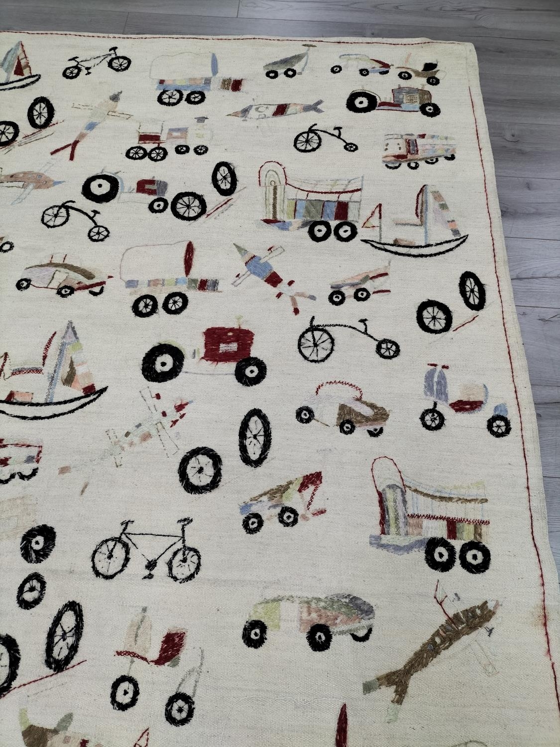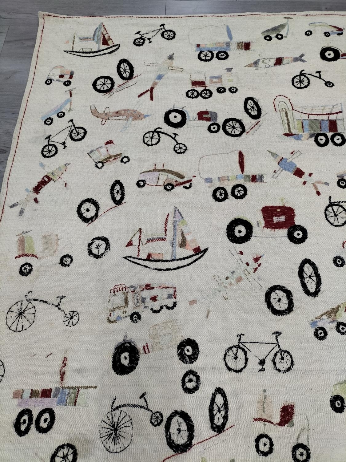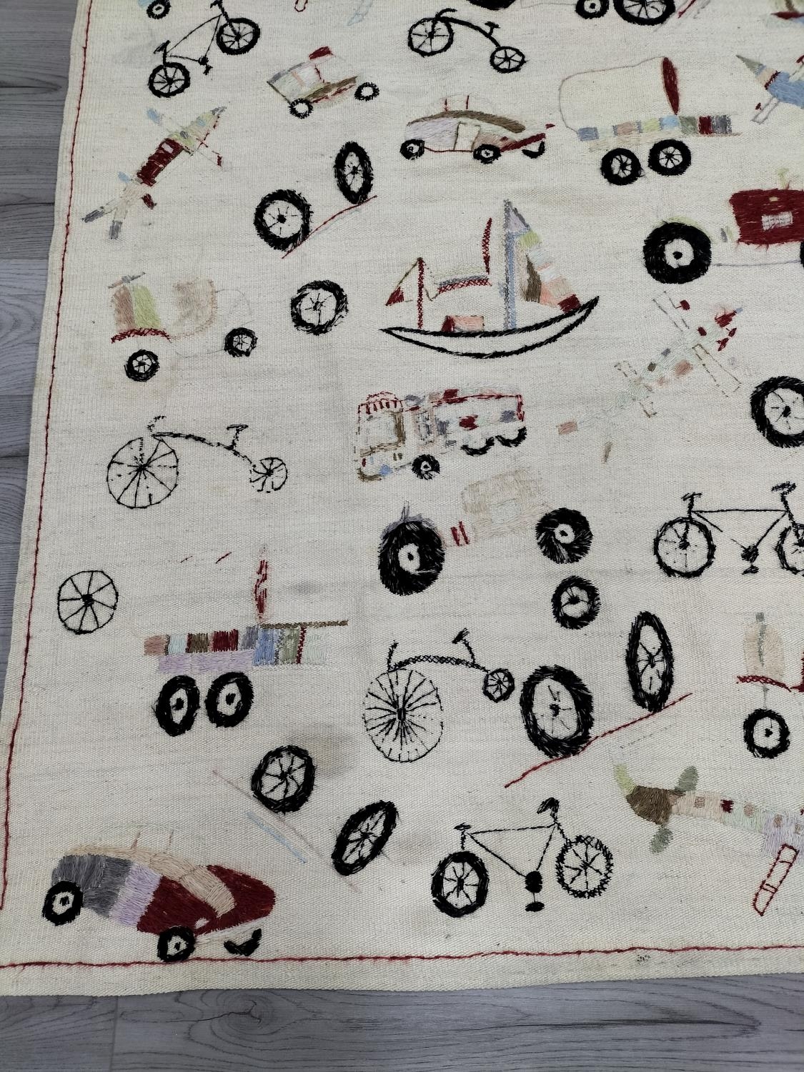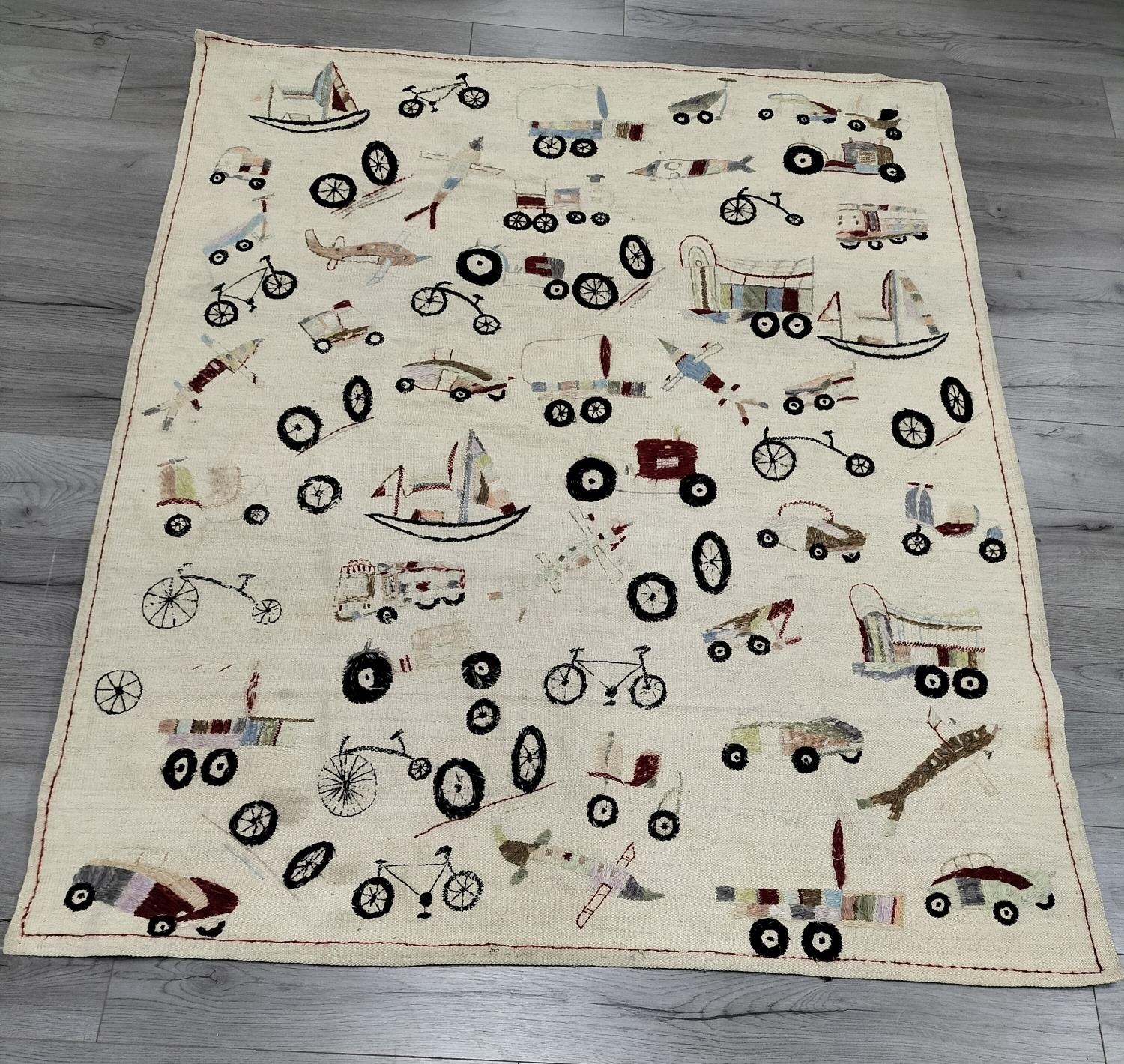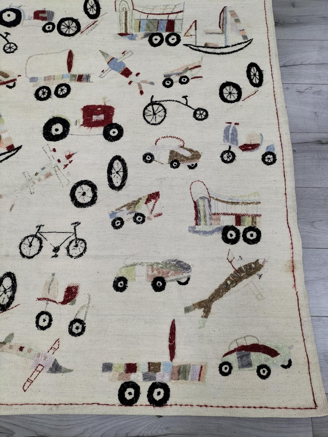 Floor Rug with Hand Stitched Transport Vehicles, Boats, Planes, etc. 156cm x 189cm.