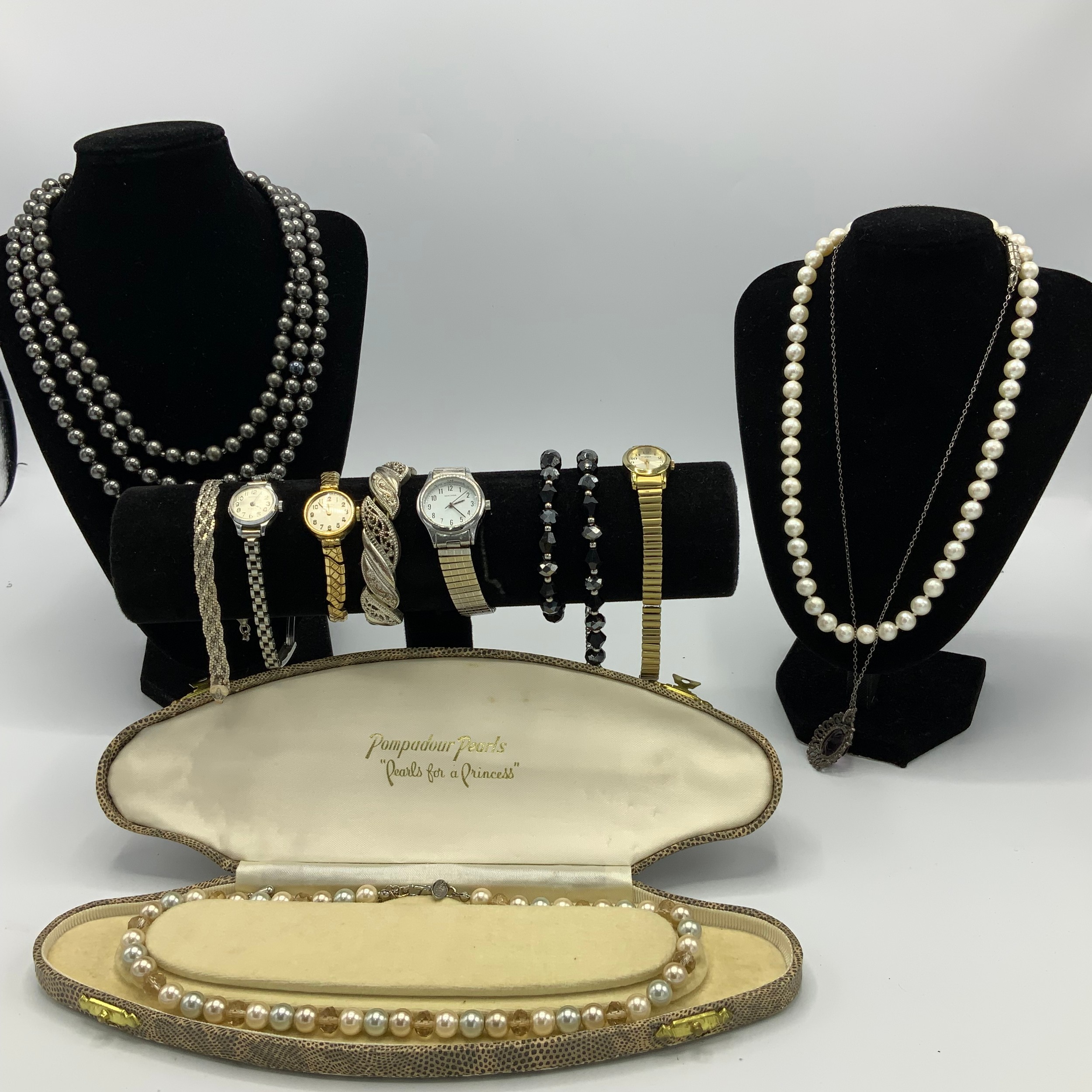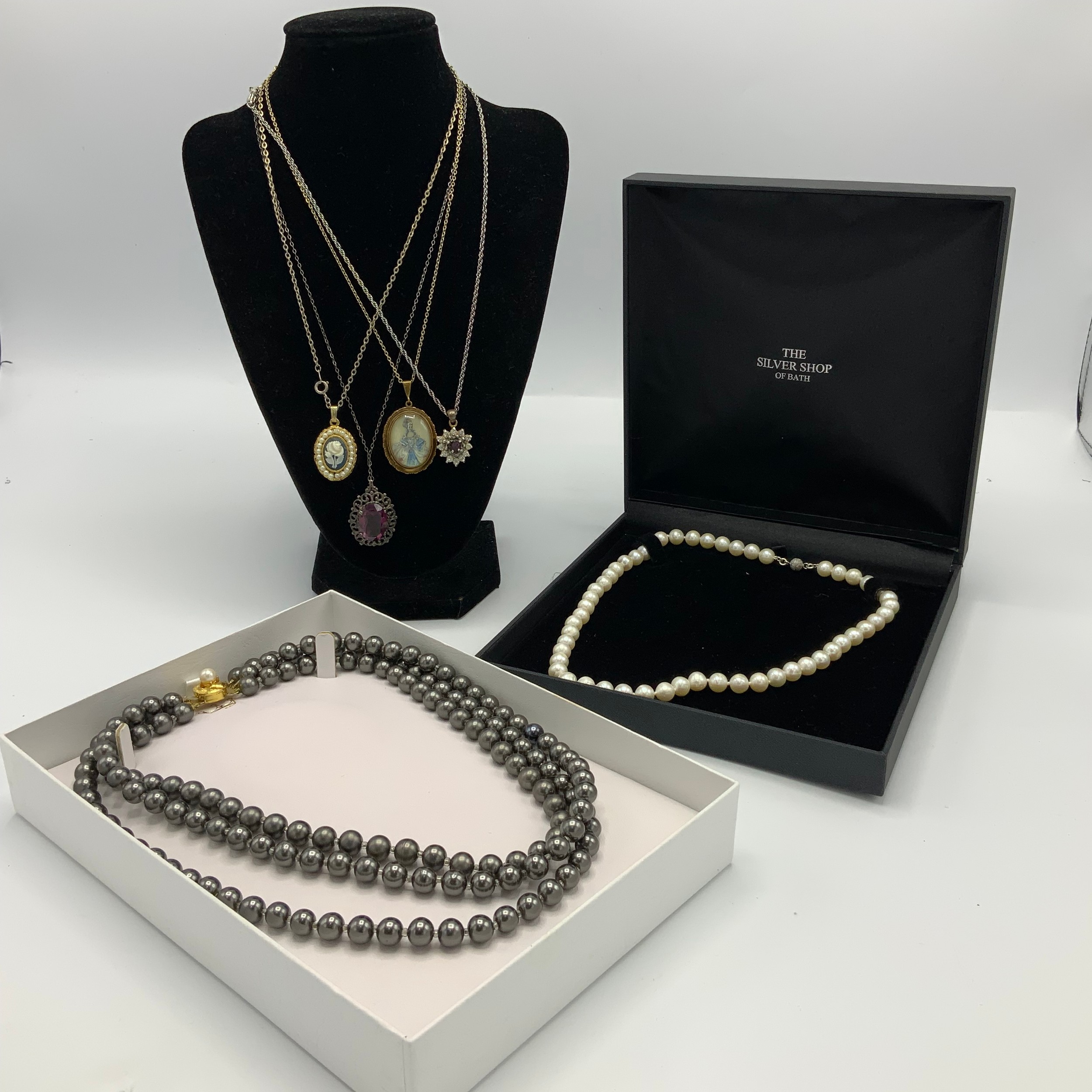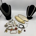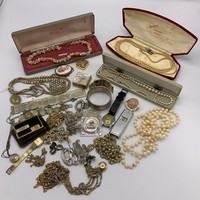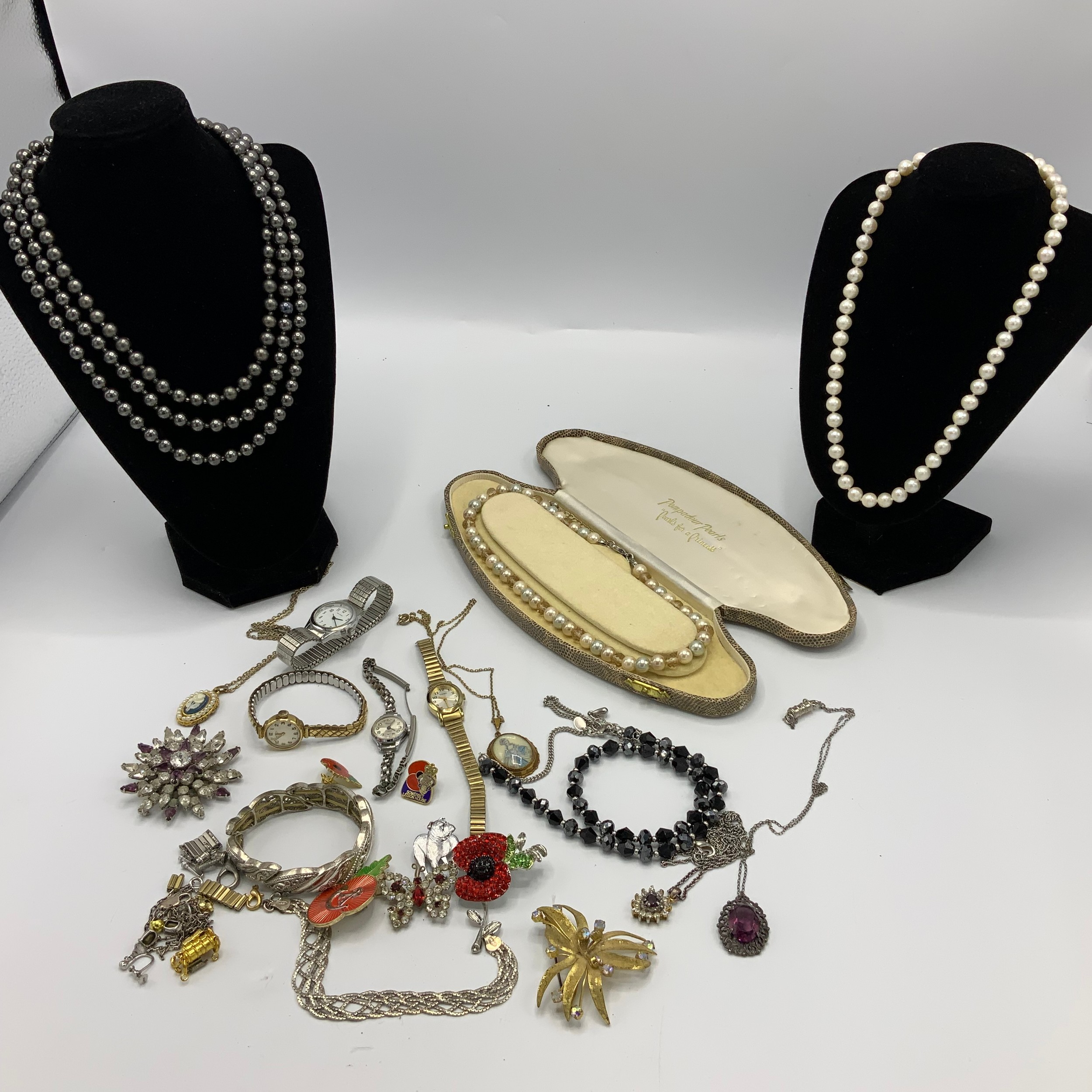 Costume jewellery, including The Silver Shop pearl necklace, watches, badges and other items.