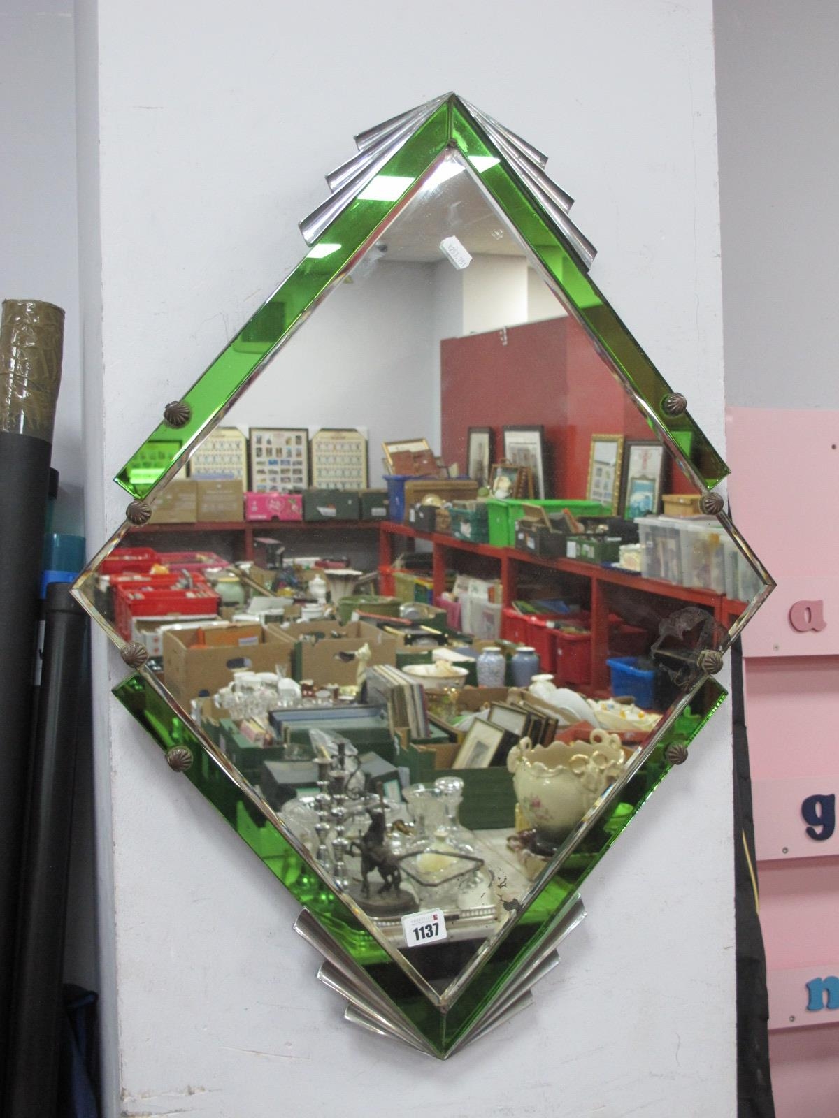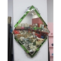 Art Deco Bevelled Wall Mirror, with chrome mounts to green glass corner strips, 55.5cm x 73.5cm.