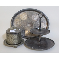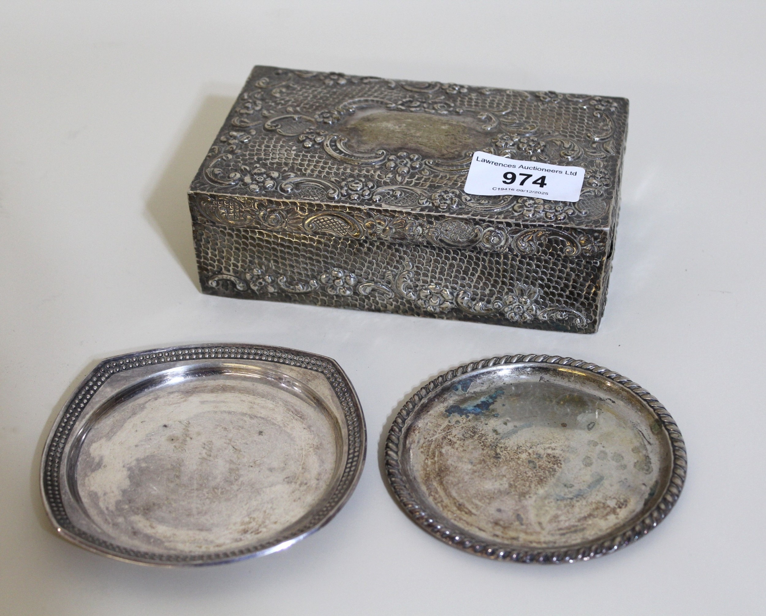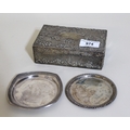 Rectangular floral embossed London silver cigarette case, together with two small Continental silver (835 mark) trinket dishes