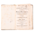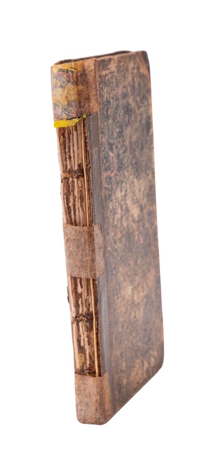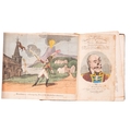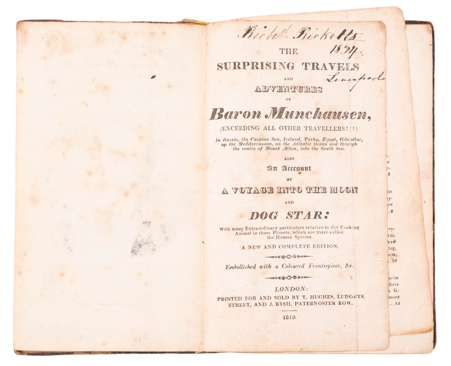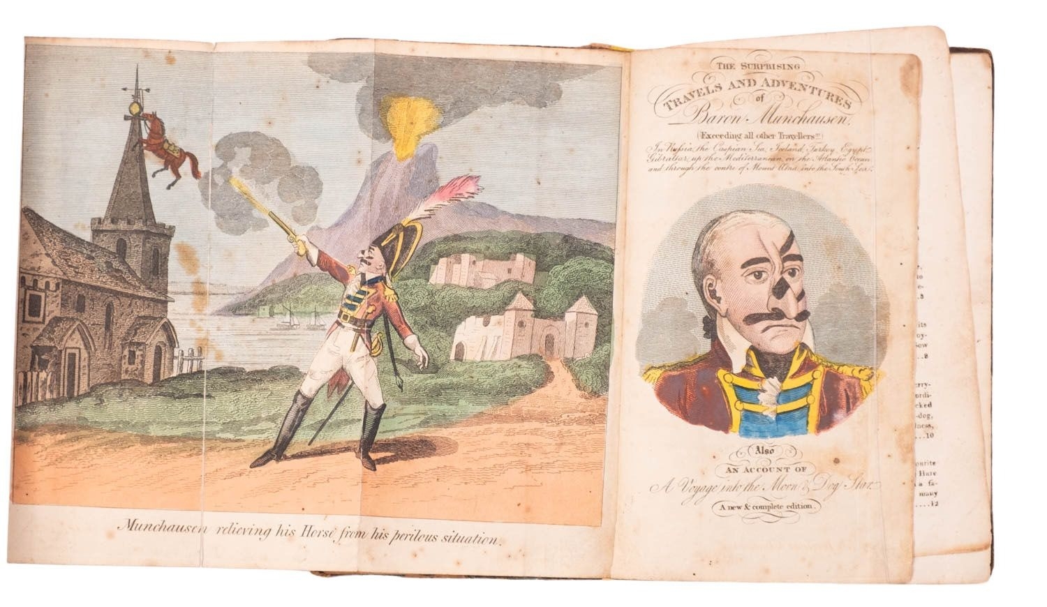 [RASPE, Rudolph Erich]. The Surprising Travels and Adventures of Baron Munchausen, ... Also an account of A Voyage into the Moon & Dog Star ... a new & complete edition, London: Printed for and sold by T. Hughes and J. Bysh, 1819, hand-col. folding engr. frontis. (old tape repairs), hand col. engr. title (contemp. ink ownership inscription), some spotting, loose leaves, contemp. marbled boards distressed, lacking backstrip (old tape repairs), 12mo.