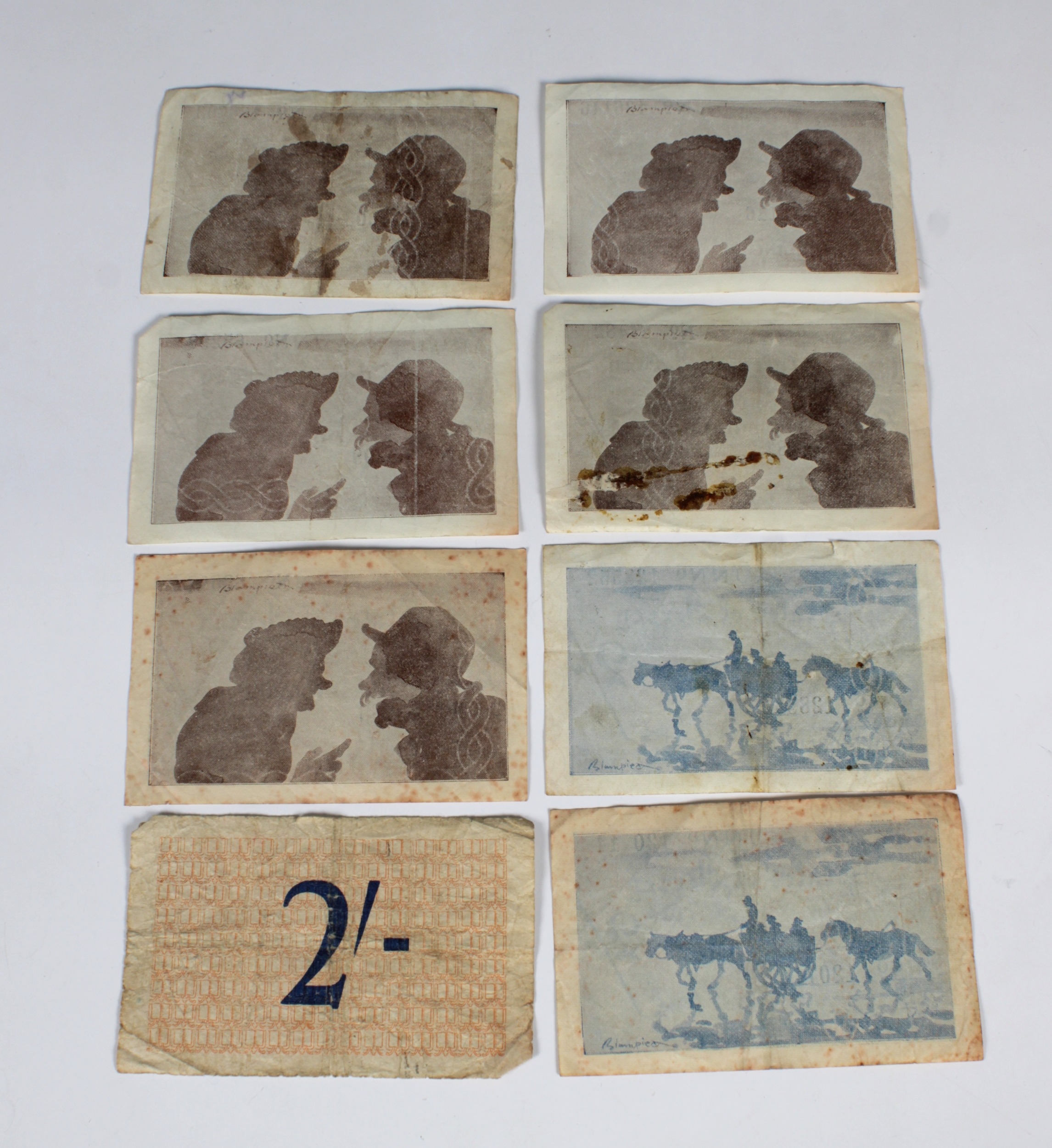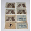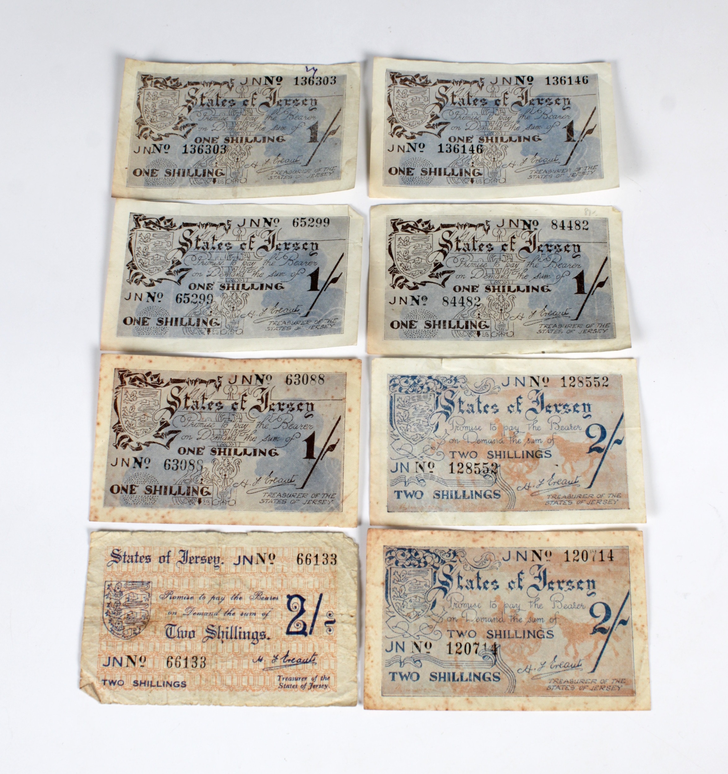A collection of Jersey German Occupation banknotes to include five (5) One Shilling banknotes, three (3) Two Shillings, both types, Signatory H. F. Ereaut, various numbers, fair / poor, spotting etc. (8)
