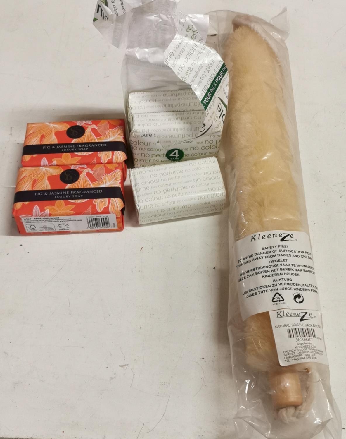 New Kleeneze natural bristle back brush, 3 x Simple and 2 x Sainsburys fig and jasmine soaps
