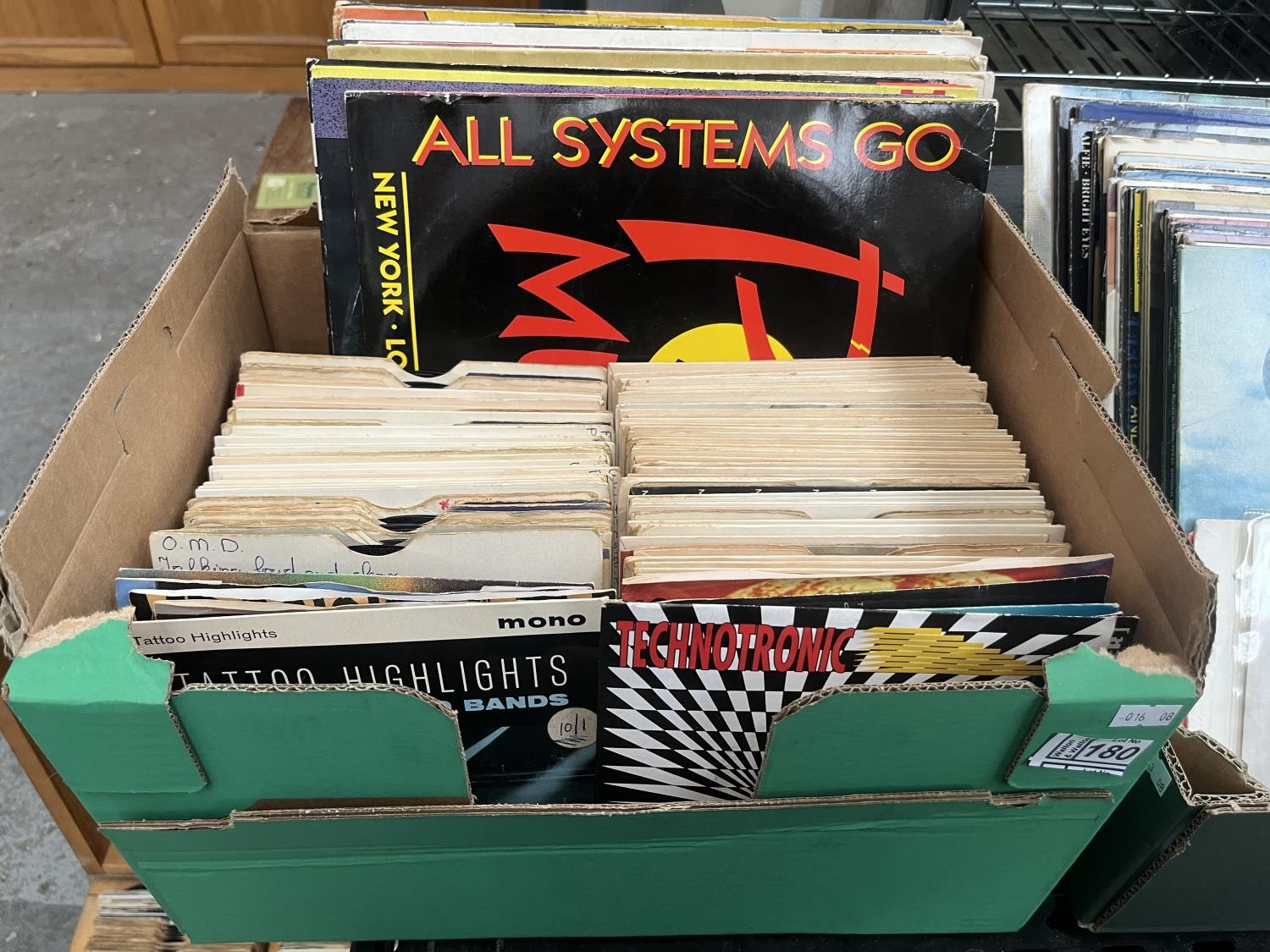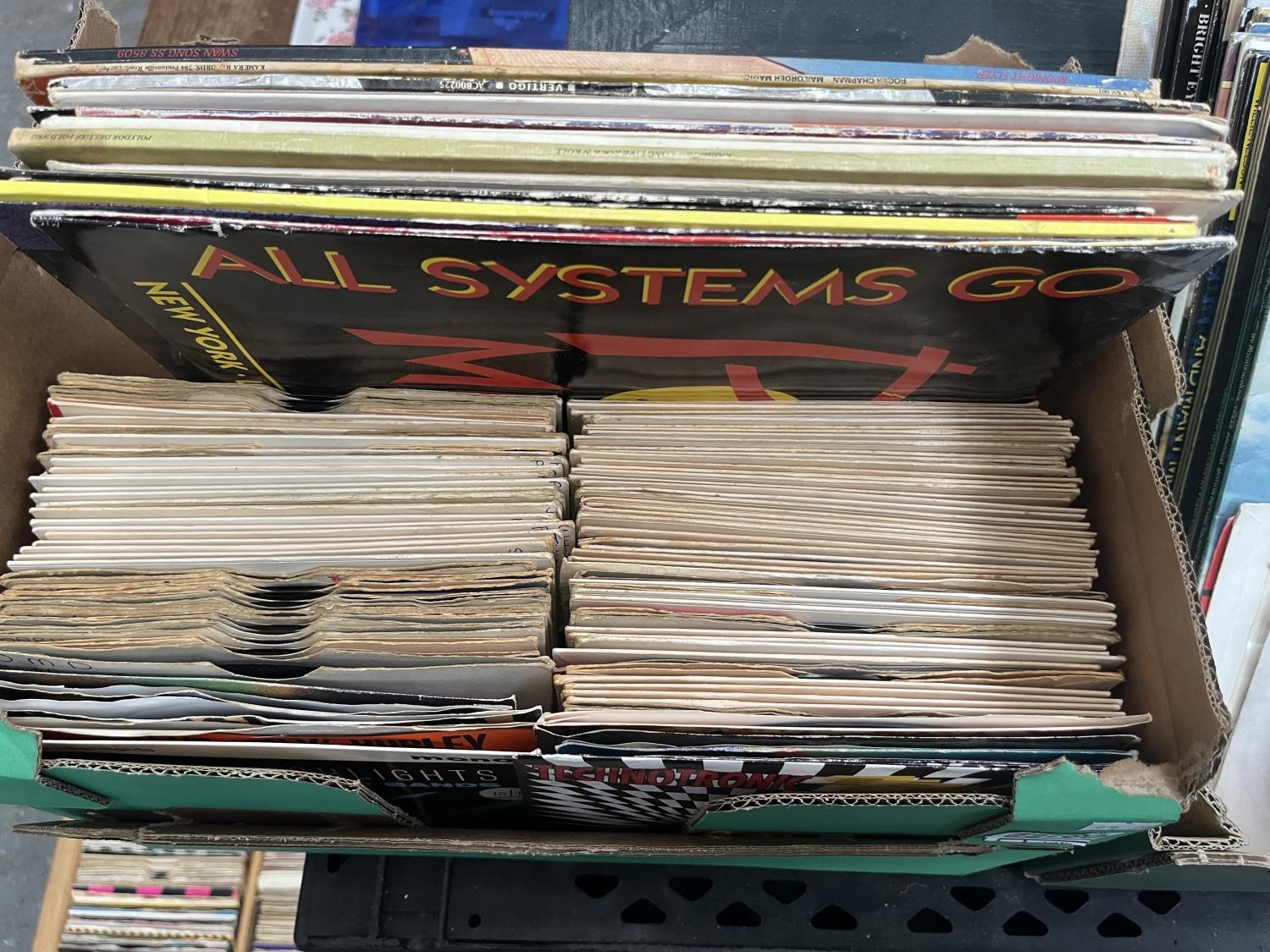 Box containing LPs and singles including Deep Heat and The Bunnies Of London