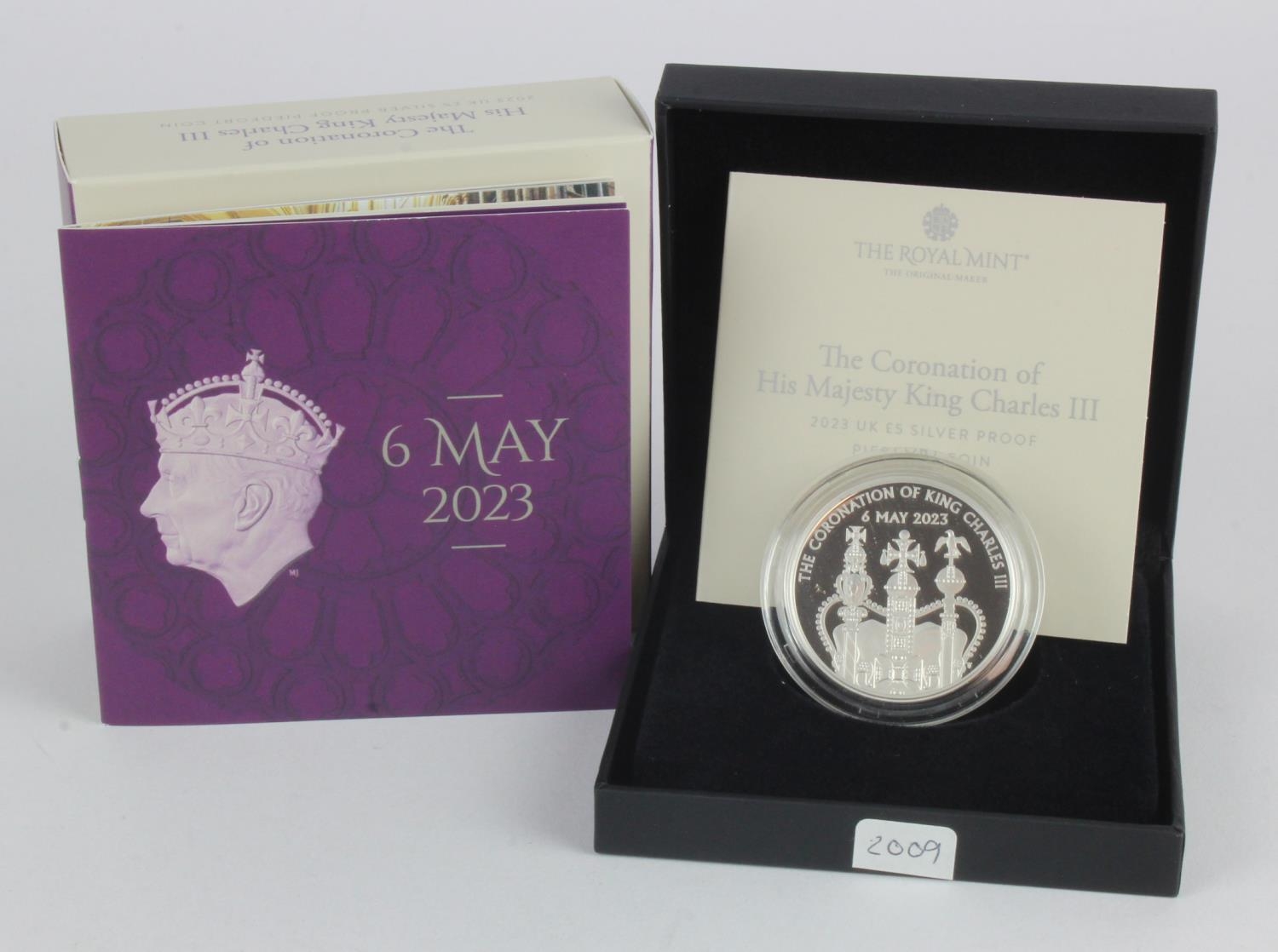 Five Pounds 2023 "Coronation of King Charles" Silver Proof Piedfort. FDC boxed as issued