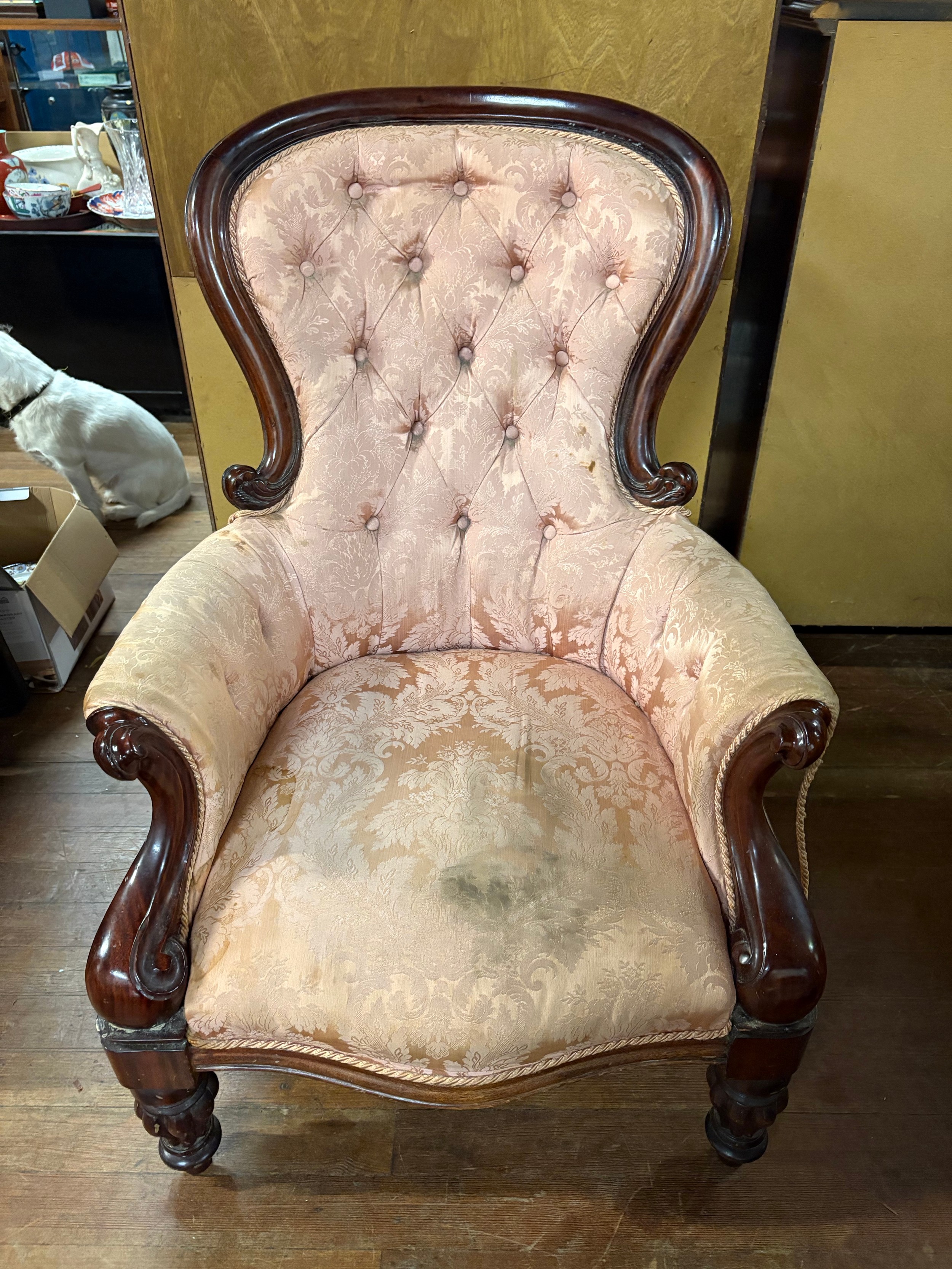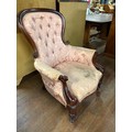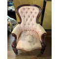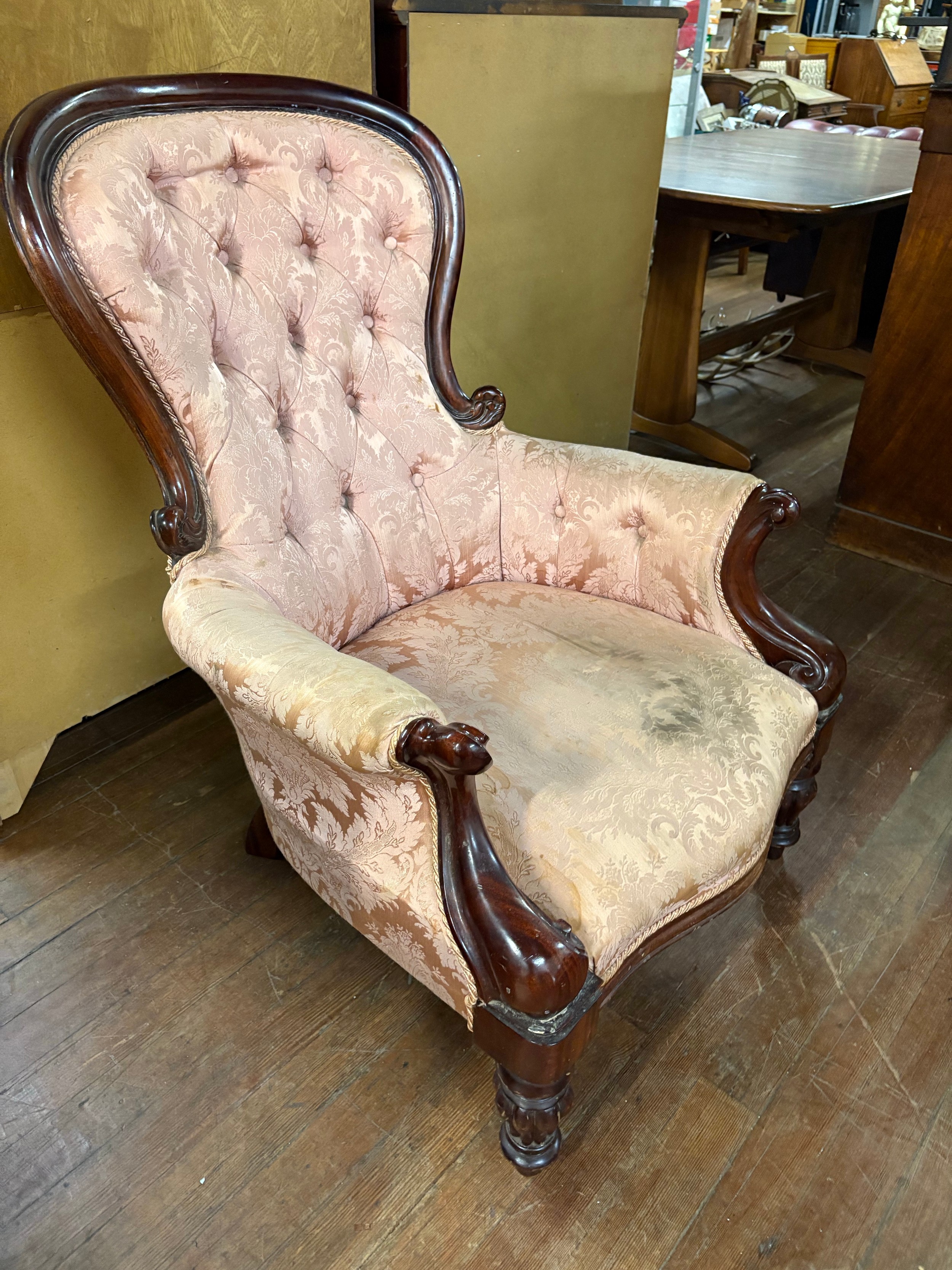 Victorian mahogany framed gentleman's arm chair with button back and carved supports (needs cleaned).