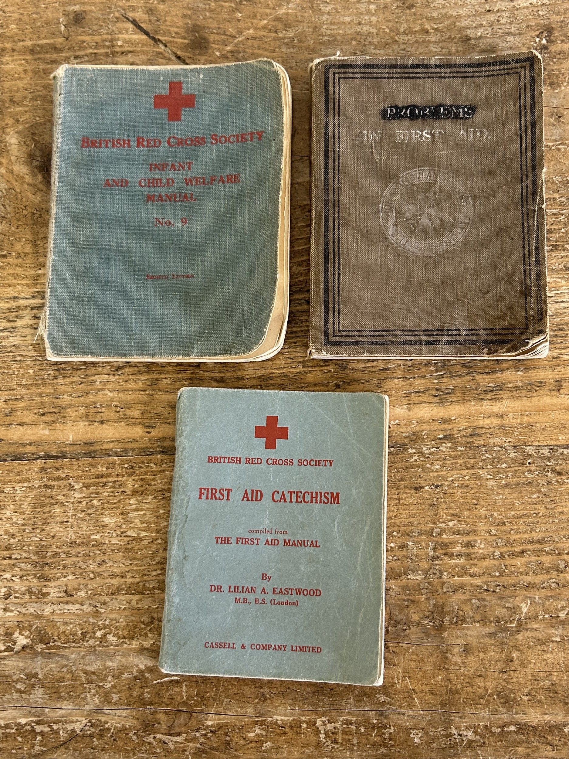 A selection of vintage postcards and Red Cross First Aid books