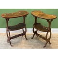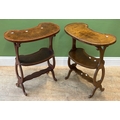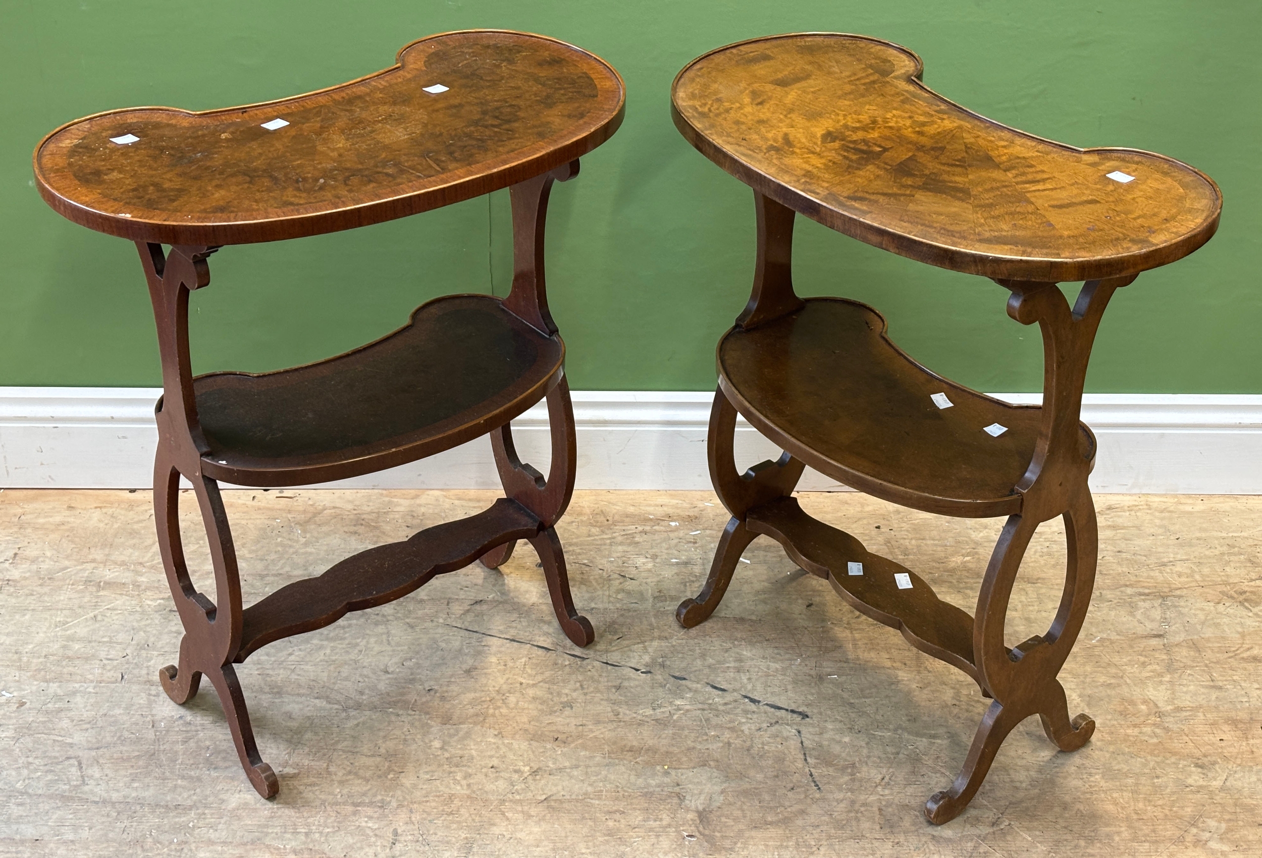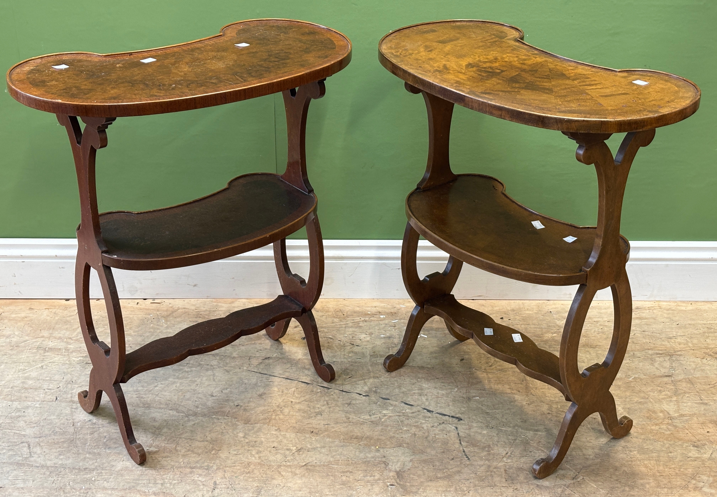 A pair of walnut veneer kidney shaped occasional tables with undershelf, 62cmW 70cmH