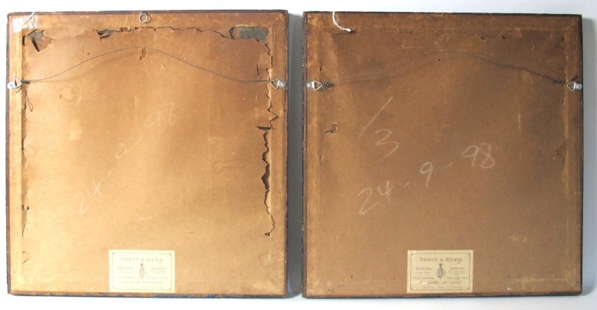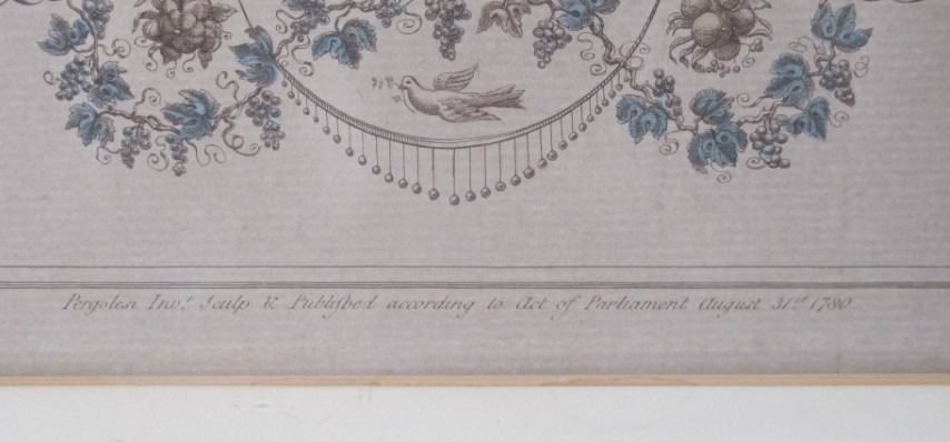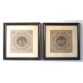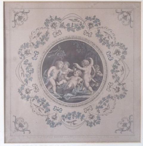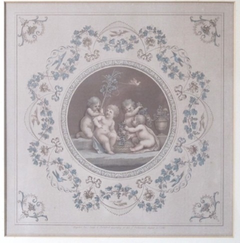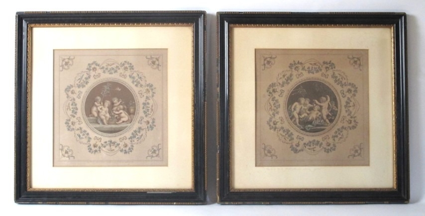 A pair of antique hand coloured engravings depicting figural putti in circular cartouches after the 18th century originals by Francesco Bartolozzi (1728-1815), both framed and glazed. 49x49cm (approx).