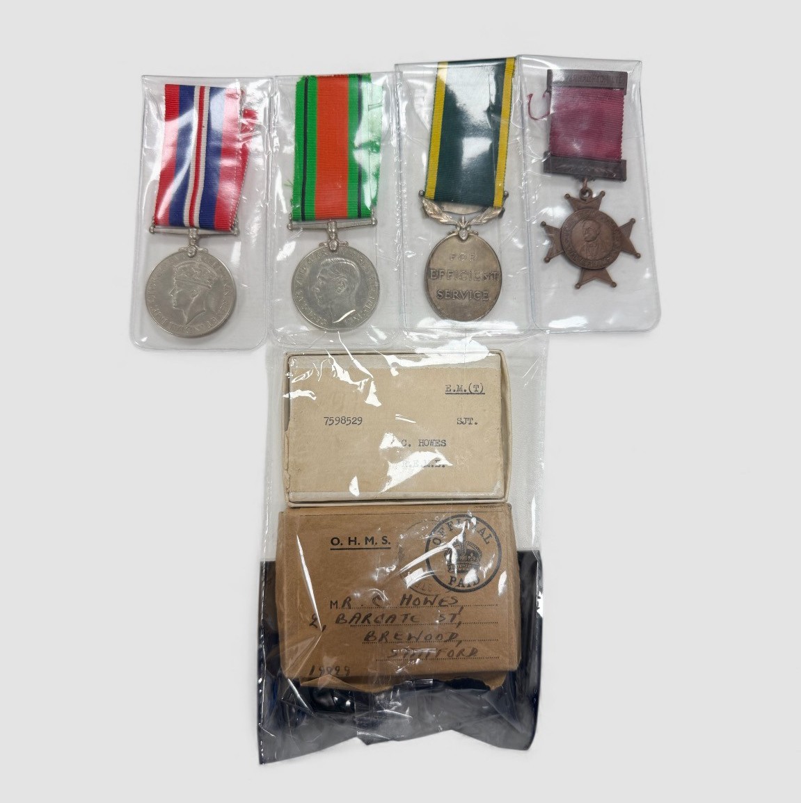Second World War, C. Howes, a Second World War medal group awarded to 7598529 SJT. C. HOWES. REME including War and Defence medals, Territorial Defence medal and John Thompson Wolverhampton medal. War & Defence with original boxes, ribbons.