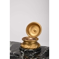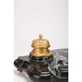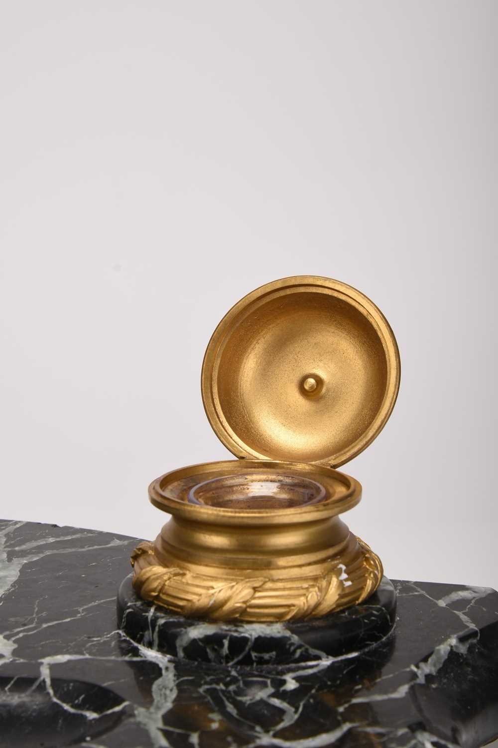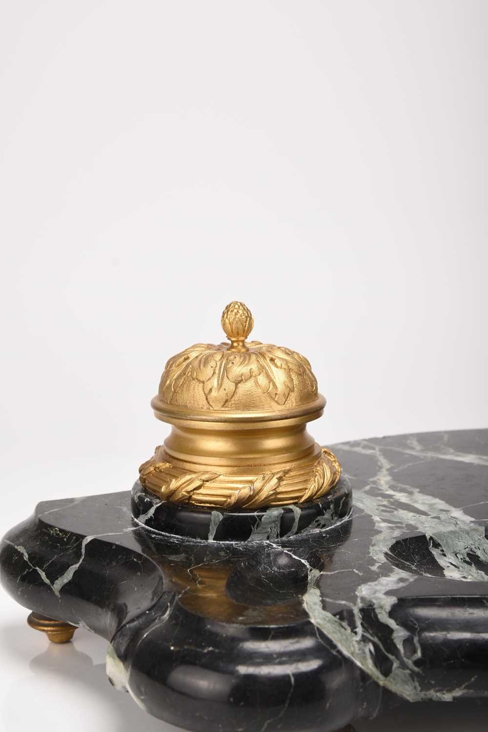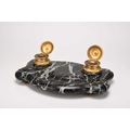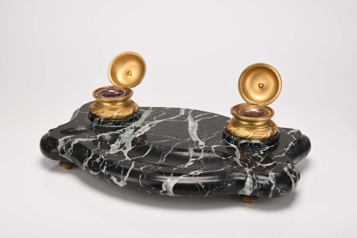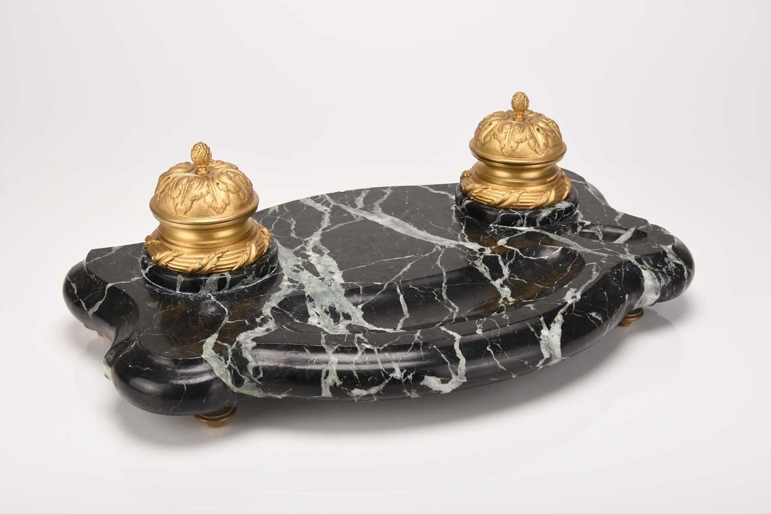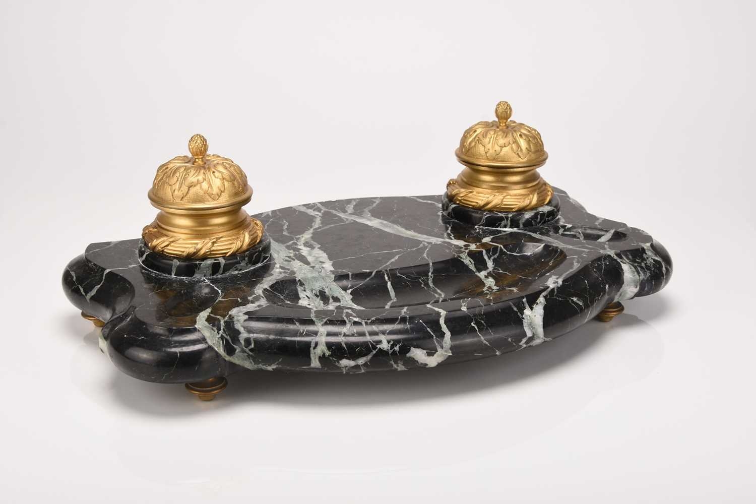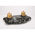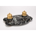 A marble and gilt metal desk standish, late 19th century The green-veined black marble base of serpentine form, inset with two gilt metal inkwells moulded with acanthus motifs and having glass liners, the whole raised on gilt metal toupie feet. 37cm wide